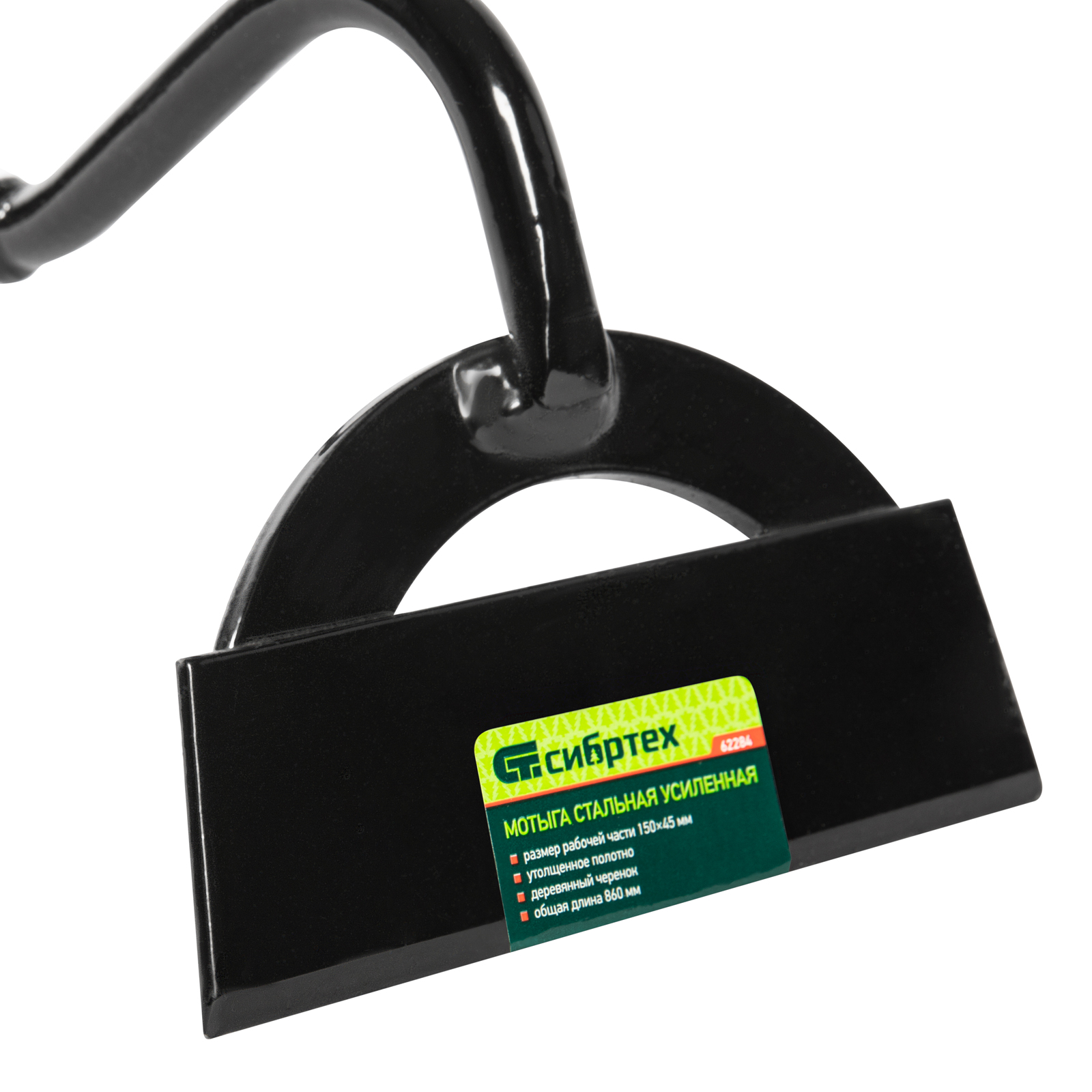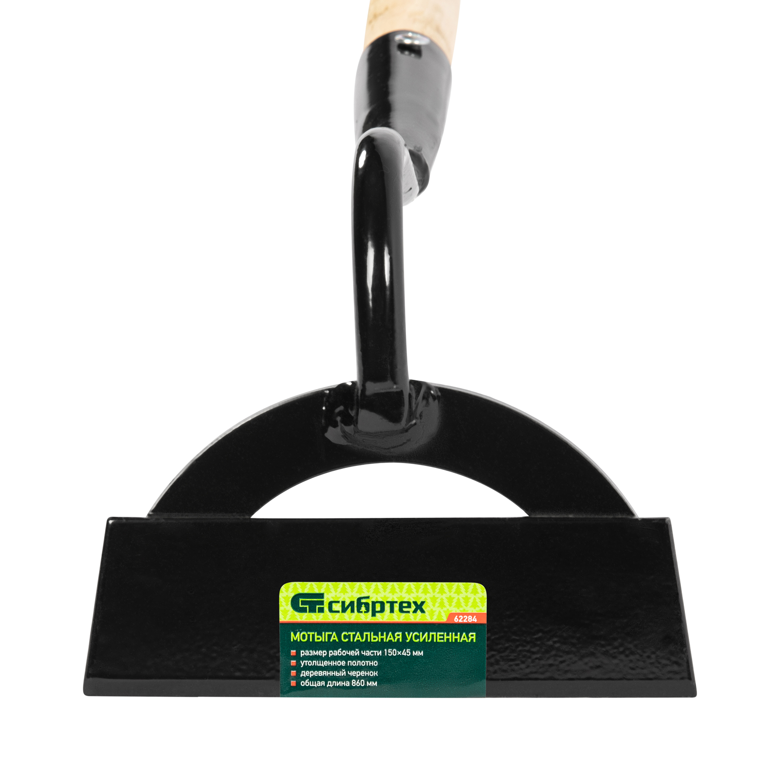 <p>Стальная усиленная мотыга Сибртех 62284 размером 150 х 45 х 860 мм, с деревянным черенком, — ручной инструмент для рыхления и прополки почвы, окучивания растений. Поставляется в сборе со шлифованным черенком из древесины твердых пород, обеспечивающим комфорт во время работы. Длина черенка 860 мм, поэтому мотыга очень удобна для работы в тесном пространстве, например, в парнике или теплице. Инструмент будет полезен владельцам дачных участков.</p><h2>Преимущества</h2><ul><li>Устойчивость к деформациям — полотно изготовлено из прочной среднеуглеродистой стали толщиной 2,5 мм.</li><li>Защита от коррозии — на полотно нанесена порошковая эмаль.</li><li>Надежность — благодаря сварному креплению полотно не отскочит от тулейки во время работы.</li><li>Крепкое соединение — черенок зафиксирован в тулейке саморезом.</li></ul>