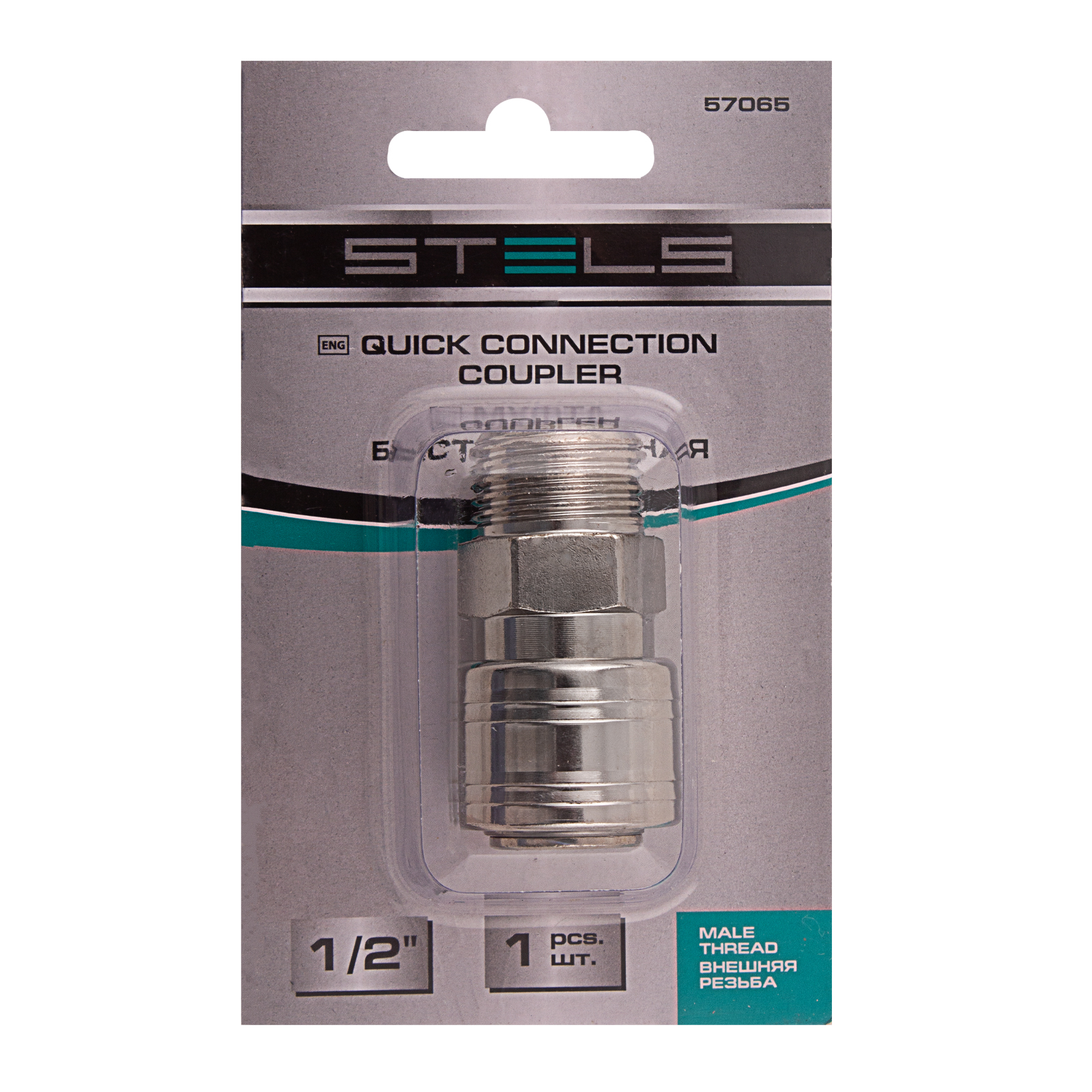 Универсальная быстросъемная муфта Stels 57065 с внешней резьбой 1/2 дюйма, 1 шт. в упаковке, позволяет герметично подключить пневматический шланг к компрессору со входом «мама». Используется для работы с пневмооборудованием, будет полезна во время ремонта, на строительной площадке и в гараже.