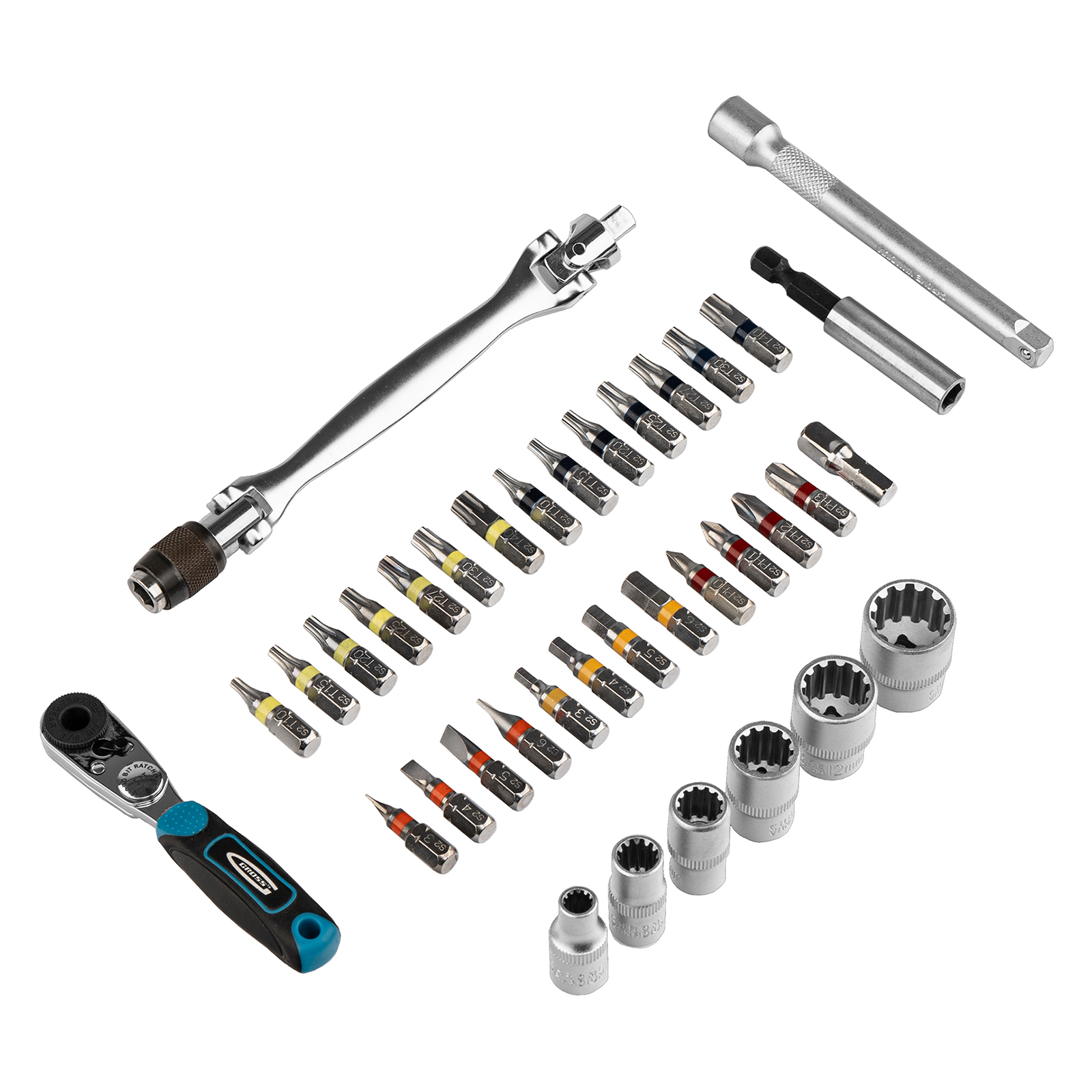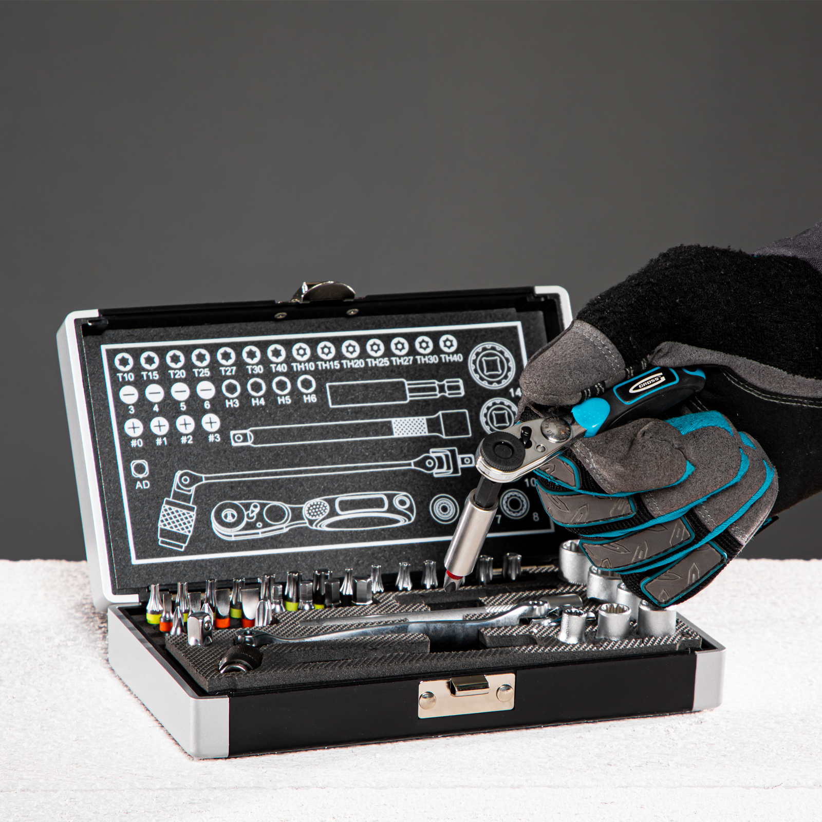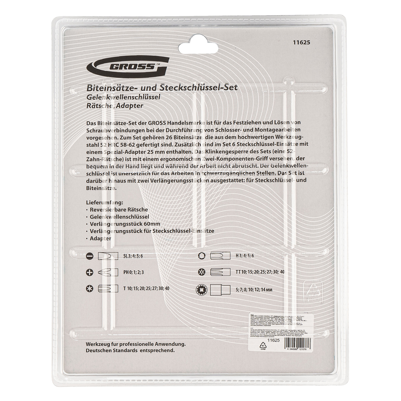Набор Gross 11625 подходит для широкого спектра слесарно-монтажных работ, т.к. включает в себя 37 предметов из стали S2: трещотку, адаптер, карданный ключ, торцевые головки и биты с хвостовиком 1/4 дюйма. В комплекте биты следующих размеров: PH 0-3, Sl 3-6, TORX и ТТ 10, 15, 20, 25, 27, 30, 40, HEX 3-6, а также торцевые головки 5 мм, 7 мм, 8 мм, 10 мм, 12 мм, 14 мм. Набор используется для монтажа и демонтажа резьбовых крепежей. Пригодится во время сборки мебели, ремонта техники, а также дома или в гараже.