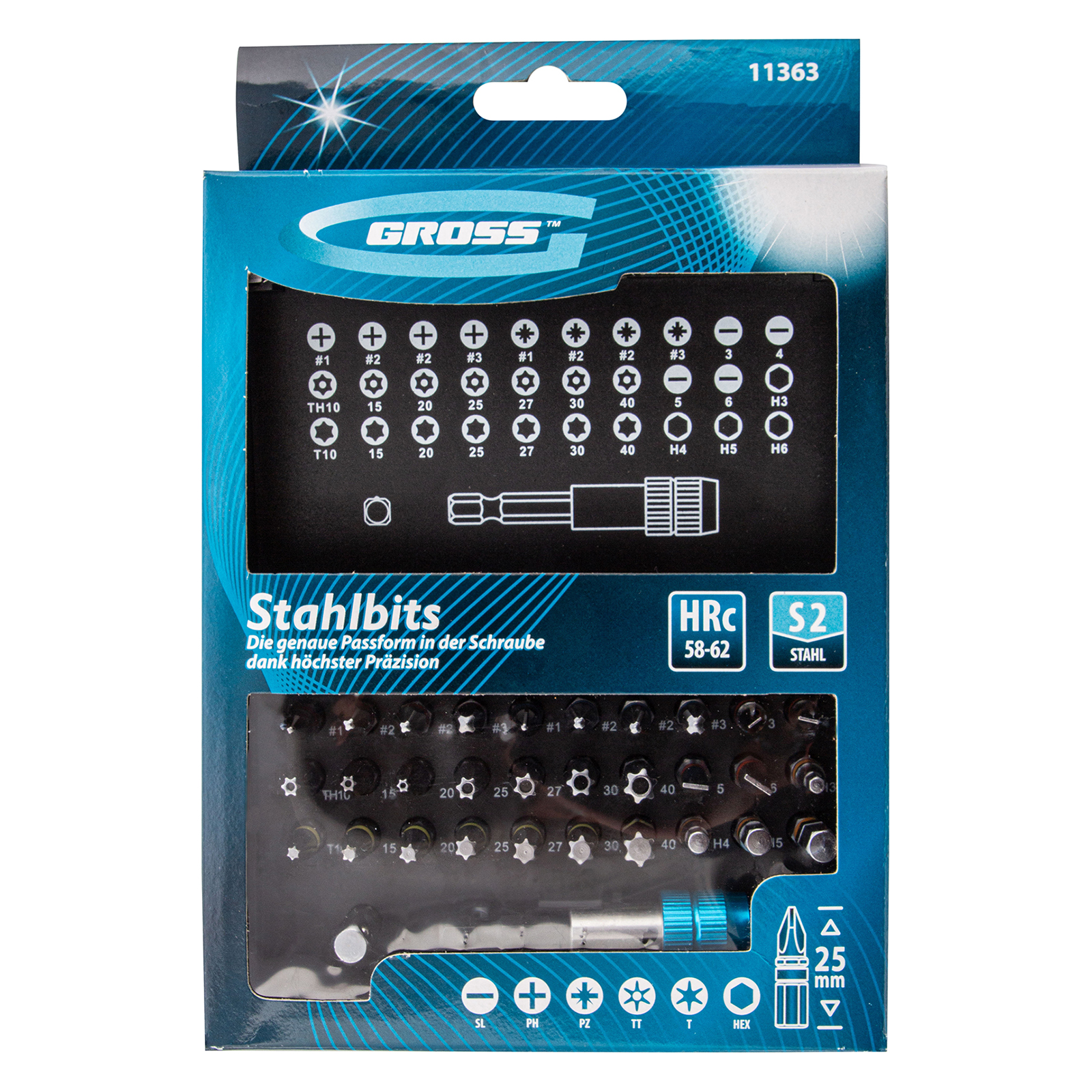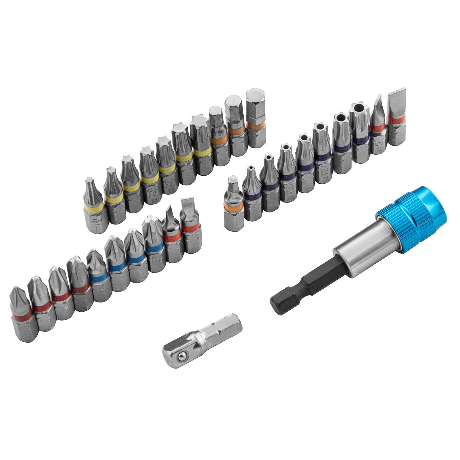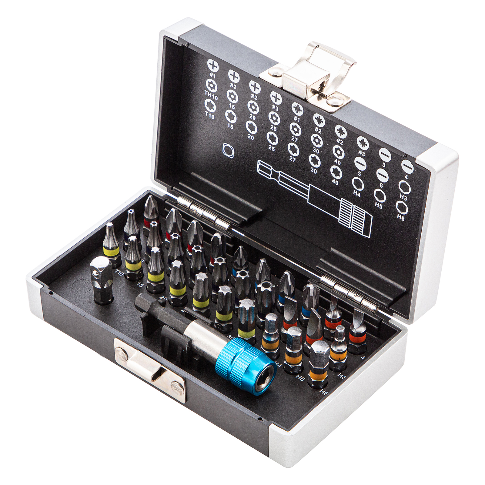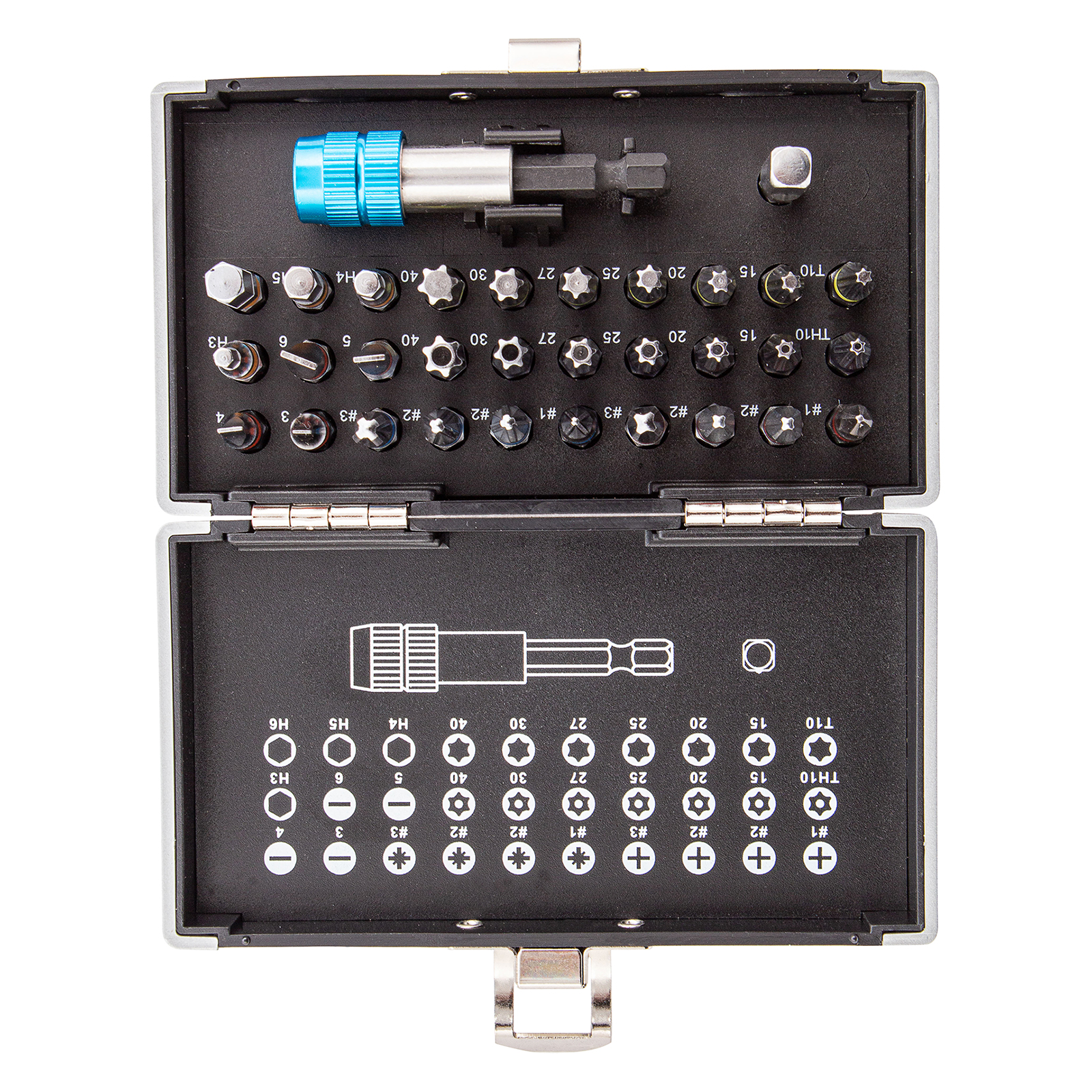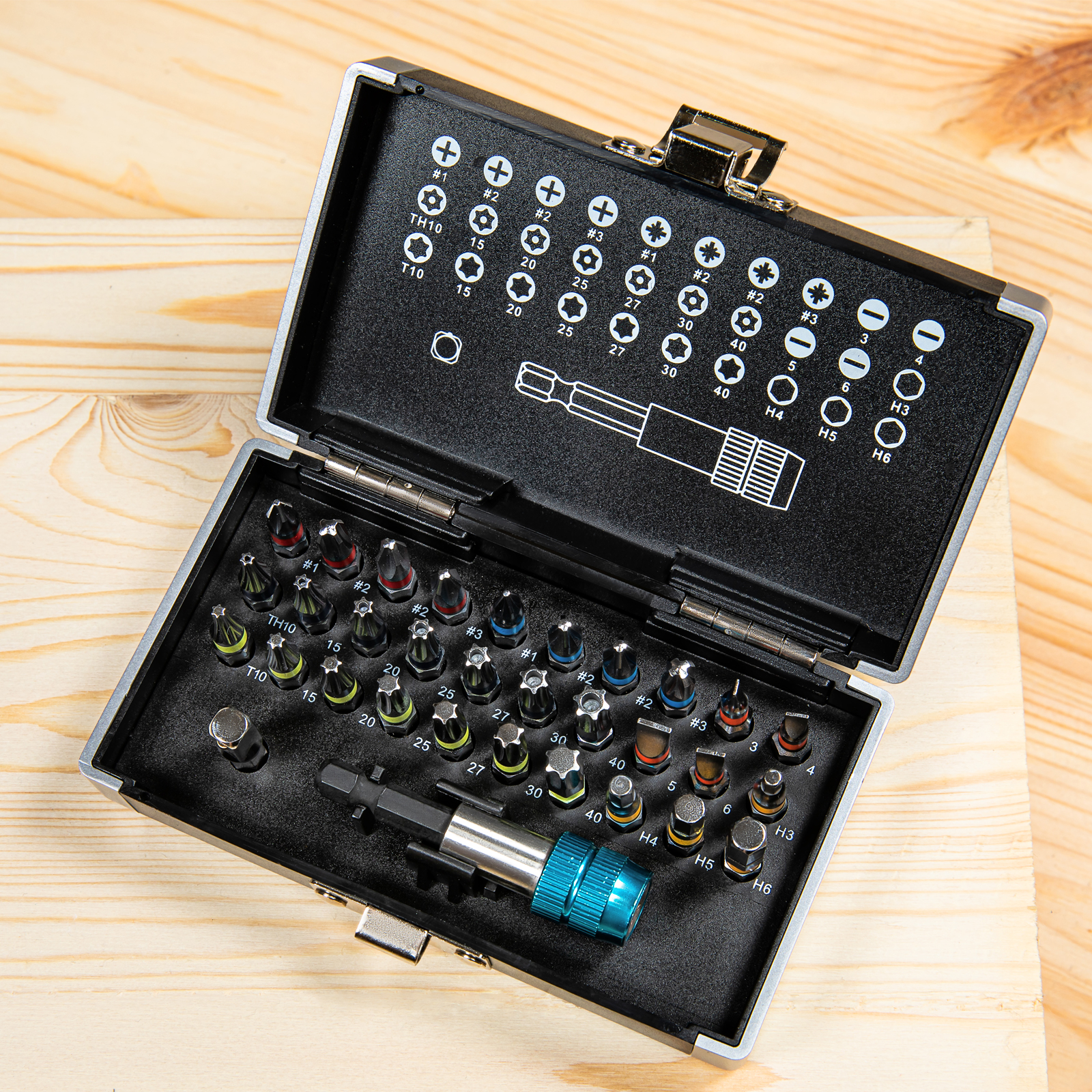 Широкая комплектация — в одном наборе представлено 6 типов бит: PH и PZ калибров 1-3, SL калибров 3, 4, 5, 6, TORX и TORX Tamper (10, 15, 20, 25, 27, 30, 40), HEX 3-6