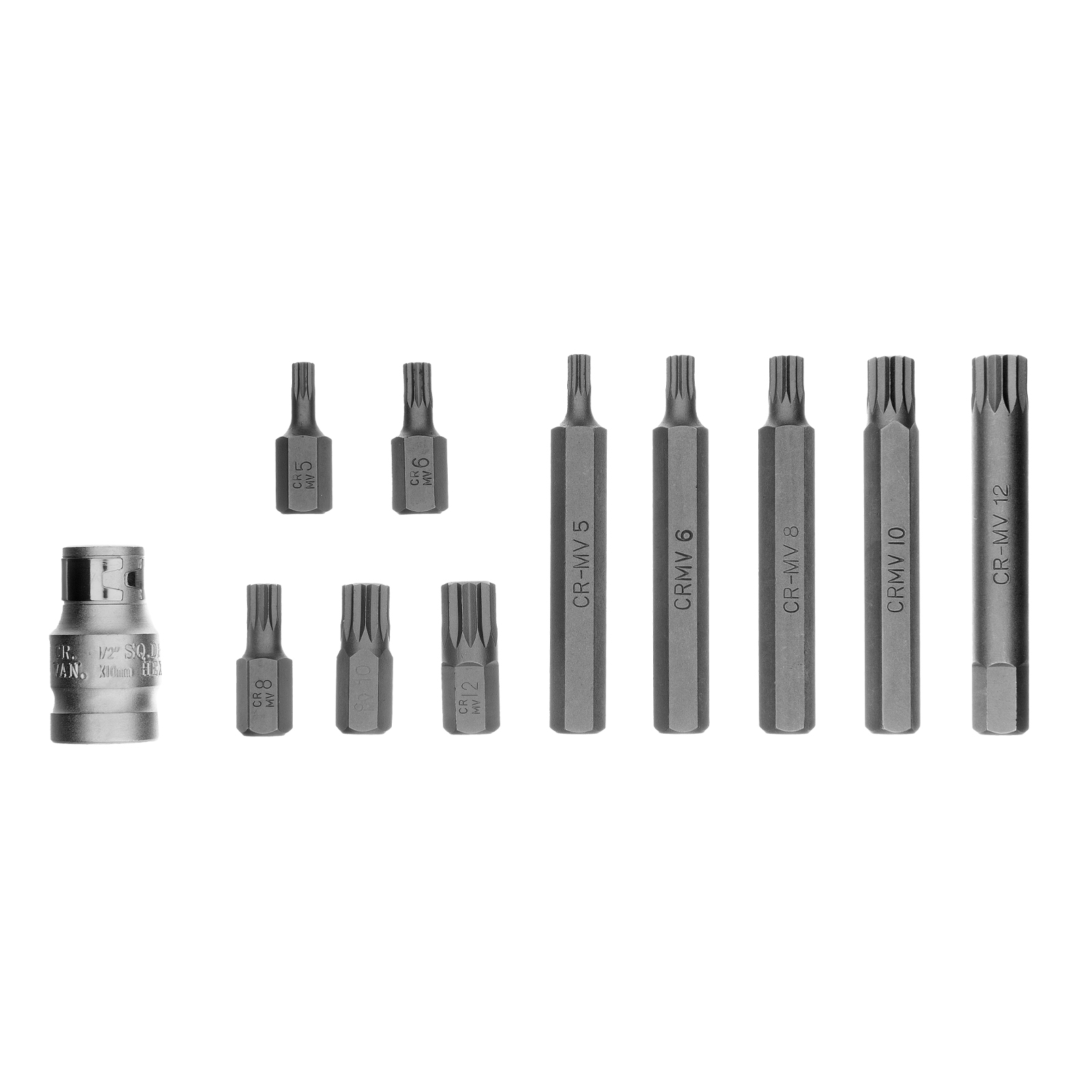 Набор Stels 11312 включает 11 предметов: 10 бит SPLINE из стали CrV, с шестигранным хвостовиком 1/2 дюйма, и переходник. Биты со шлицами в виде 12-лучевых «звезд» используются для монтажа и демонтажа резьбовых соединений с головками SPLINE М5, М6, М8, М10 и М12. Набор будет полезен в автомобильном производстве, на станции техобслуживания, в гараже для выполнения работ, требующих максимального усилия затяжки.