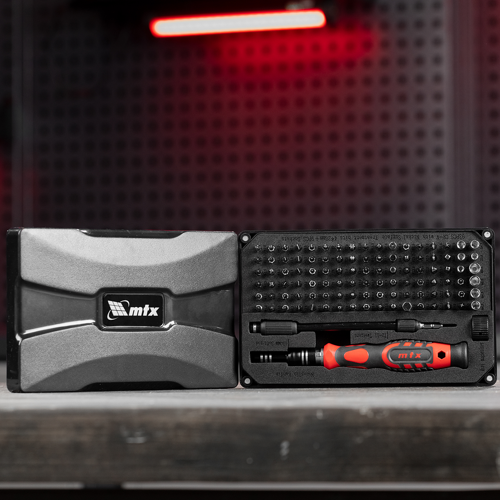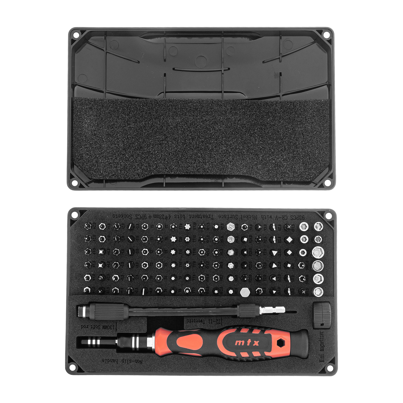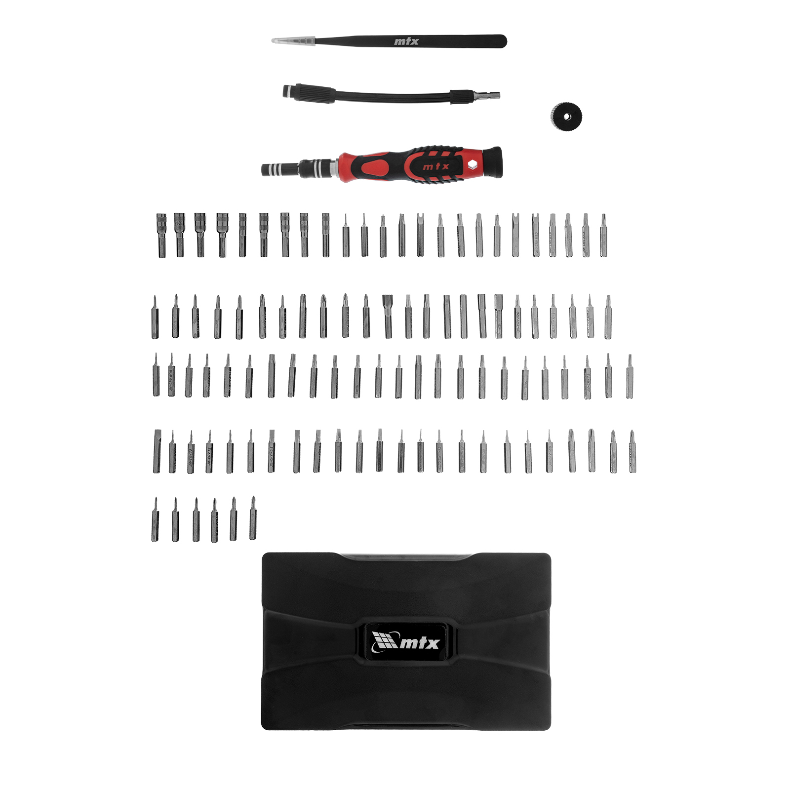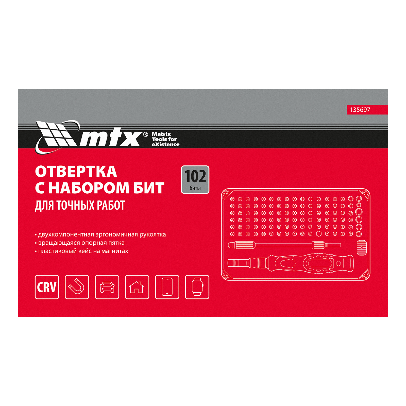 Набор для точных работ MTX 135697 включает в себя 93 биты, 9 торцевых головок, телескопический и гибкий удлинители, намагничиватель-размагничиватель бит, отвертку и пинцет с защитным колпачком. С его помощью можно отремонтировать очки, игрушки, портативную и бытовую технику и т.д. Выдвижной стержень, гибкий удлинитель и пинцет позволяют работать с мелкими деталями в углублениях и труднодоступных местах.