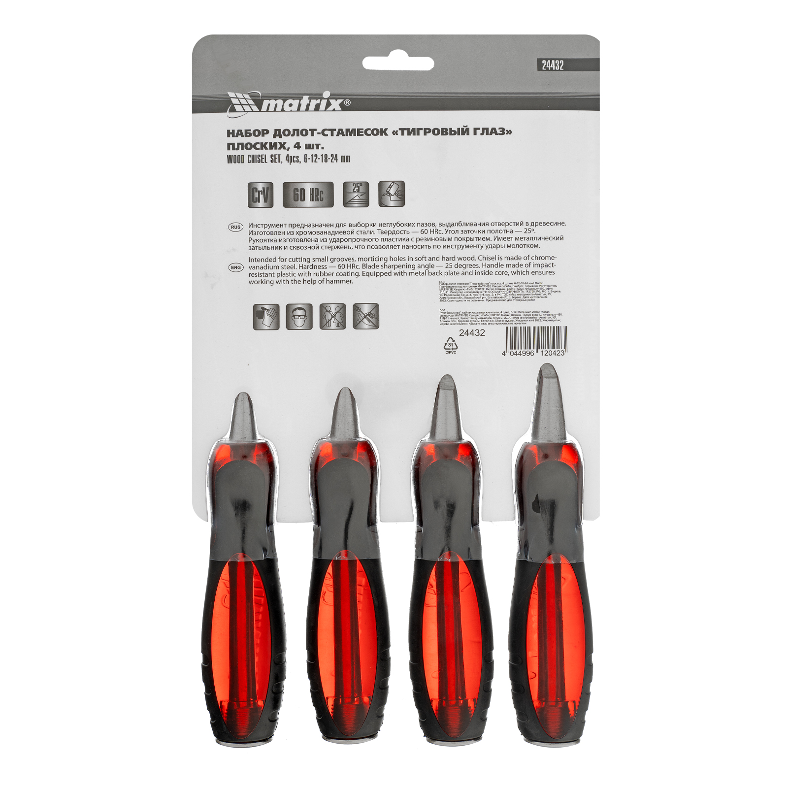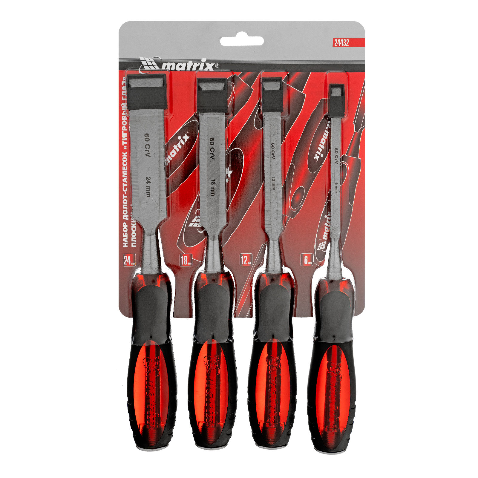 Набор долот-стамесок плоских Matrix «Тигровый глаз» 24432, 4 штуки размером 6-12-18-24 мм, используется для обработки древесины любых пород. Стамески позволяют выбирать пазы, проделывать выемки, снимать фаски, выдалбливать отверстия разной ширины. Рукоятки из ударопрочного пластика имеют металлический затыльник и выдерживают удары киянкой или молотком для легкого врезания в древесину любой твердости. Набор пригодится столярам, плотникам и мебельным мастерам.