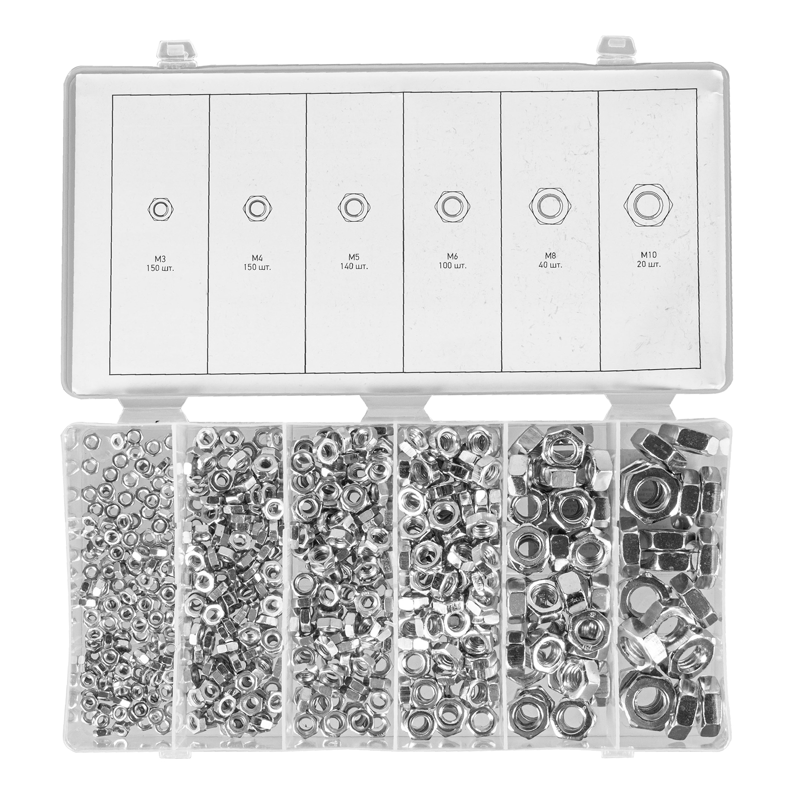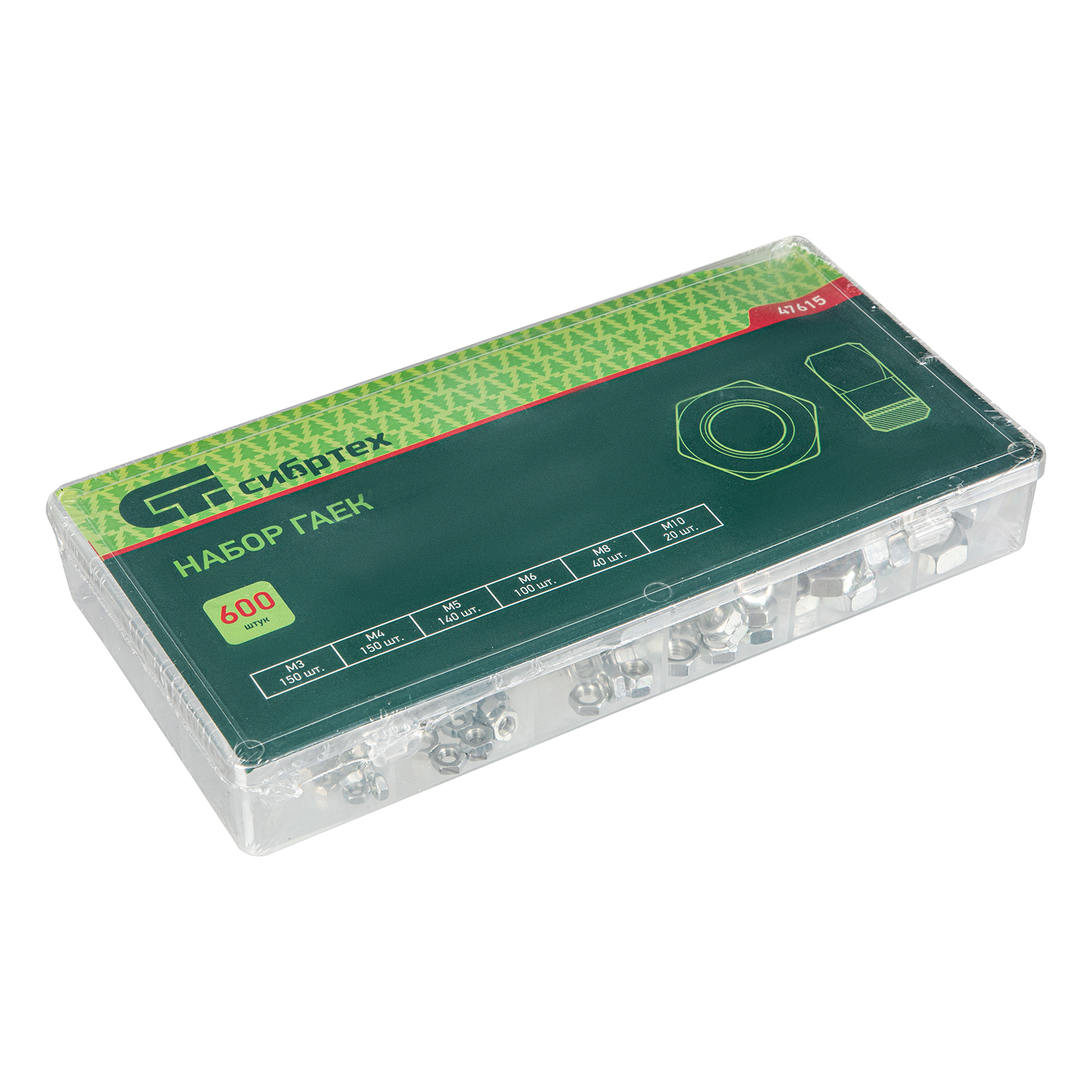 <p>Набор гаек Сибртех 47615 включает в себя 600 предметов размером М3, М4, М5, М6, М8 и М10. Они применяются с болтами, винтами и шпильками, образуя крепкие соединения. Набор пригодится для сборки мебели, ремонта бытовой техники и электроники, при проведении сантехнических работ, устройстве ограждений, а также будет полезен в домашнем хозяйстве.</p><h2>Преимущества</h2><ul><li>Прочность и коррозионная стойкость — гайки изготовлены из стали и оцинкованы.</li><li>Решение широкого спектра задач — в набор включены метизы самых распространенных размеров.</li><li>Быстрый поиск нужного крепежа — пластиковый кейс разделен на отсеки для гаек разного размера.</li></ul>