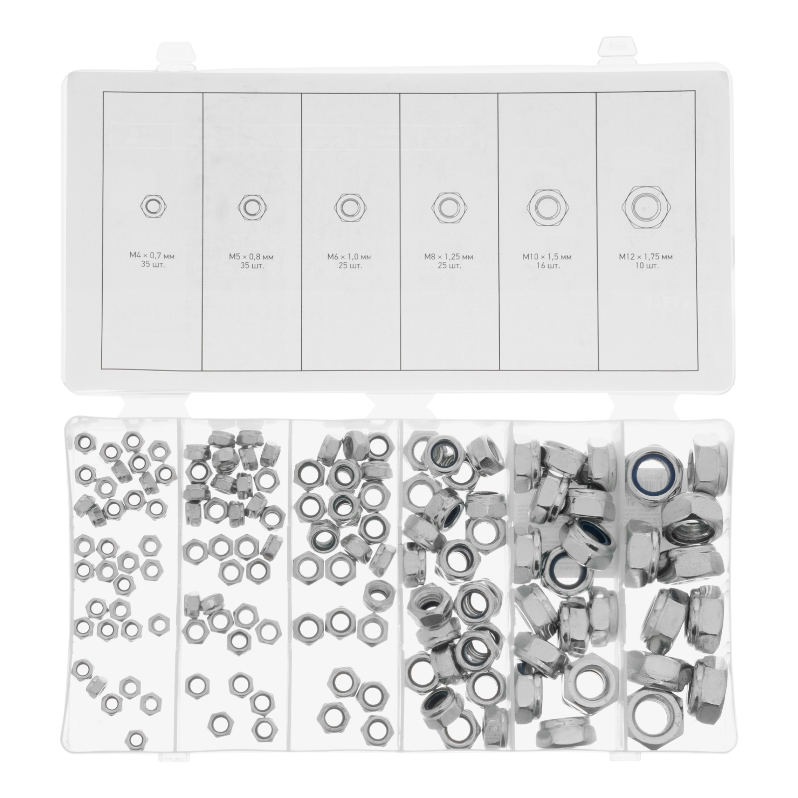 <p>Набор Сибртех 47613 состоит из 146 самоконтрящихся гаек наиболее распространенных размеров: М4, М5, М6, М8, М10 и М12. Совместно с болтами, винтами или шпильками они образуют надежные соединения. Используются в строительстве, машино- и автомобилестроении, для сборки мебели, бытовой техники и электроники. Также набор пригодится в домашнем хозяйстве.</p><h2>Преимущества</h2><ul><li>Надежная фиксация — гайки снабжены нейлоновой вставкой, которая предотвращает самооткручивание под воздействием вибраций, динамических и ударных нагрузок.</li><li>Прочность и долговечность — все элементы изготовлены из стали и оцинкованы для защиты от коррозии.</li><li>Быстрый поиск нужной гайки — набор упакован в пластиковый кейс, разделенный на отсеки в соответствии с размерами крепежных изделий.</li></ul>