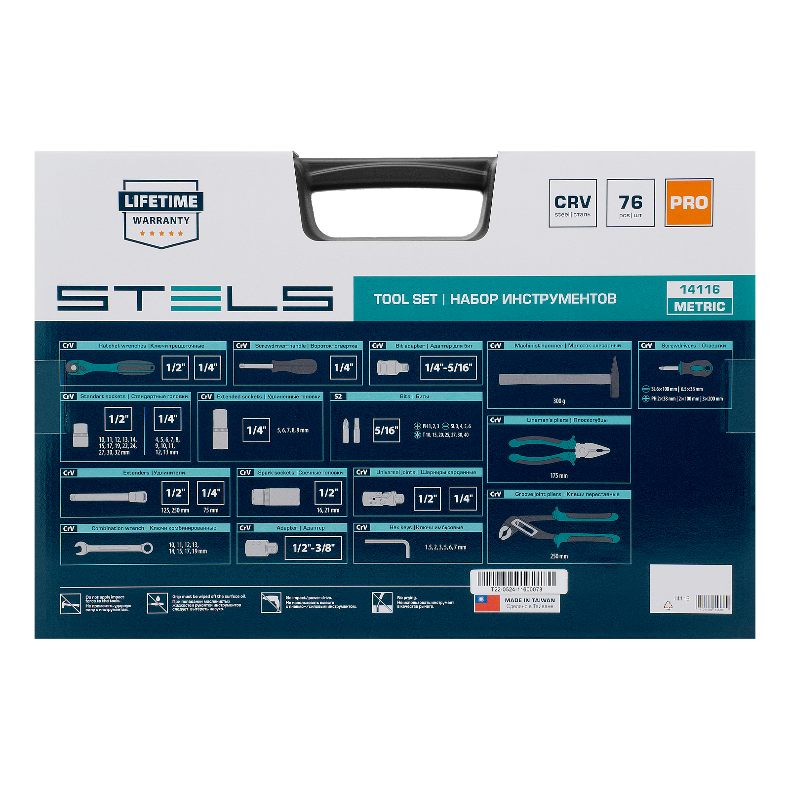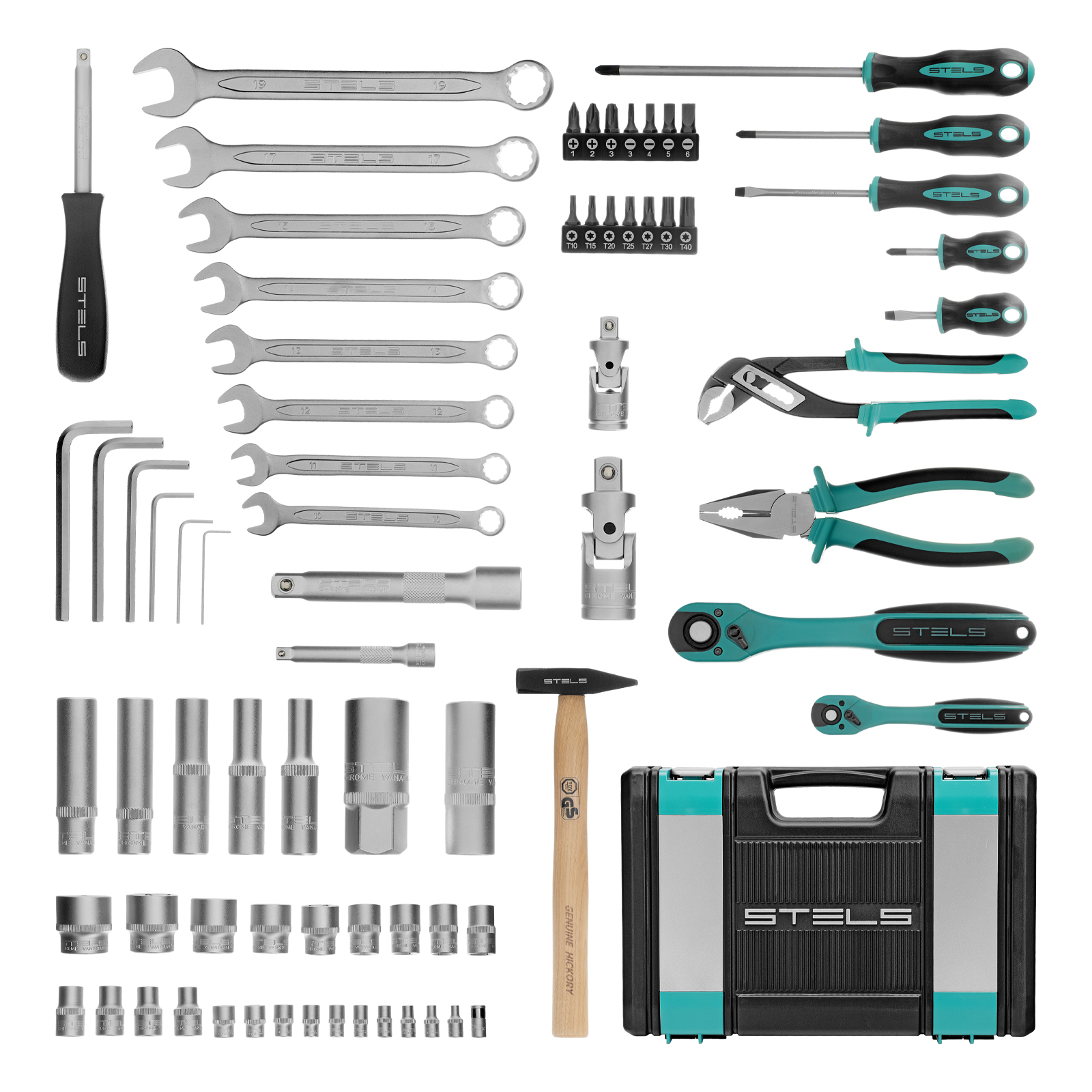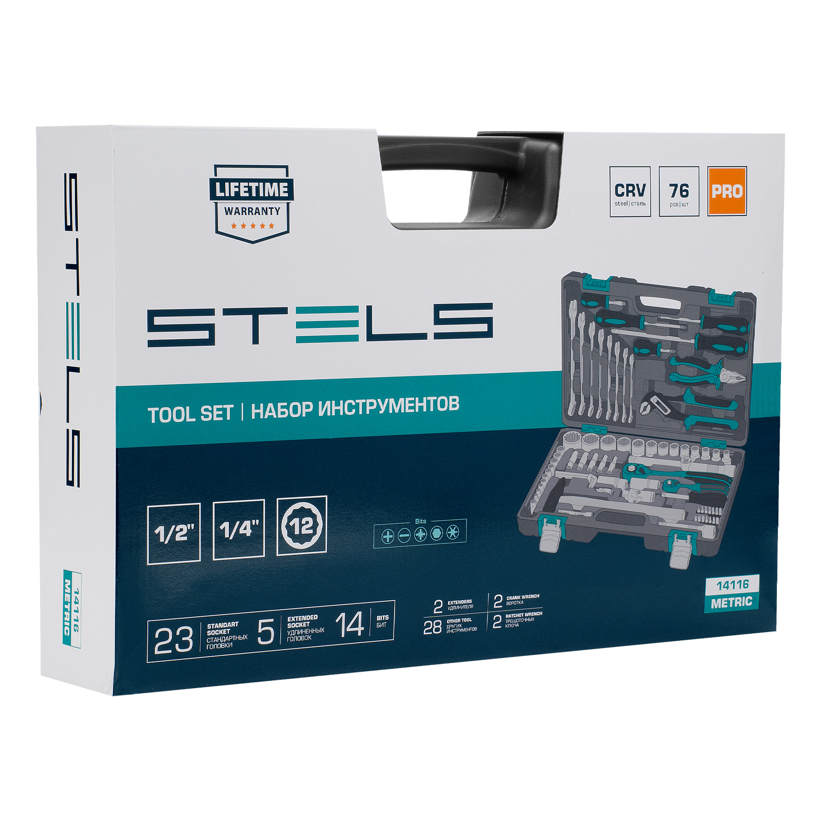 Набор инструментов Stels 14116 в ударопрочным пластиковом кейсе состоит из 76 предметов с присоединительными квадратами 1/2″ и 1/4″, из стали CrV и S2, и предназначен для выполнения слесарно-монтажных работ. Включает инструменты и насадки для работы с резьбовыми крепежами, в том числе 12-гранные торцевые головки и удлинители, облегчающие работу в труднодоступных местах. Молоток, плоскогубцы и переставные клещи расширяют возможности применения набора. Набор предназначен для профессионального использования в автомастерской, будет полезен и для решения бытовых задач.