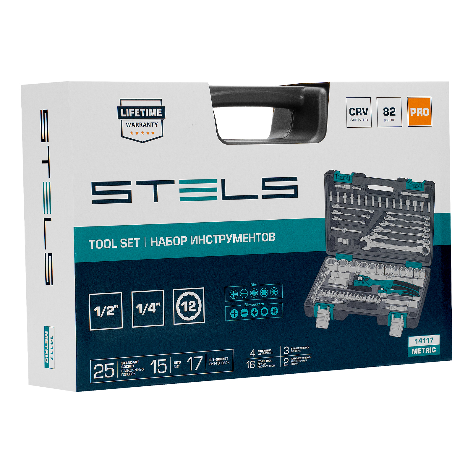 Набор инструментов Stels 14117 в ударопрочным пластиковом кейсе состоит из 82 предметов с присоединительными квадратами 1/2″ и 1/4″, из стали CrV и S2, и предназначен для выполнения слесарно-монтажных работ. Включает инструменты и насадки для работы с резьбовыми крепежами, в том числе 12-гранные торцевые головки, т-образный вороток и удлинители (в том числе гибкий), облегчающие работу в труднодоступных местах. Набор предназначен для профессионального использования в автомастерской, будет полезен и для решения бытовых задач.