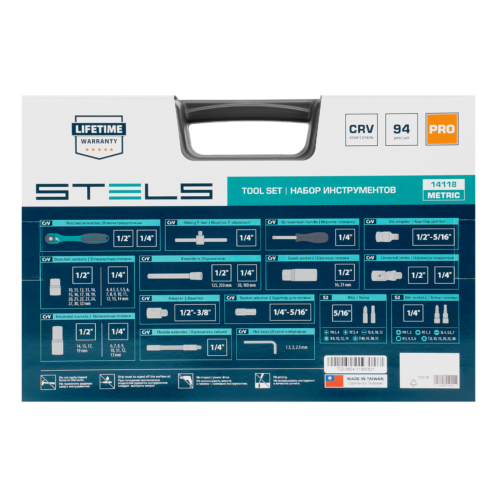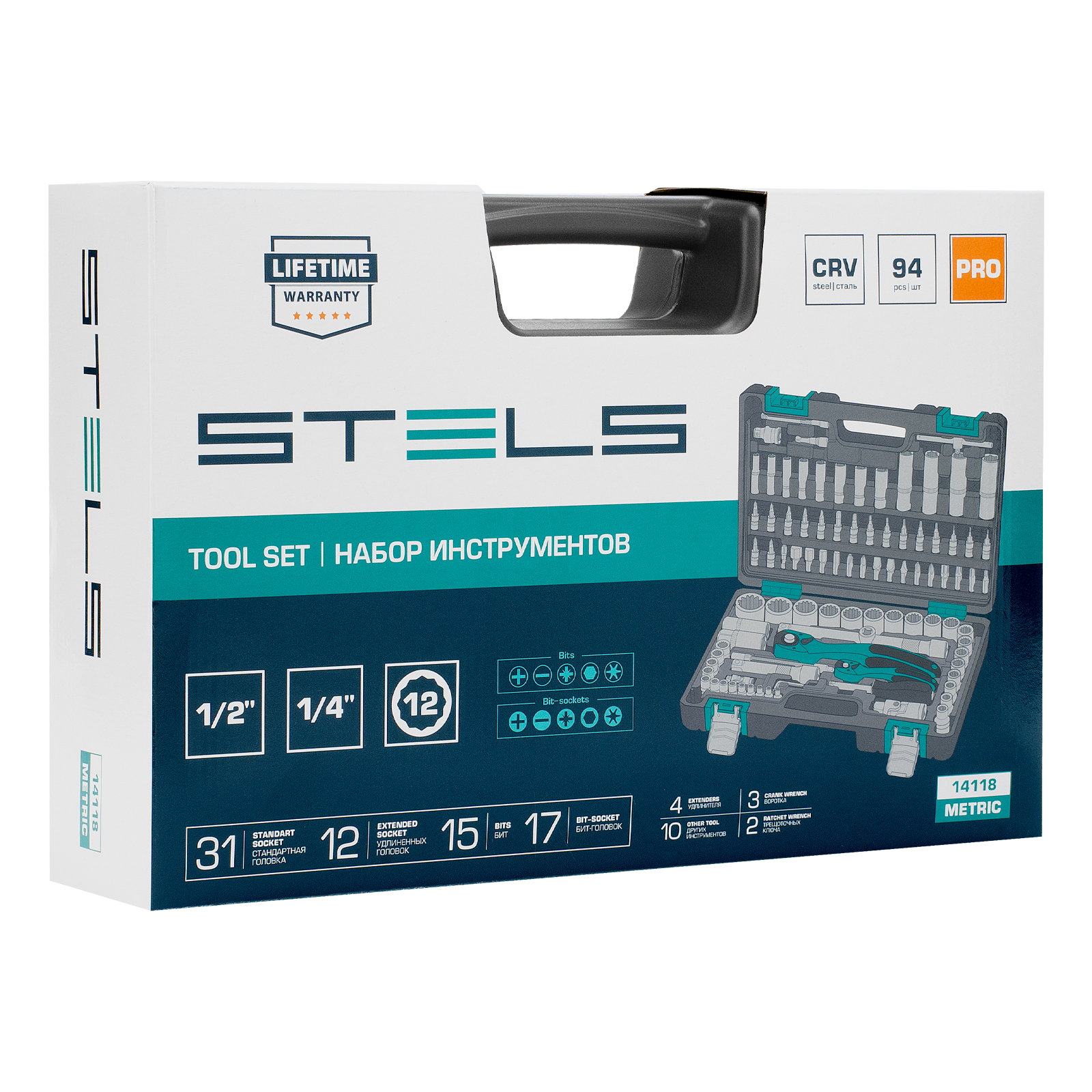 Набор инструментов Stels 14118 в ударопрочным пластиковом кейсе состоит из 94 предметов с присоединительными квадратами 1/2″ и 1/4″, из стали CrV и S2, и предназначен для выполнения слесарно-монтажных работ. Включает инструменты и насадки для работы с резьбовыми крепежами, в том числе 12-гранные торцевые головки, т-образный вороток и удлинители (в том числе гибкий), облегчающие работу в труднодоступных местах. Набор предназначен для профессионального использования в автомастерской, будет полезен и для решения бытовых задач.