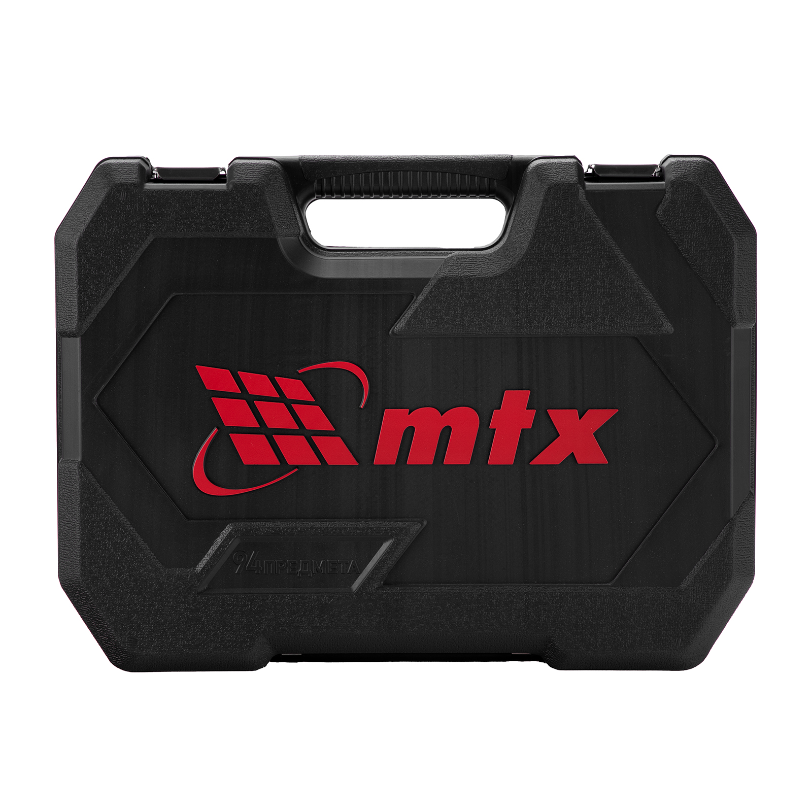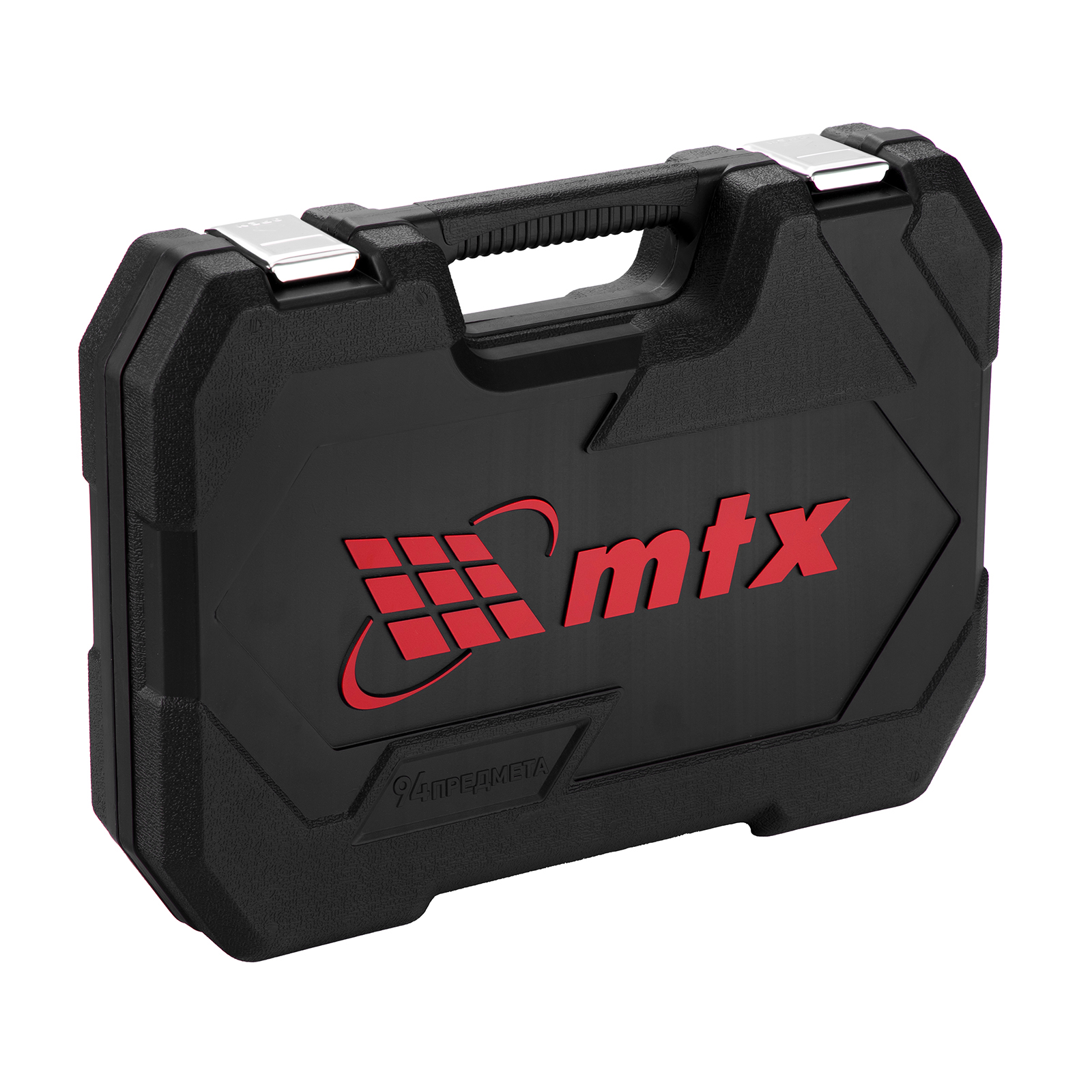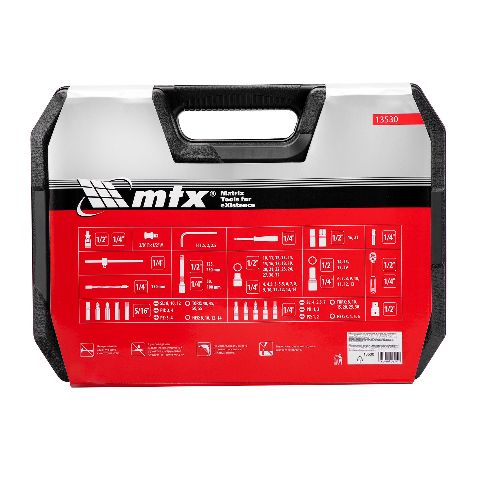 Набор инструментов MTX 13530 упакован в пластиковый кейс и состоит из 94 предметов с присоединительным размером 1/2" и 1/4", предназначенных для монтажа и демонтажа резьбового крепежа с разными типами шлицев. В комплект поставки входят карданы, удлинители и переходники, облегчающие работу в труднодоступных местах. Набор используется для ремонта автомобилей, а также полезен в быту.