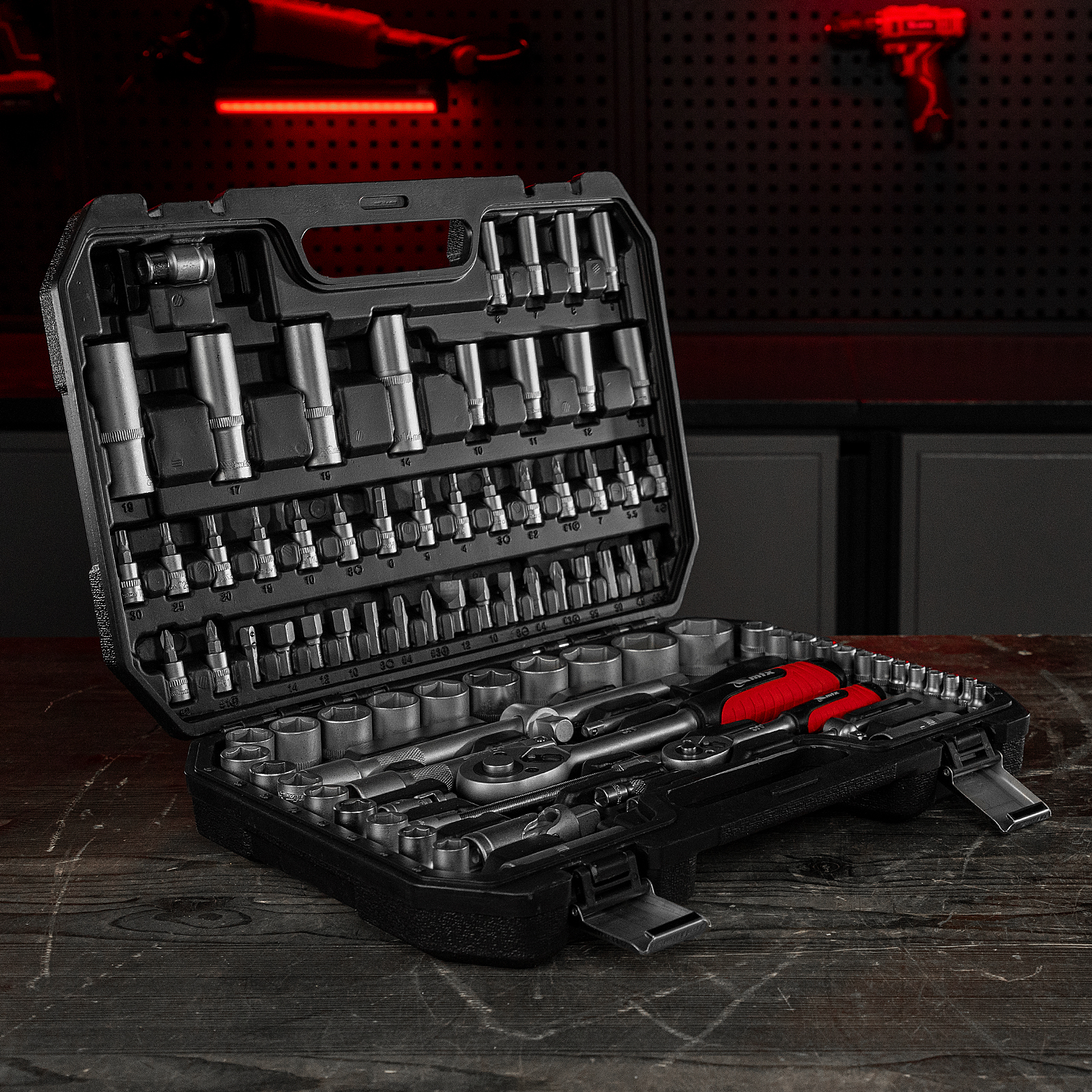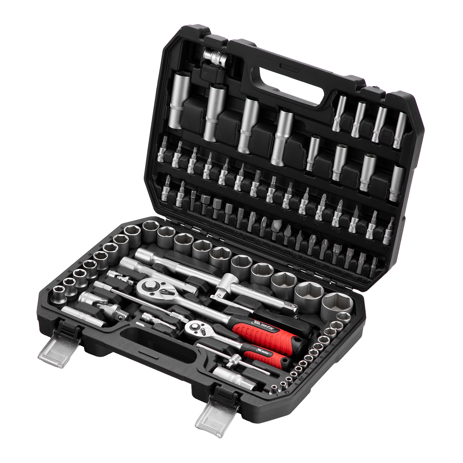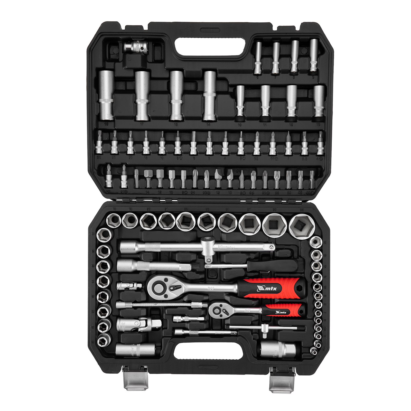 Набор инструментов MTX 13530 упакован в пластиковый кейс и состоит из 94 предметов с присоединительным размером 1/2" и 1/4", предназначенных для монтажа и демонтажа резьбового крепежа с разными типами шлицев. В комплект поставки входят карданы, удлинители и переходники, облегчающие работу в труднодоступных местах. Набор используется для ремонта автомобилей, а также полезен в быту.