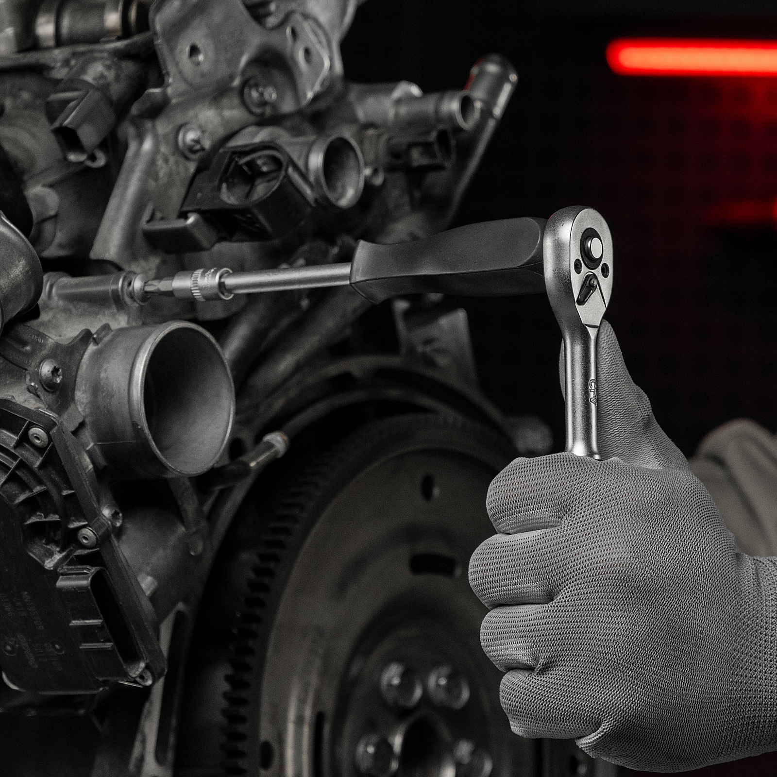 - Комфортная и эффективная работа — ключи-трещотки с 45 зубьями оснащены механизмом быстрого сброса, переключателем реверса с металлическим флажком и двухкомпонентной рукояткой.