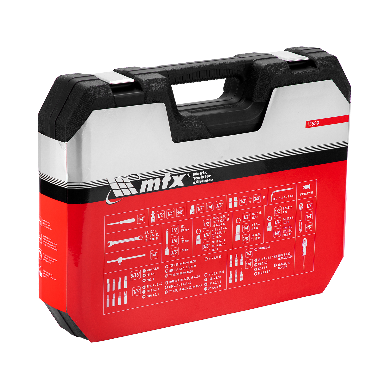 Набор инструментов MTX 13589 упакован в пластиковый кейс и состоит из 215 предметов с присоединительным размером 1/2", 3/8", 1/4", предназначенных для монтажа и демонтажа резьбового крепежа с разными типами шлицев. В комплект поставки входят карданы, удлинители и переходники, облегчающие работу в труднодоступных местах. Набор используется для ремонта автомобилей, а также будет полезен в быту.