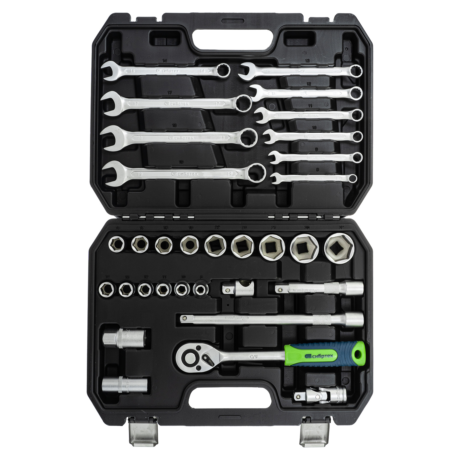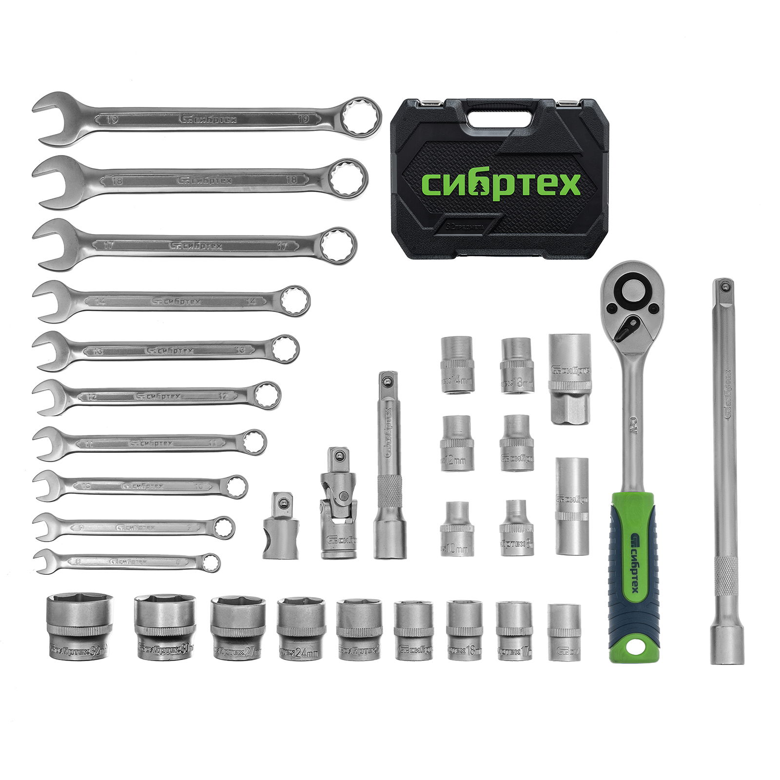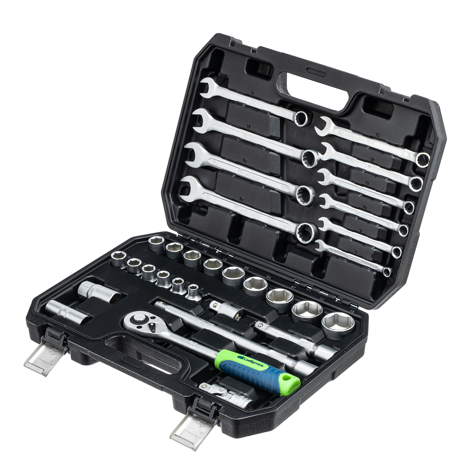 Набор инструментов Сибртех 13393, поставляющийся в пластиковом кейсе, состоит из 32 предметов с присоединительным размером 1/2", предназначенных для закручивания и откручивания резьбового крепежа. В комплект поставки входят 2 удлинителя и кардан, облегчающие работу в труднодоступных местах. Набор будет полезен для ремонта автомобиля в гараже, пригодится также и в быту.