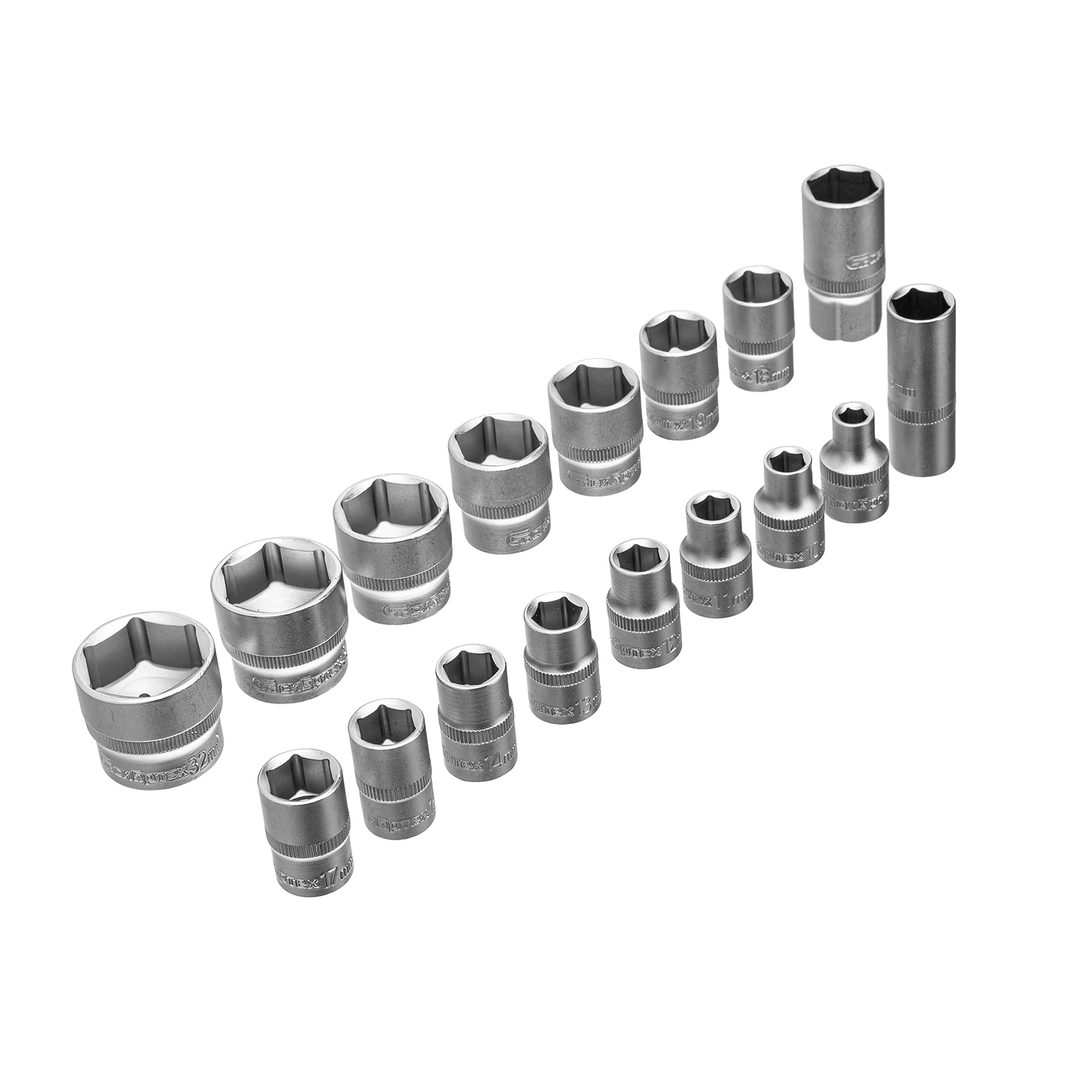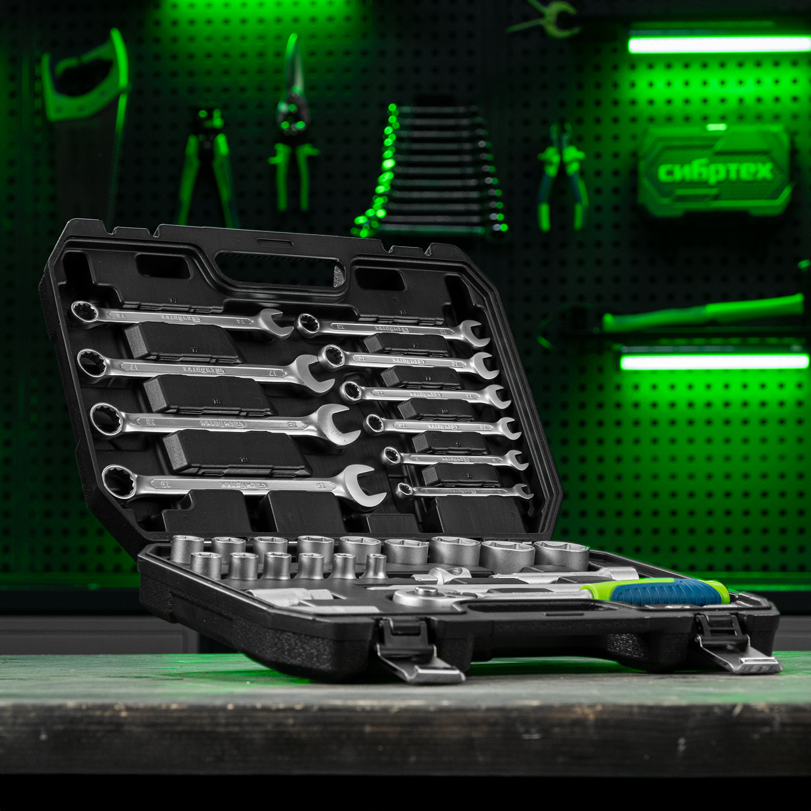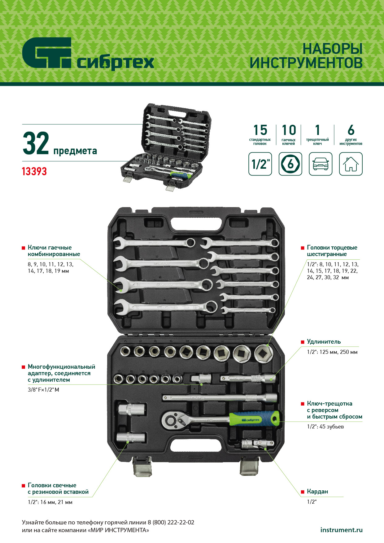 Набор инструментов Сибртех 13393, поставляющийся в пластиковом кейсе, состоит из 32 предметов с присоединительным размером 1/2", предназначенных для закручивания и откручивания резьбового крепежа. В комплект поставки входят 2 удлинителя и кардан, облегчающие работу в труднодоступных местах. Набор будет полезен для ремонта автомобиля в гараже, пригодится также и в быту.