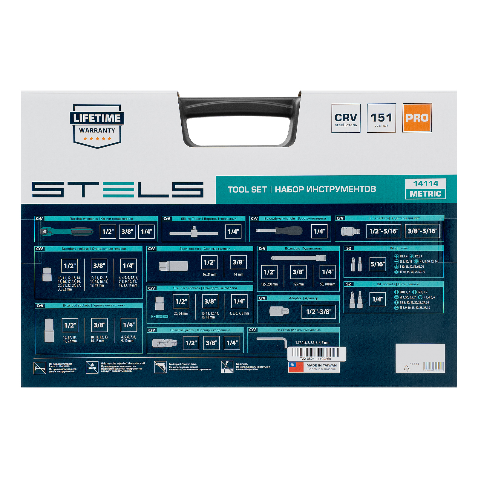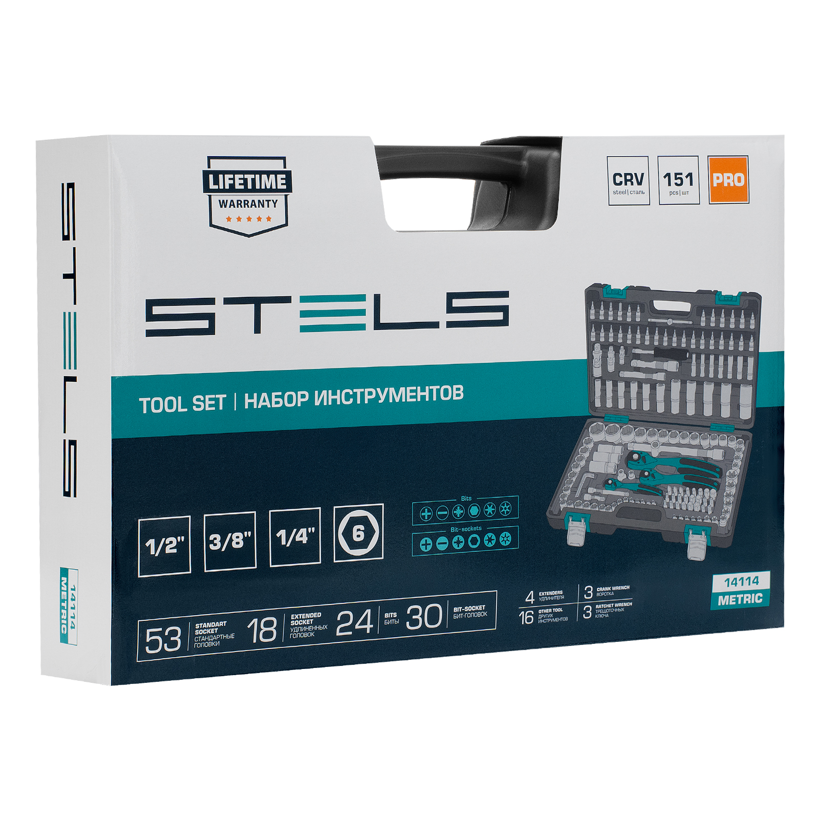 Набор инструментов Stels 14114 в ударопрочным пластиковом кейсе состоит из 151 предметов с присоединительными квадратами 1/2″ , 1/4″ и 3/8″, из стали CrV и S2, и предназначен для выполнения слесарно-монтажных работ. Включает инструменты и насадки для работы с резьбовыми крепежами, а также удлинители и т-образный вороток, облегчающие работу в труднодоступных местах. Набор предназначен для профессионального использования в автомастерской, будет полезен и для решения бытовых задач.