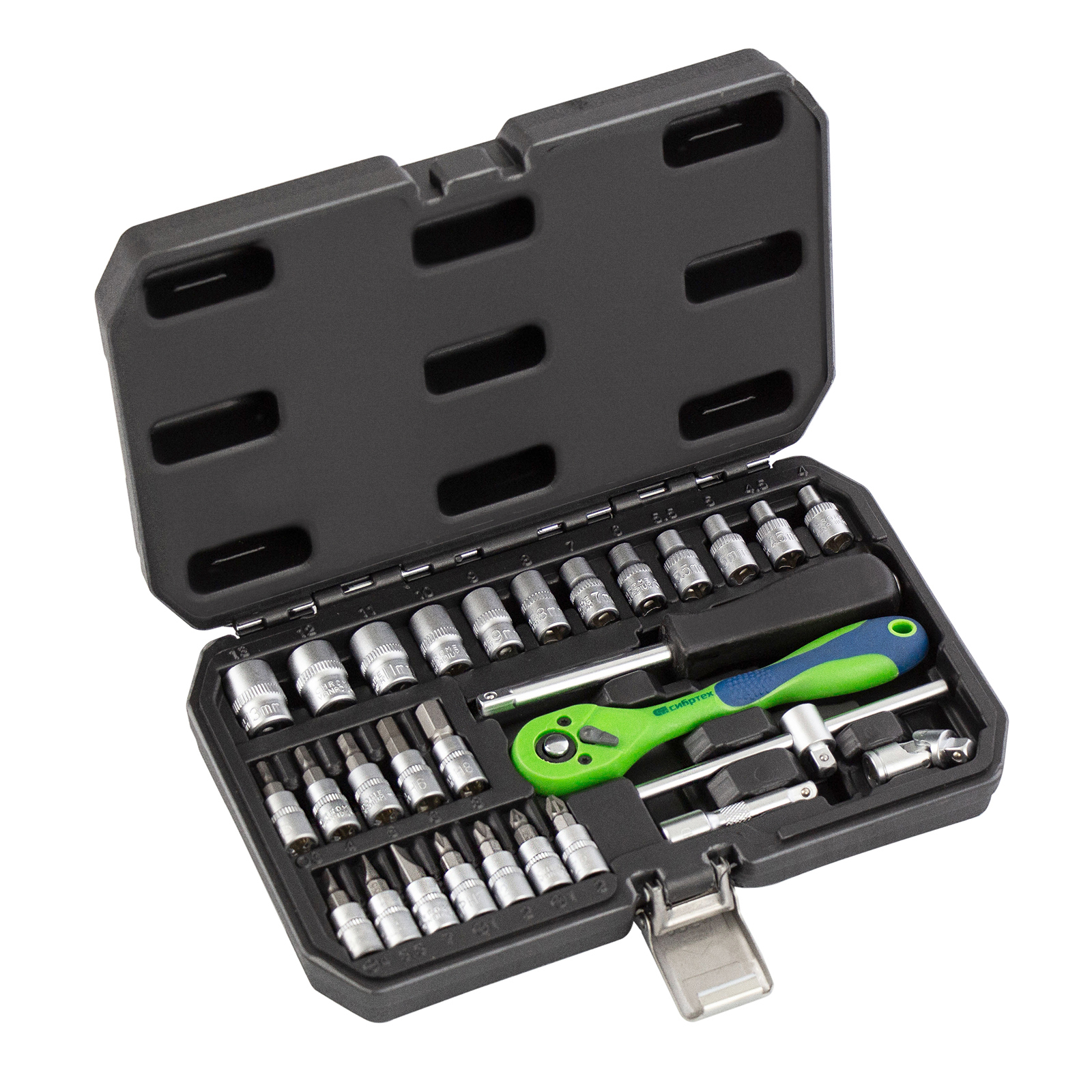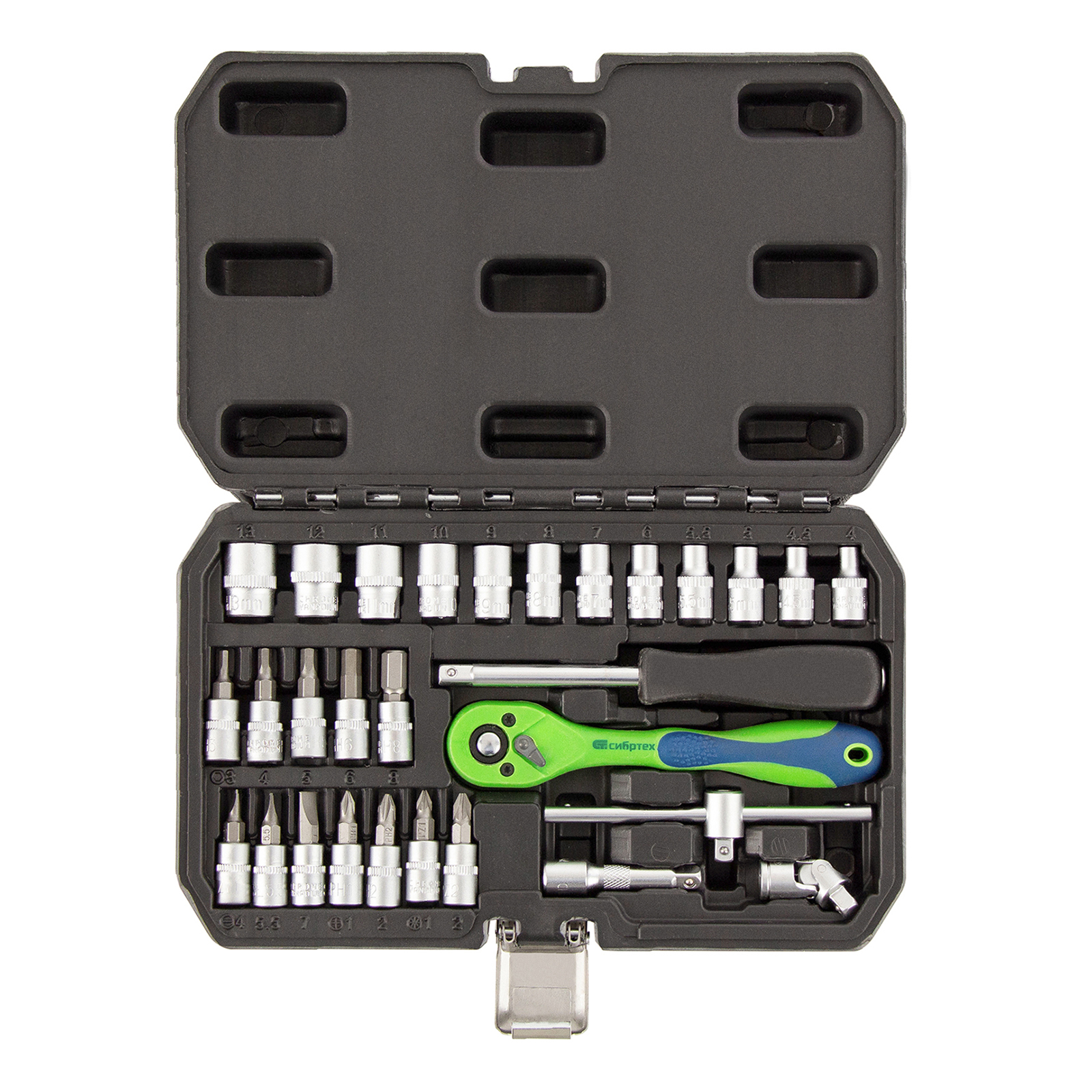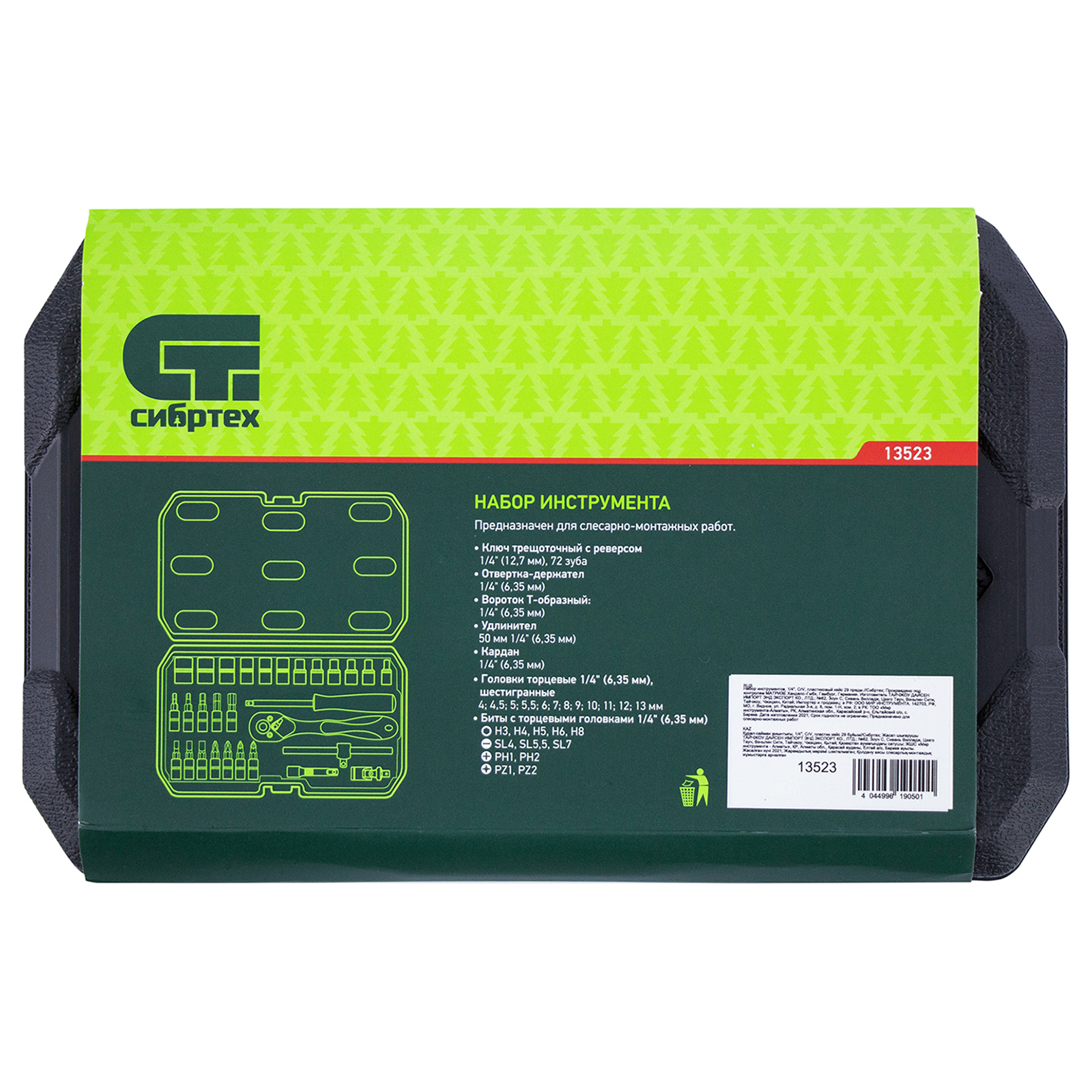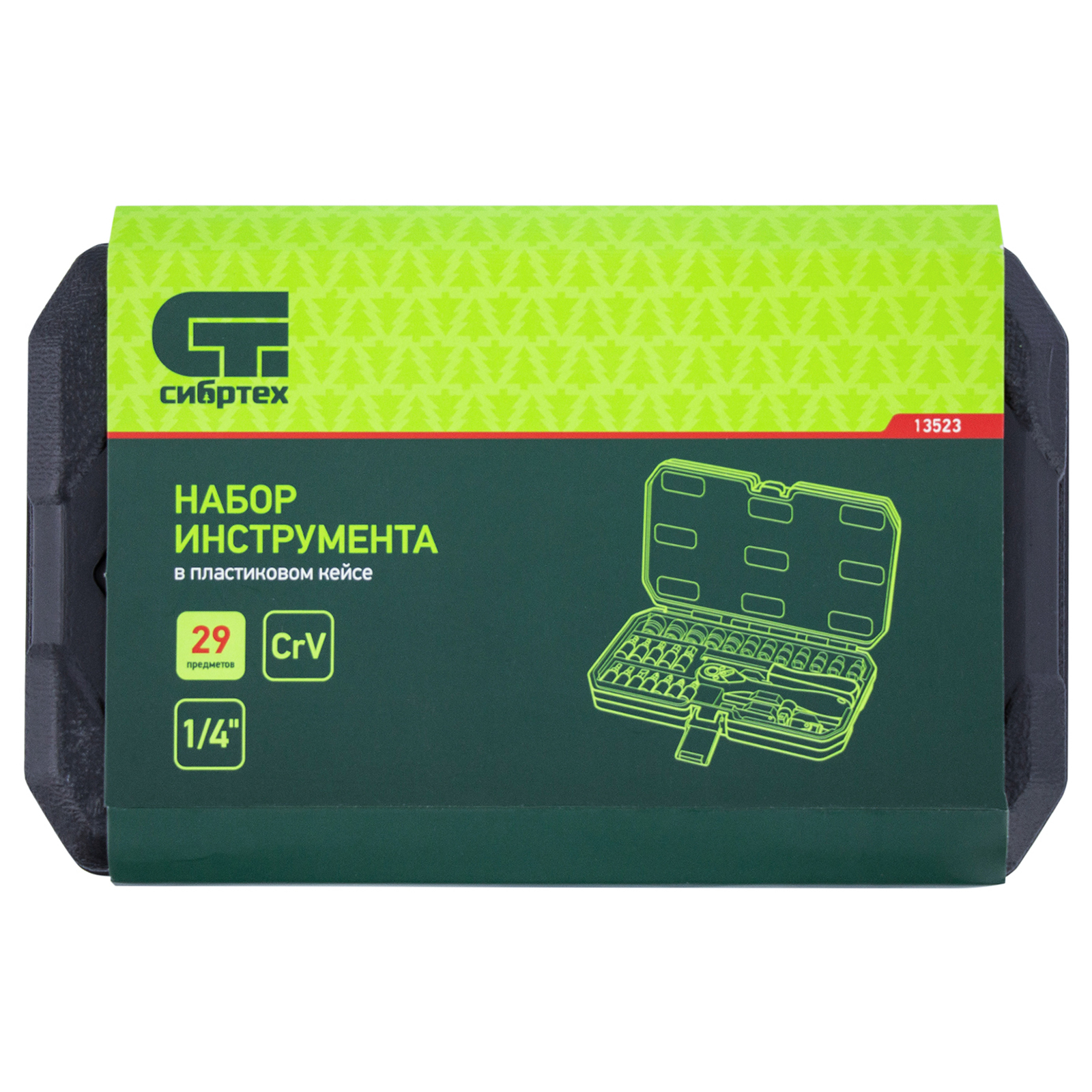 Набор инструментов Сибртех 13523, 1/4 дюйма, в пластиковом кейсе, состоит из 29 предметов, изготовленных из стали CrV-группы и использующихся для работы с резьбовыми соединениями. В комплекте имеются кардан, удлинитель и вороток, упрощающие работу в труднодоступных местах. Набор будет полезен автолюбителям и домашним мастерам.