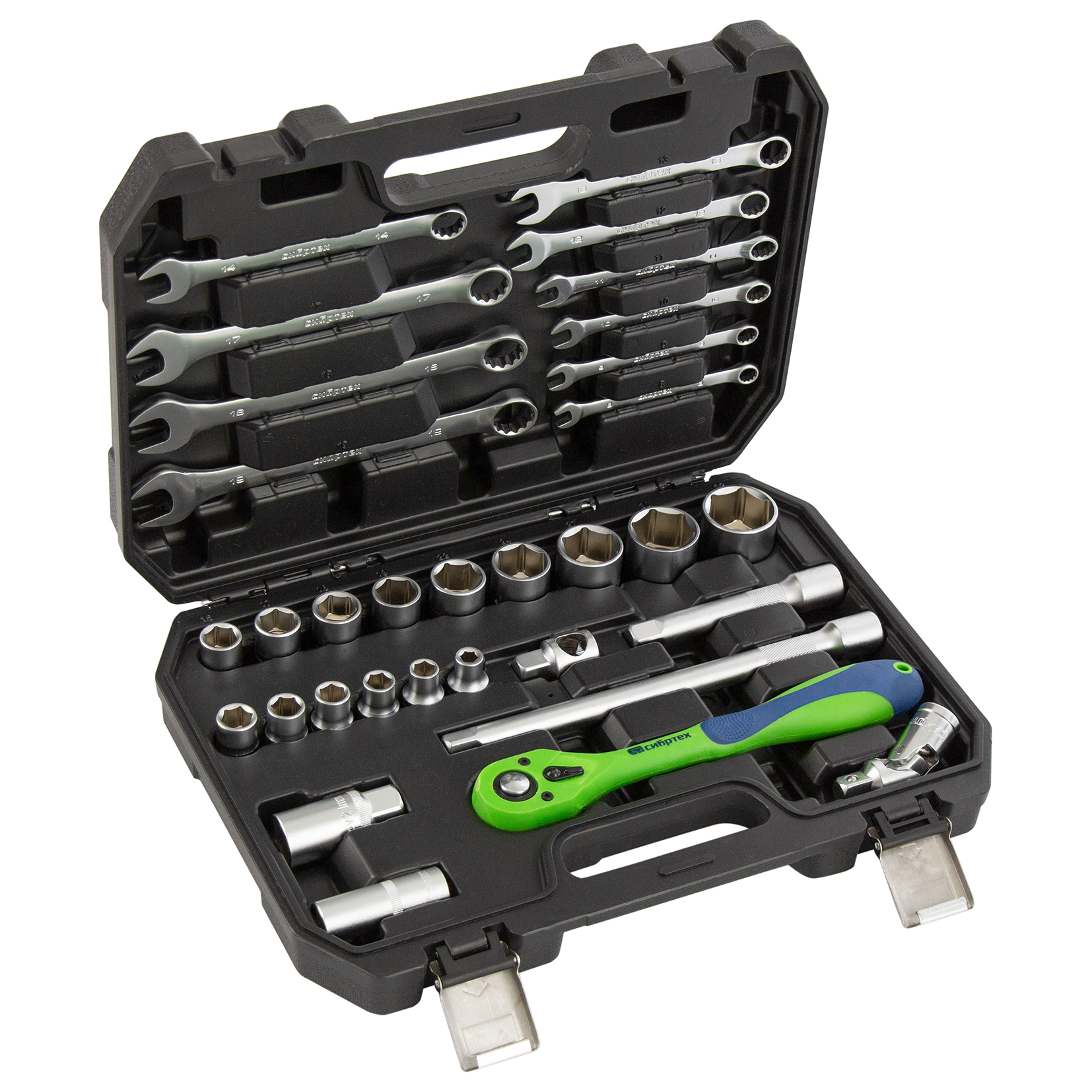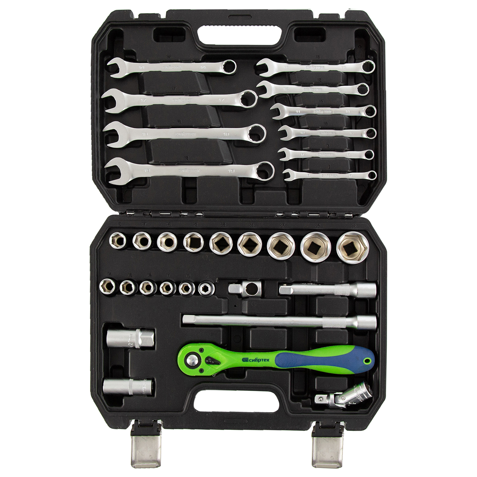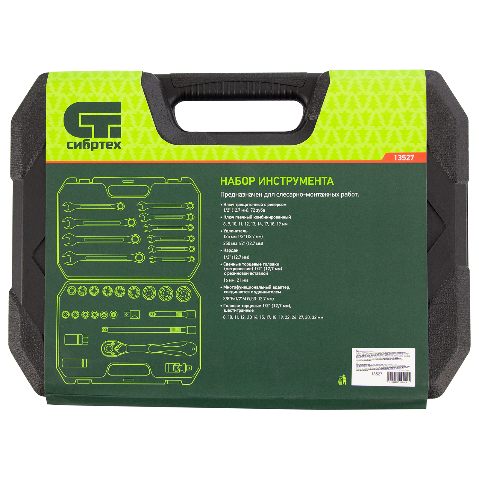 Набор инструментов Сибртех 13527, 1/2 дюйма, в пластиковом кейсе, состоит из 32 предметов, изготовленных из стали CrV-группы и предназначенных для закручивания и откручивания резьбовых крепежей. Имеющиеся в комплекте 2 удлинителя и кардан облегчают работу в труднодоступных местах. Набор будет полезен для ремонта автомобиля в гараже, пригодится также и в быту.