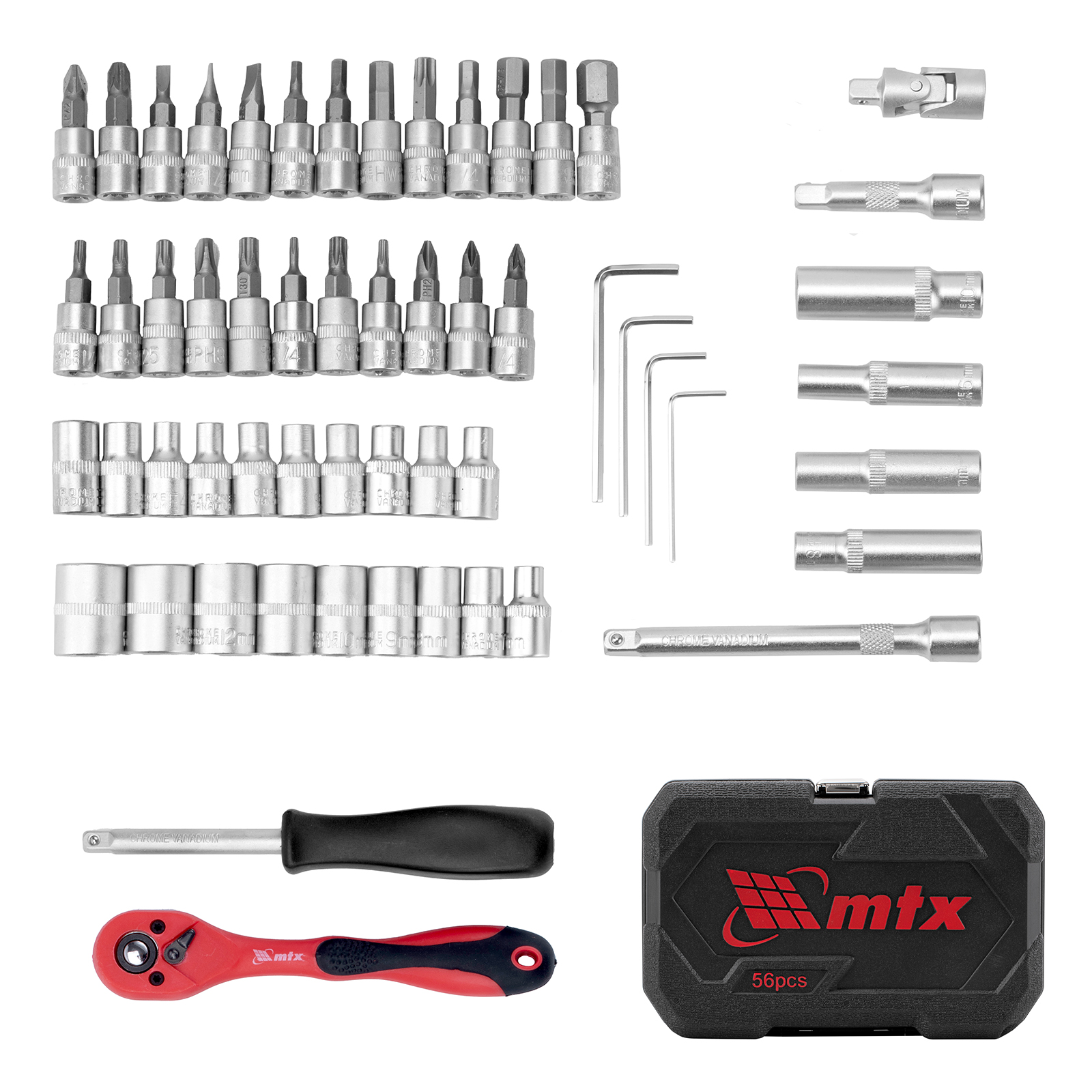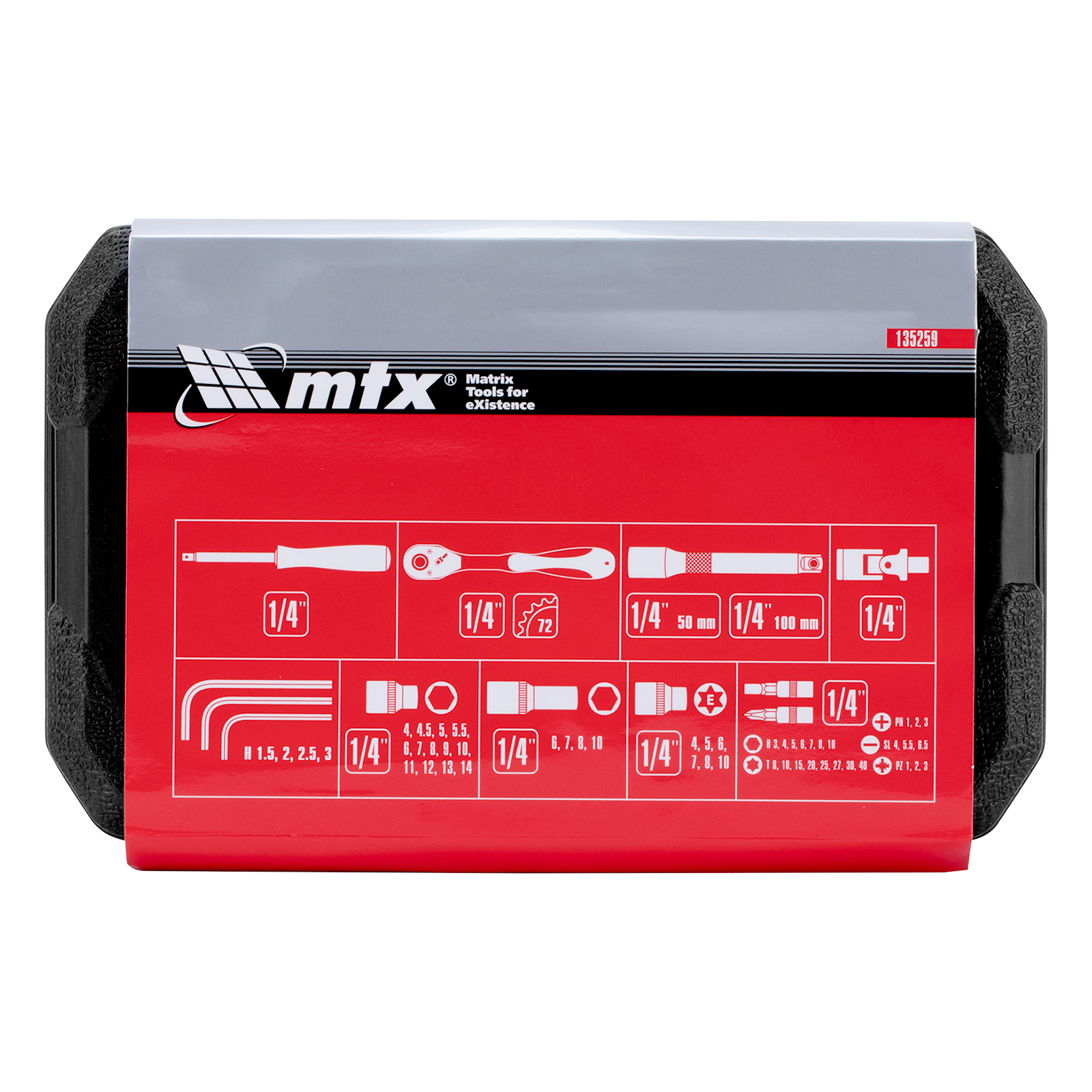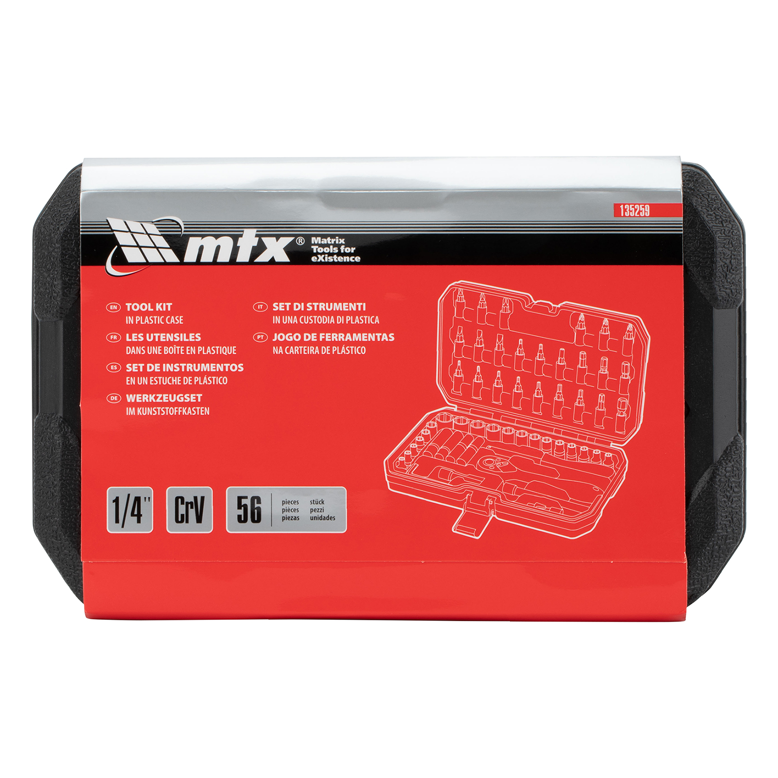 Набор инструментов MTX 135259 состоит из 56 предметов с присоединительным размером 1/4". Инструменты предназначены для работы с резьбовыми соединениями. В комплект поставки входит 2 удлинителя и кардан, упрощающие работу в труднодоступных местах. Набор будет полезен автолюбителю и домашнему мастеру.