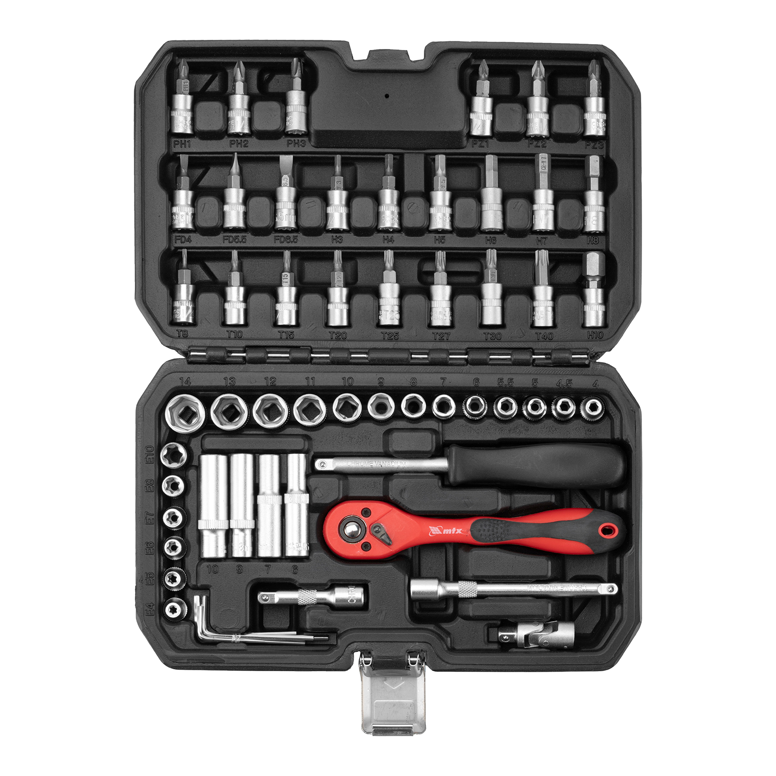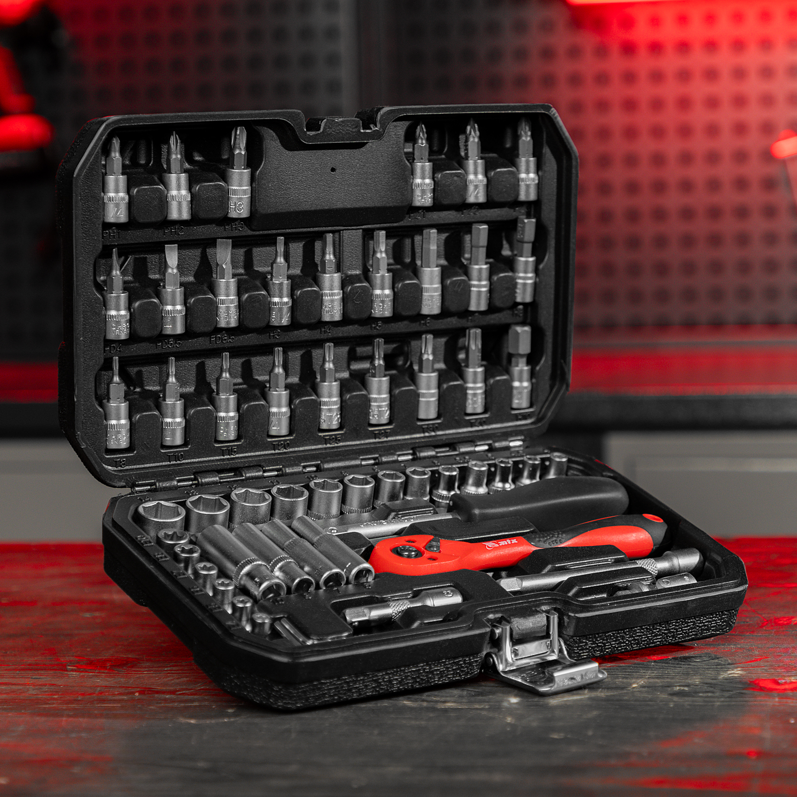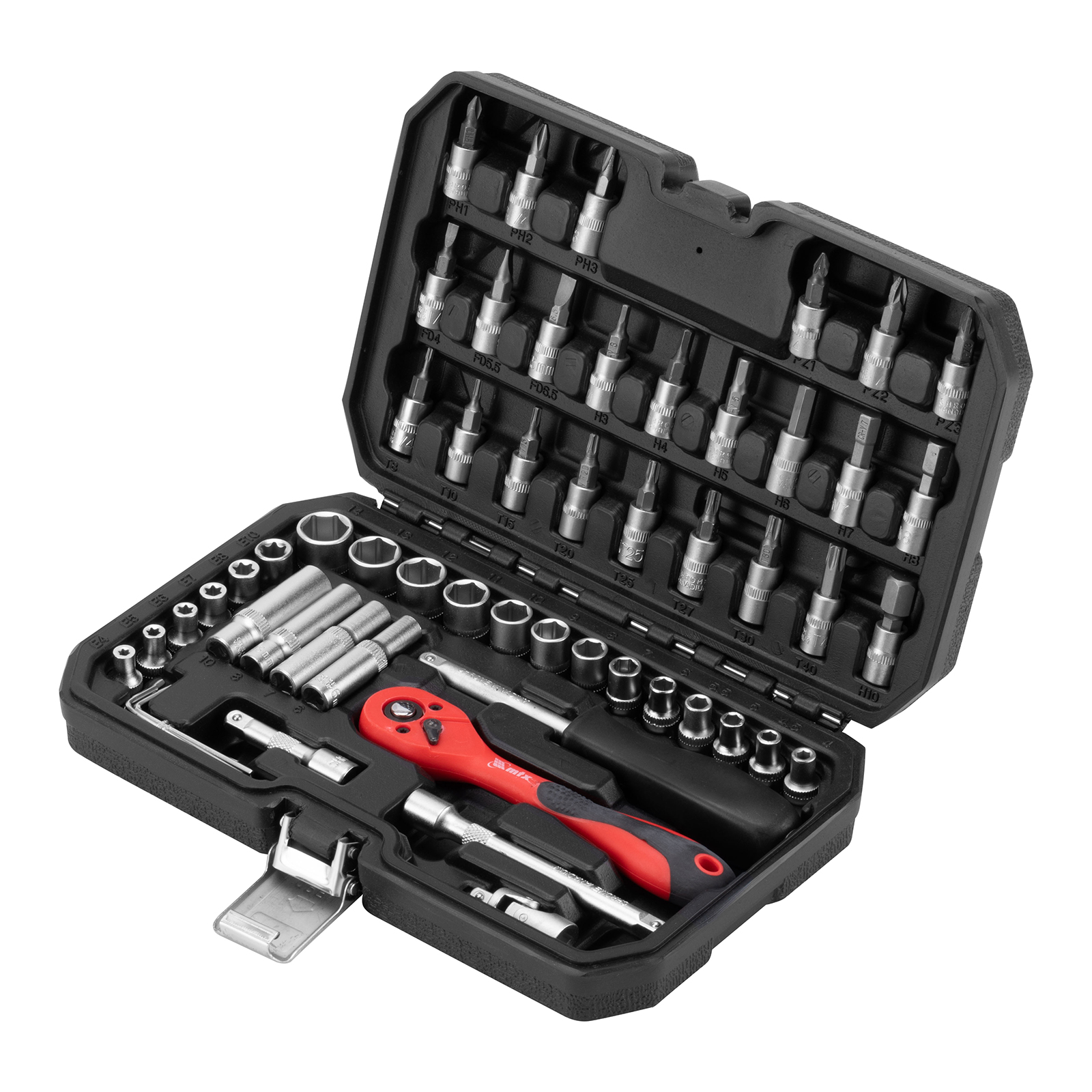 - Прочность и износостойкость — элементы набора изготовлены из высококачественной стали CrV, на корпусе трещоточного ключа предусмотрено защитное полипропиленовое покрытие.