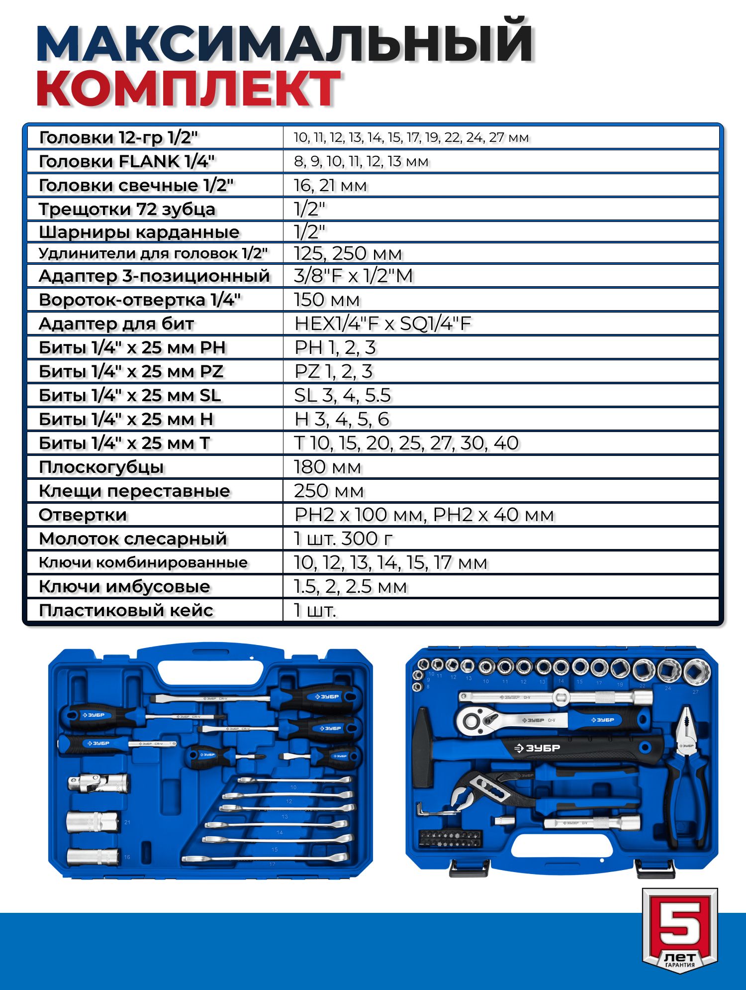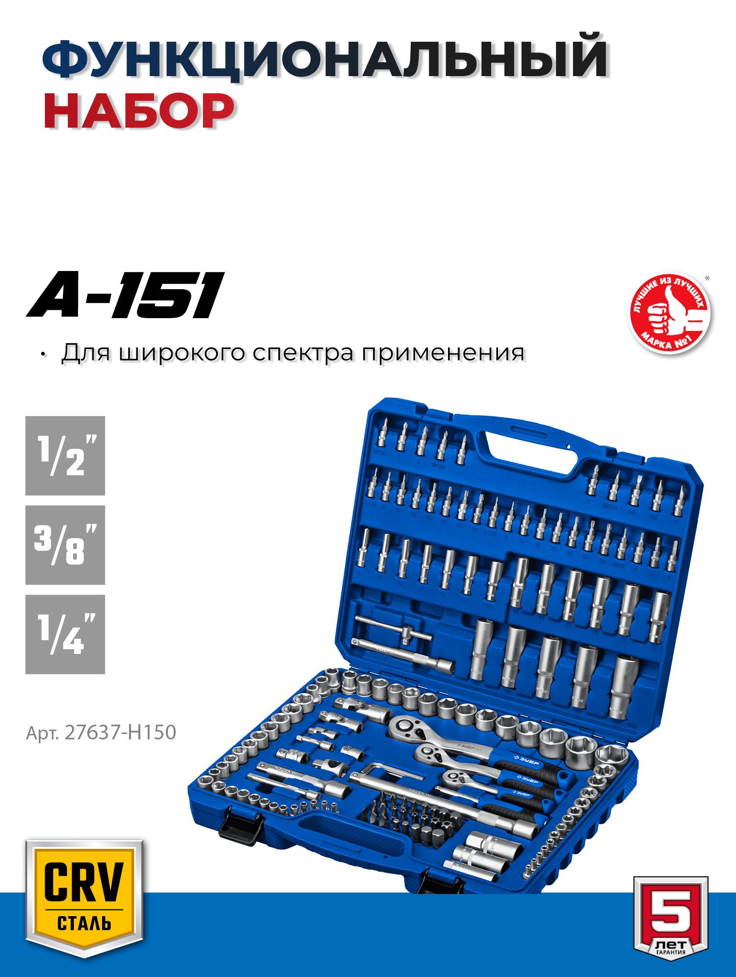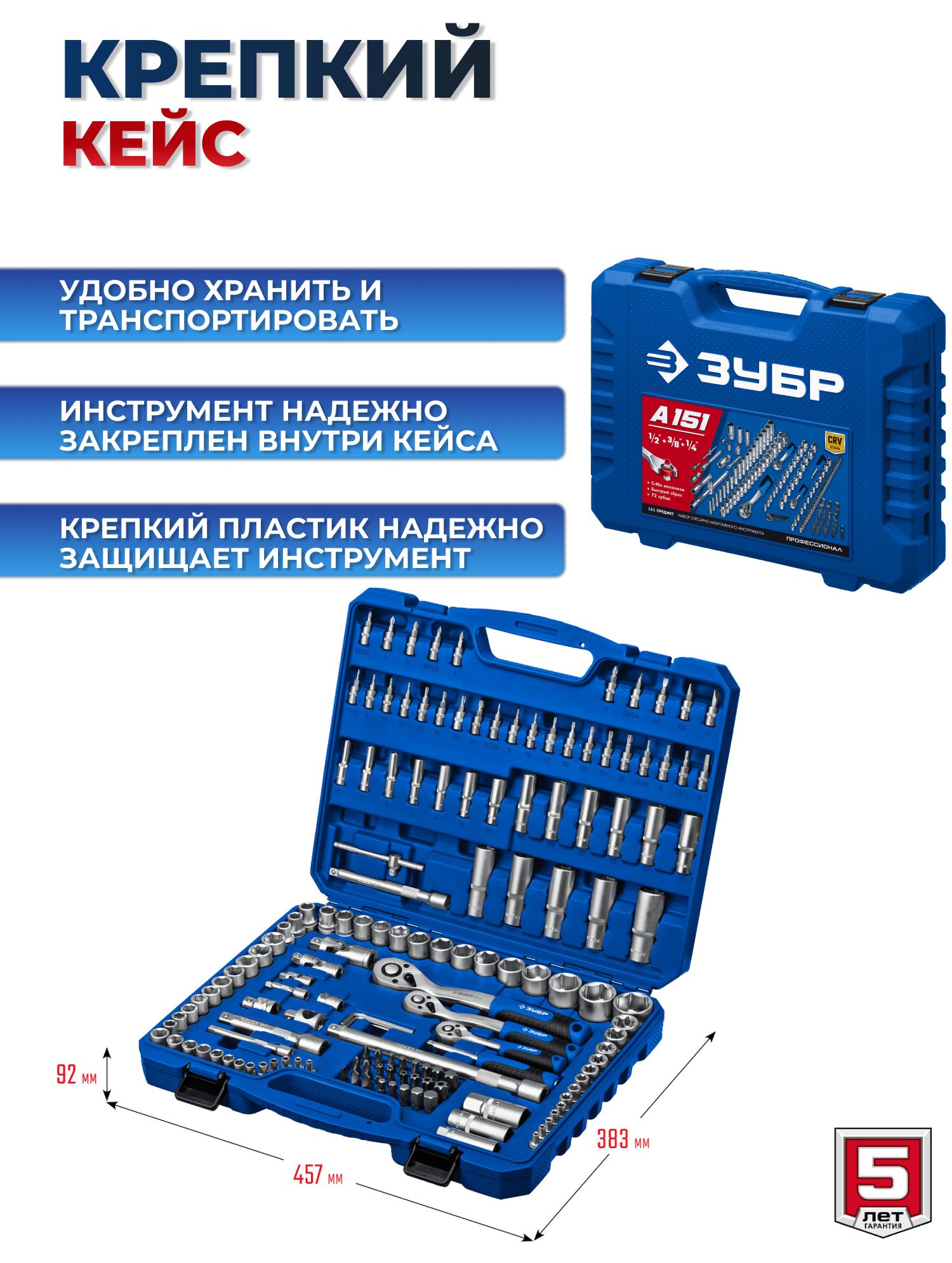 Набор инструментов для работы с различным крепежом, обслуживания техники и оборудования, в том числе и крупногабаритной.Этот универсальный набор инструментов отлично подойдет как набор инструментов для автомобиля. Этот инструмент для ремонта и строительства выполнен из высококачественной хромованадиевой стали CrV. Хромированное покрытие защищает инструменты от коррозии. Многоступенчатая закалка создает баланс прочности и твердости. Инструмент имеет FLANK профиль для быстрого и точного захвата крепежа. В набор входит все необходимое для эффективной работы: торцевые головки, трещетки со сбросом для быстрого отворачивания крепежа, удлинители головок, биты, гаечные ключи и накидные ключи и отвертки.