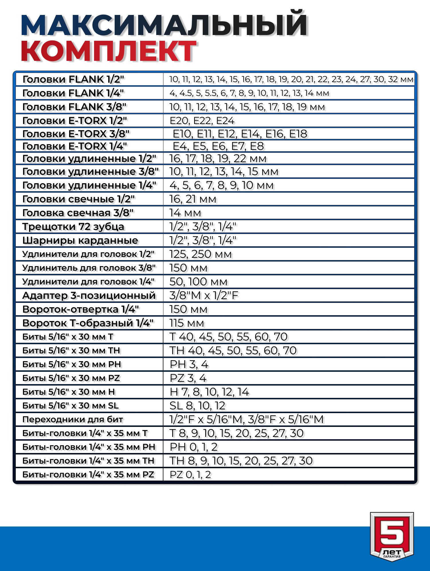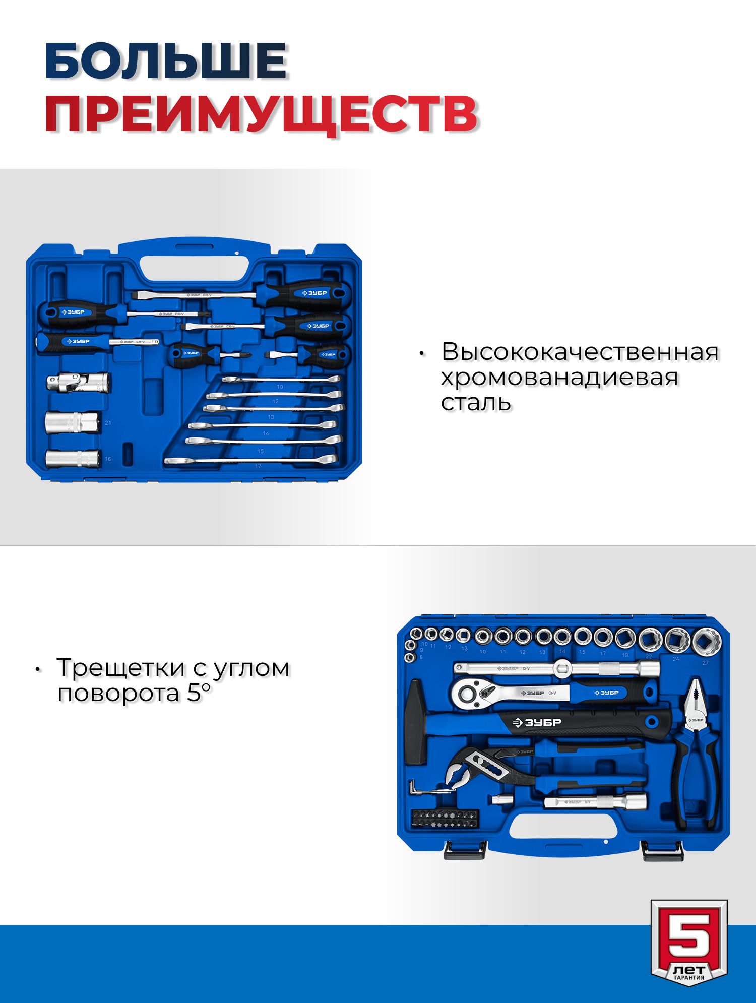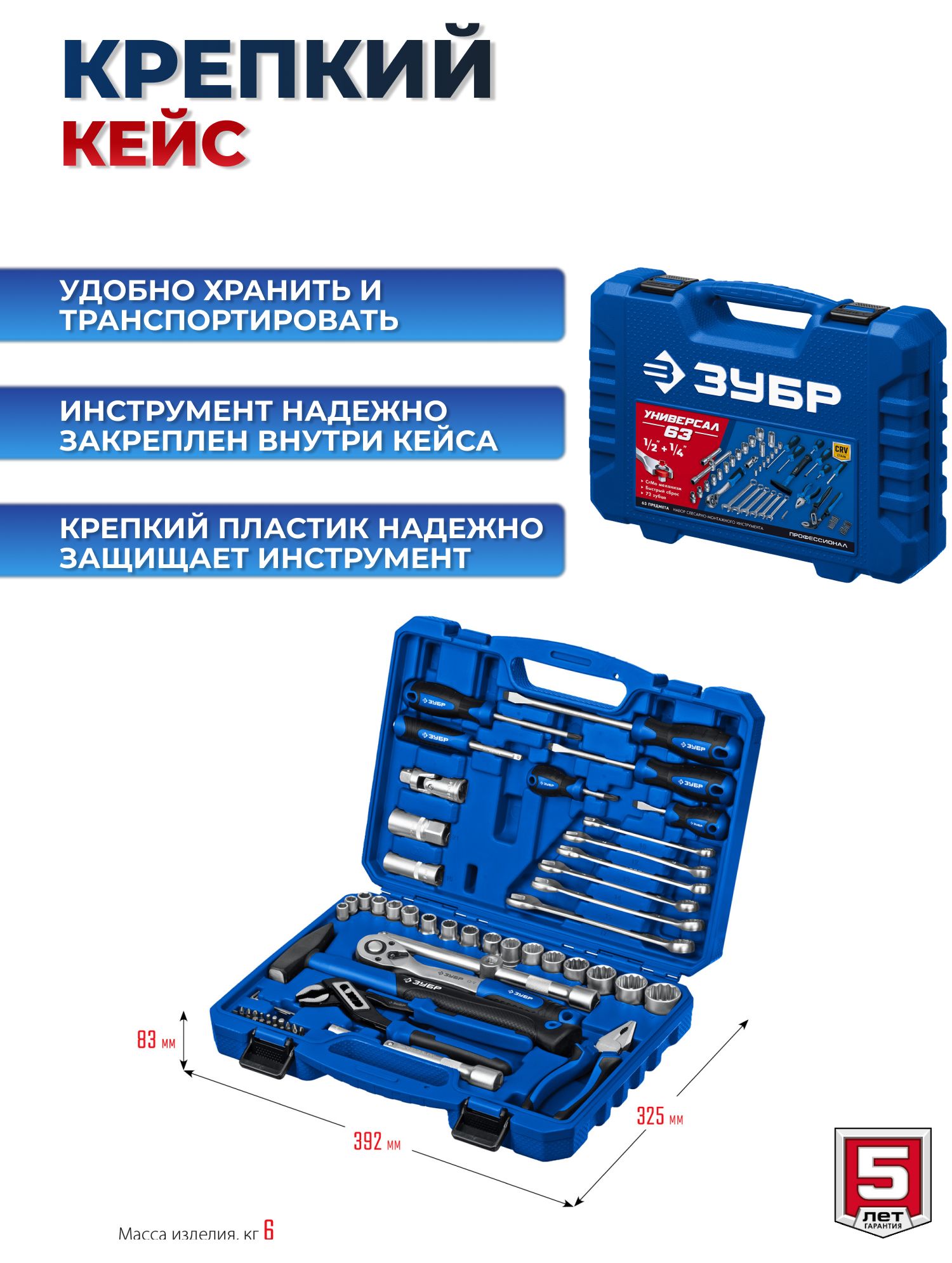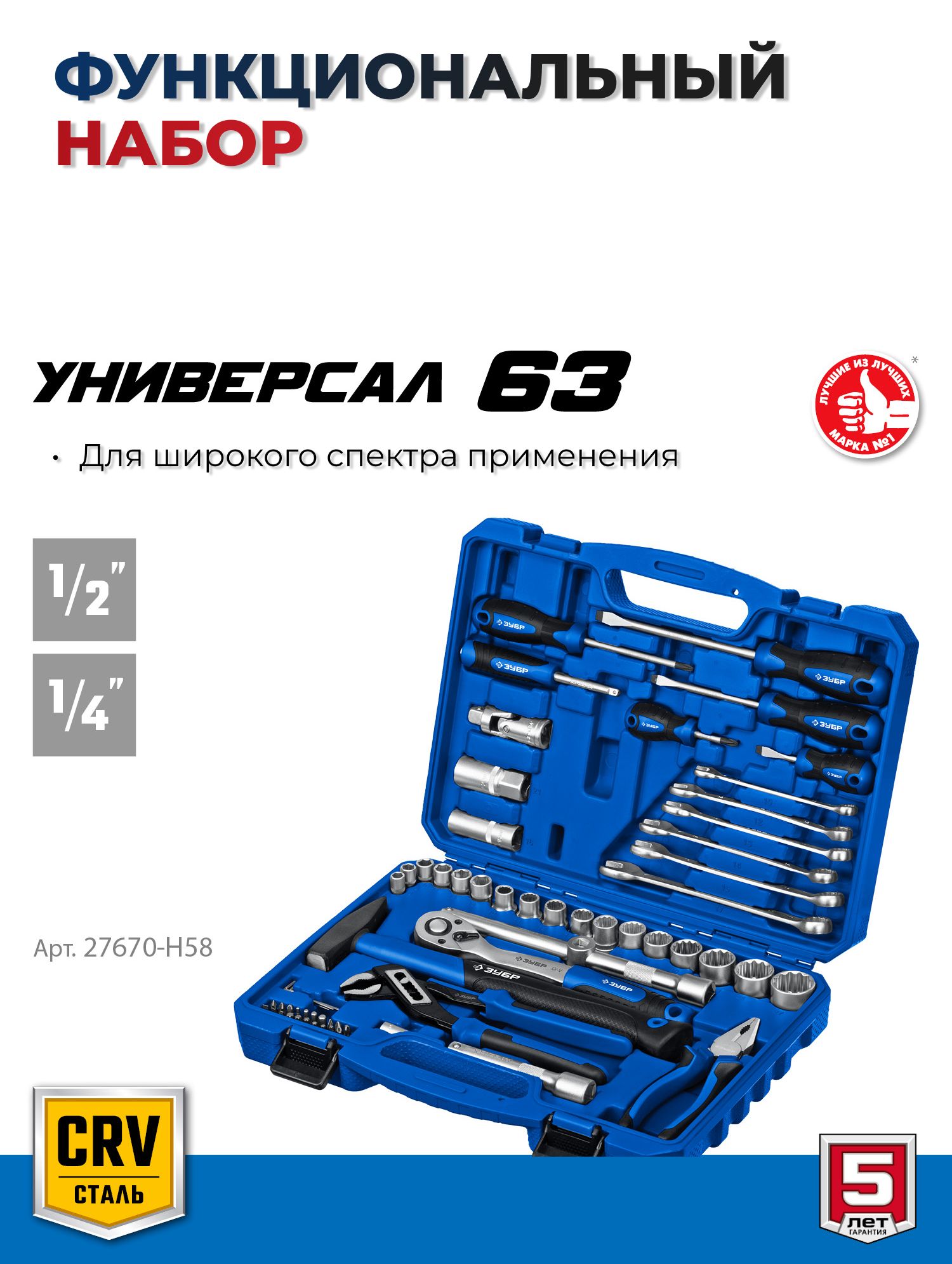 Набор инструментов для работы с различным крепежом, обслуживания техники и оборудования, в том числе и крупногабаритной.Этот универсальный набор инструментов отлично подойдет как набор инструментов для автомобиля. Этот инструмент для ремонта и строительства выполнен из высококачественной хромованадиевой стали CrV. Хромированное покрытие защищает инструменты от коррозии. Многоступенчатая закалка создает баланс прочности и твердости. Инструмент имеет FLANK профиль для быстрого и точного захвата крепежа. В набор входит все необходимое для эффективной работы: торцевые головки, трещетки со сбросом для быстрого отворачивания крепежа, удлинители головок, биты, гаечные ключи и накидные ключи и отвертки.