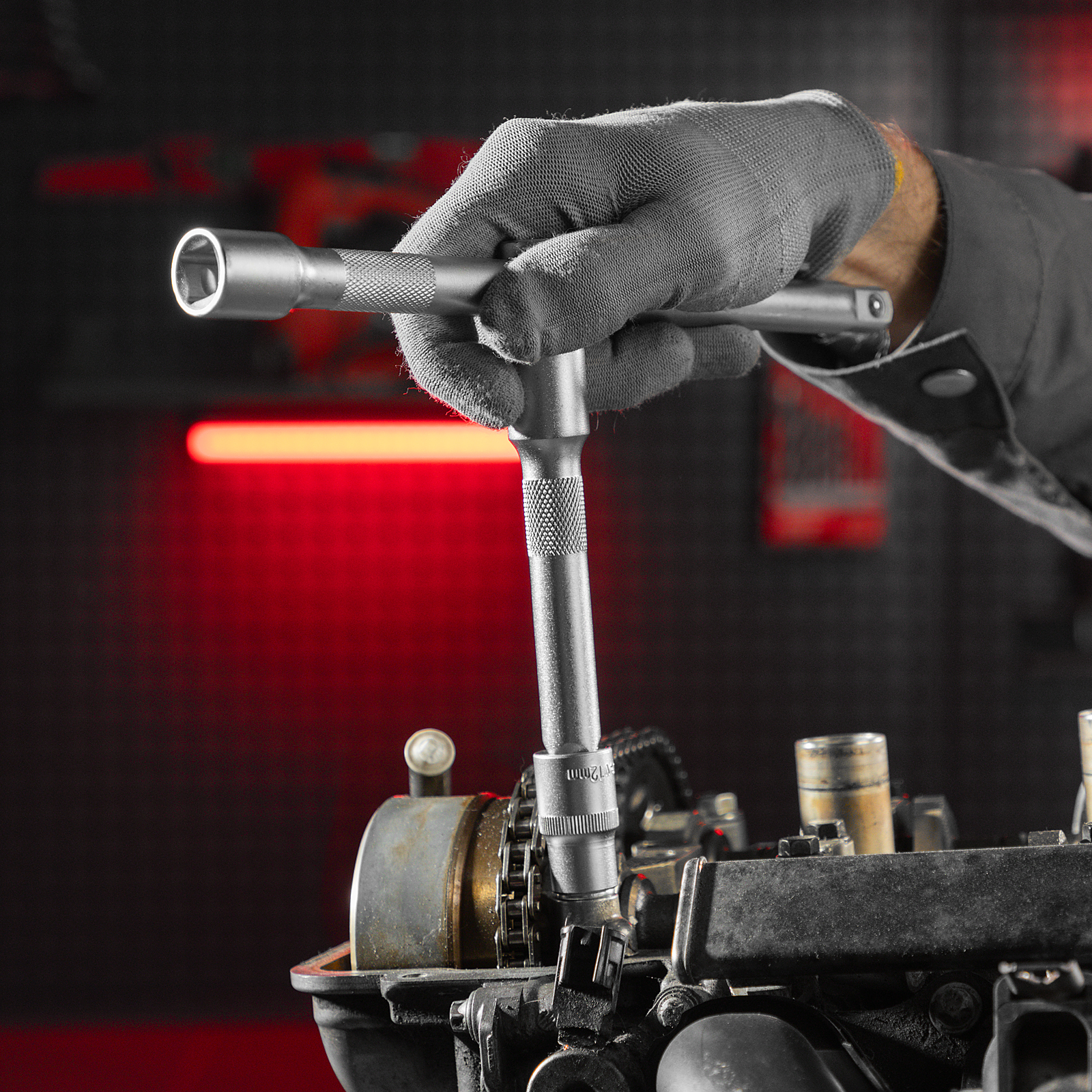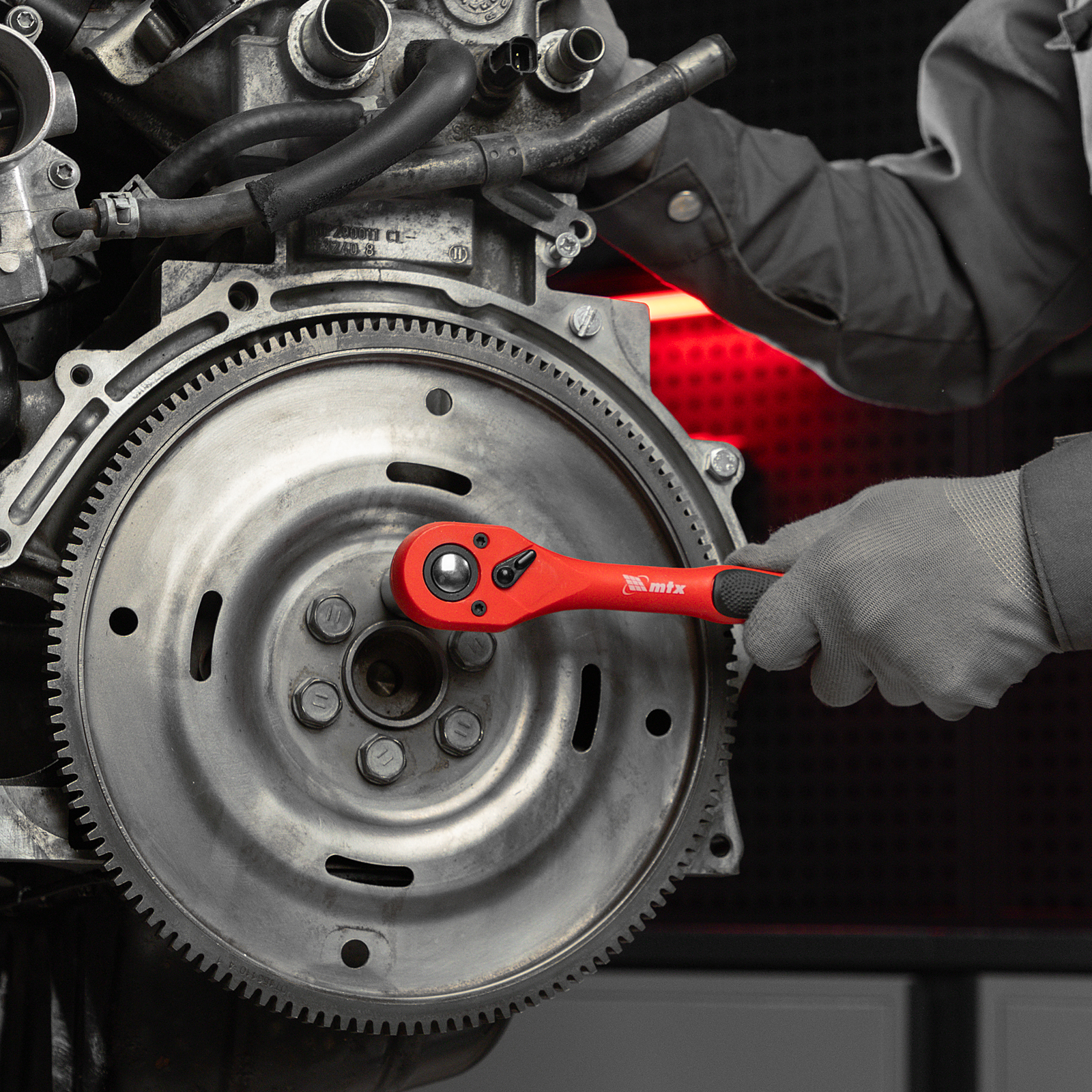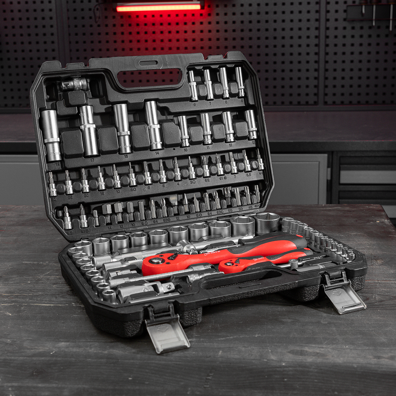 - Удобная эксплуатация — храповики трещоточных ключей с 72 зубьями обеспечивают плавное вращение, торцевые головки с насечками и трещотки с прорезиненными рукоятками не проскальзывают в руках.