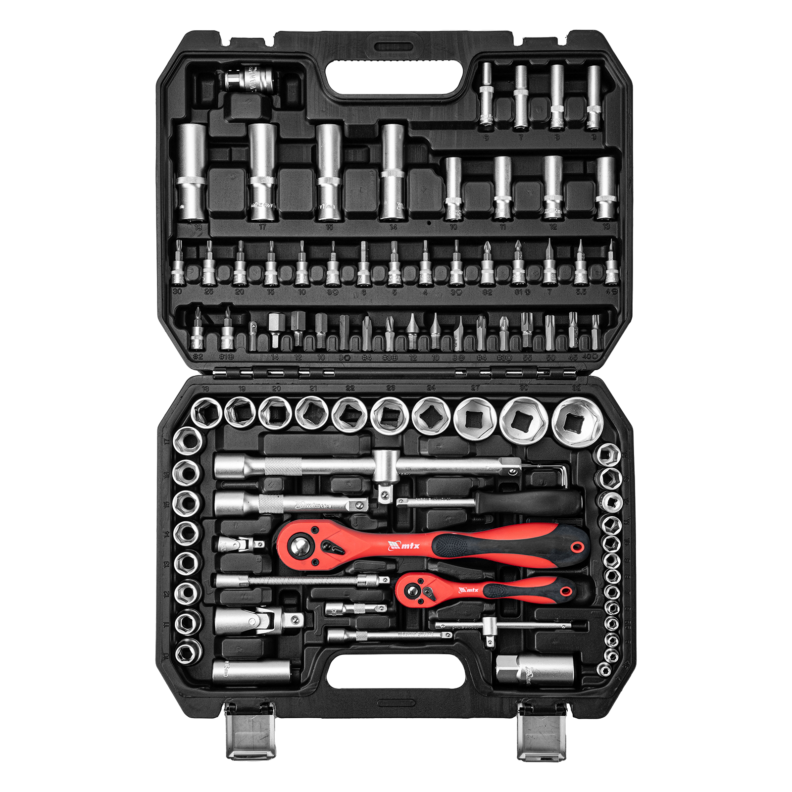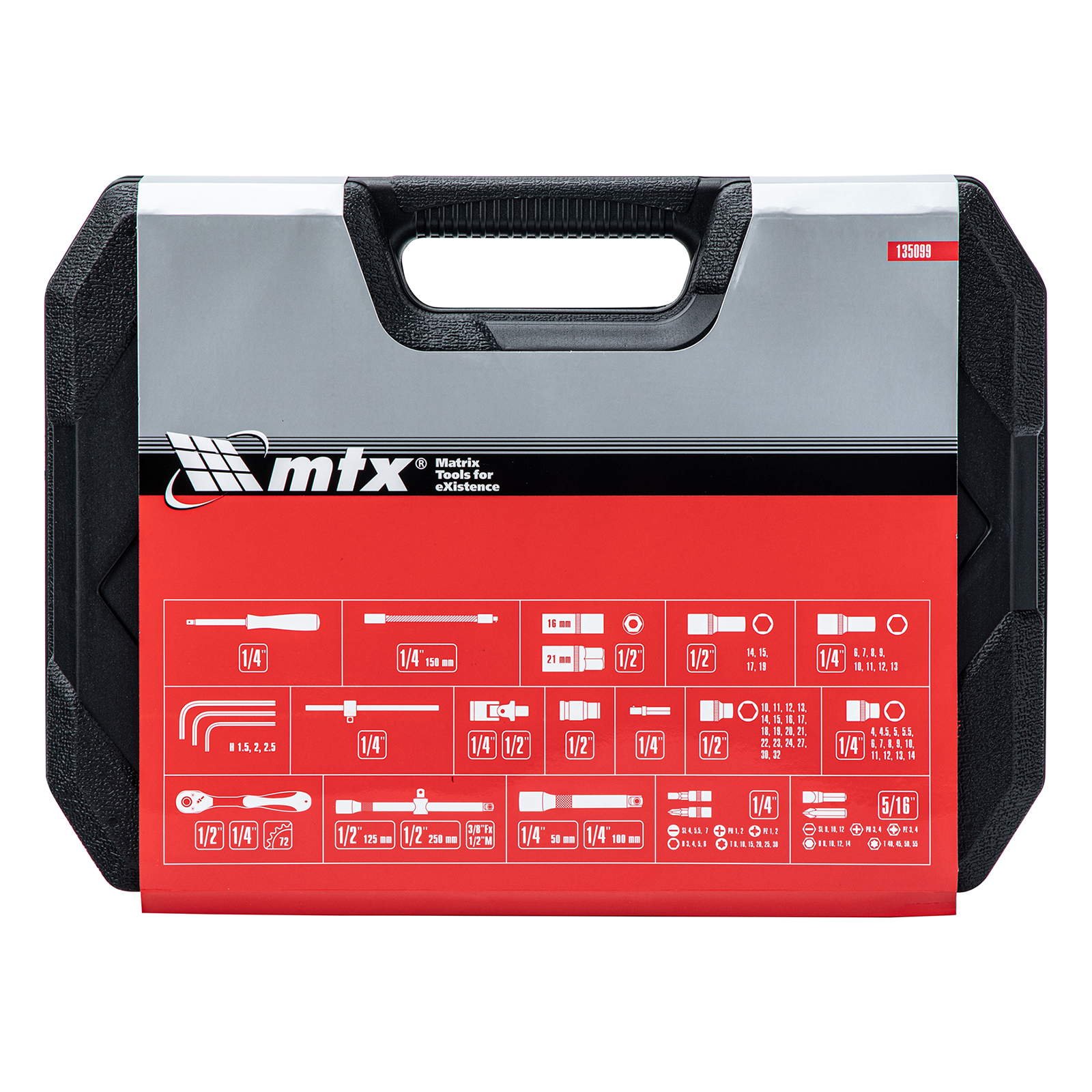 Набор инструментов MTX 135099 состоит из 94 предметов с присоединительными квадратами 1/2" и 1/4". Инструменты предназначены для монтажа и демонтажа резьбового крепежа с разными типами шлицев. В комплект поставки входят карданы, удлинители и переходники, облегчающие работу в труднодоступных местах. Набор используется для ремонта автомобилей, пригодится также в быту.