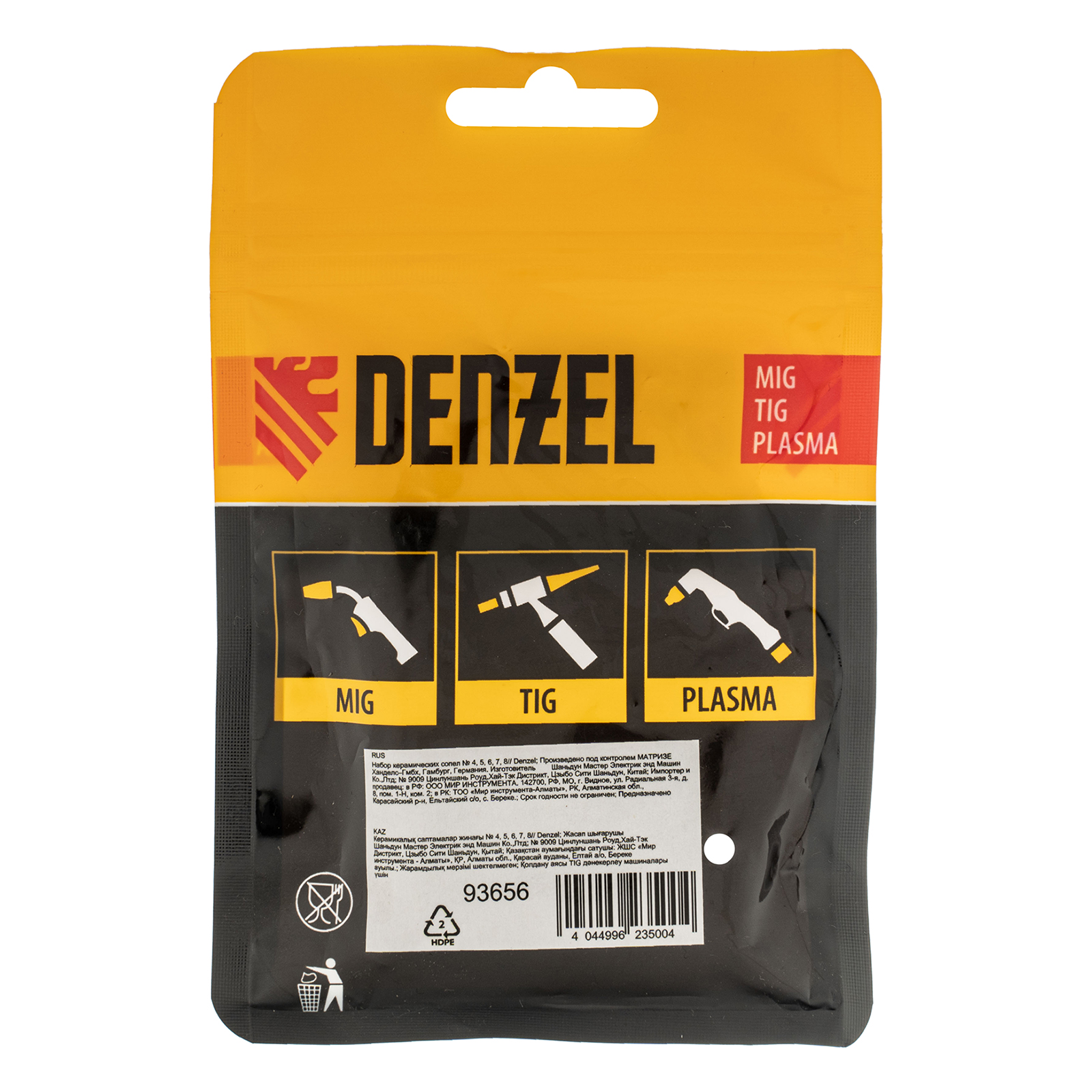 <p>Набор керамических сопел Denzel 93656 включает в себя оснастку № 4, 5, 6, 7, 8, предназначенную для формирования потока защитного газа во время проведения сварочных работ. Предотвращает поступление кислорода к свариваемому материалу и повышает качество сварного шва. Сопла совместимы с TIG-горелками Denzel 93643, 93644, а также с моделями других торговых марок с аналогичным посадочным разъемом.</p><h2>Преимущества</h2><ul><li>Огнеупорность — керамические сопла выдерживают длительное воздействие высокой температуры без риска разрушения.</li><li>Решение широкого спектра задач — в комплект поставки входит 5 сопел различного диаметра.</li><li>Быстрый поиск нужной оснастки — на корпус каждого сопла нанесена маркировка с обозначением номера.</li></ul>