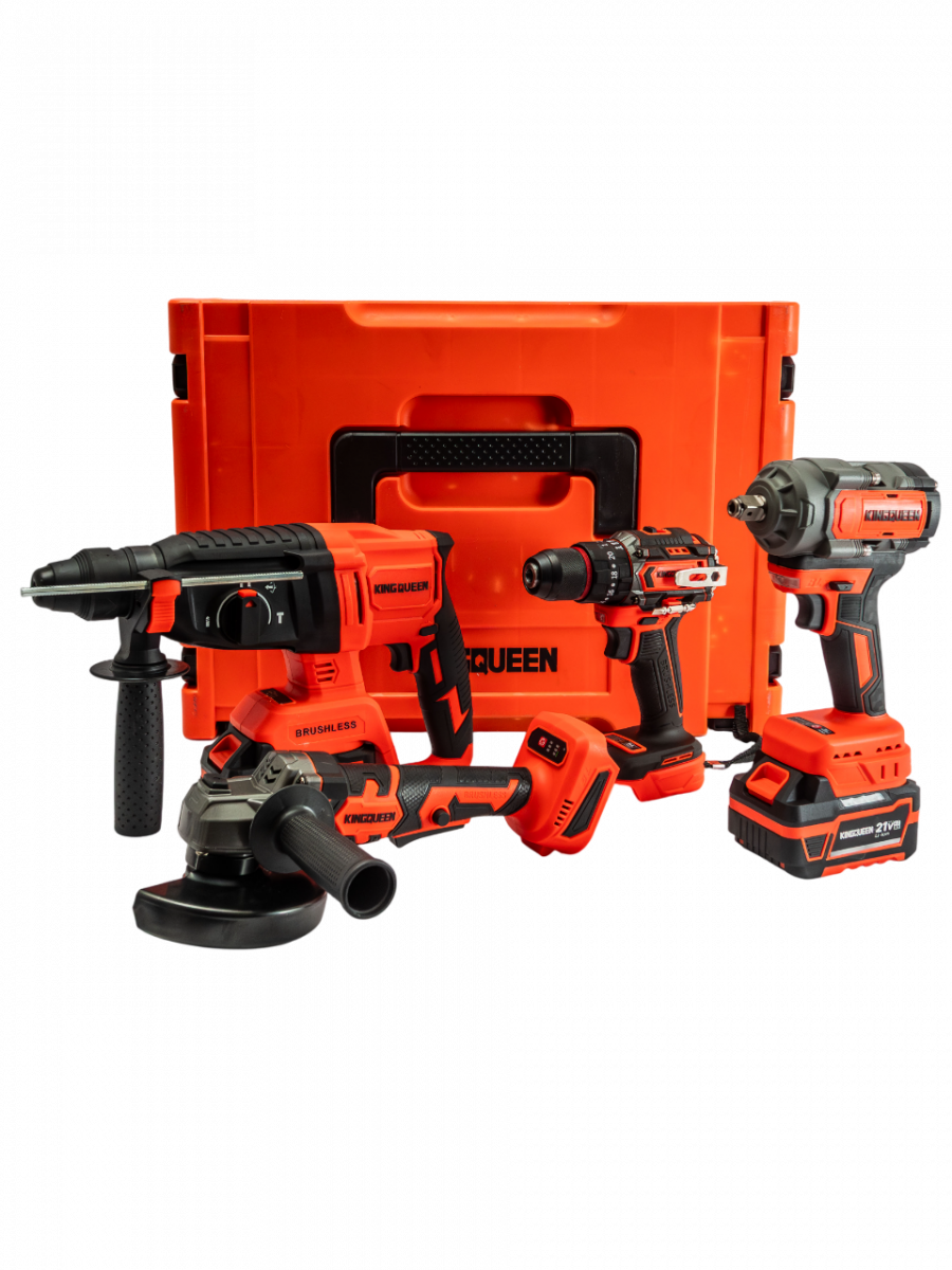 Набор KINGQUEEN 4 пред, 2 АКБ, (УШМ 125мм, Гайковерт 500Нм, Шуруповерт 50Нм, Перфоратор) KQ-TS411 обладает расширенной комплектацией и оснащен двумя аккумуляторами. Комплект предназначен для выполнения разнообразных строительных и монтажных работ: резки, сверления, закручивания крепежа и других задач. В набор входят УШМ 125 мм, гайковерт, шуруповерт и перфоратор. Инструменты благодаря единой аккумуляторной платформе обеспечивают максимальную мобильность и эффективность. Прочный кейс гарантирует безопасное и компактное хранение всего комплекта.