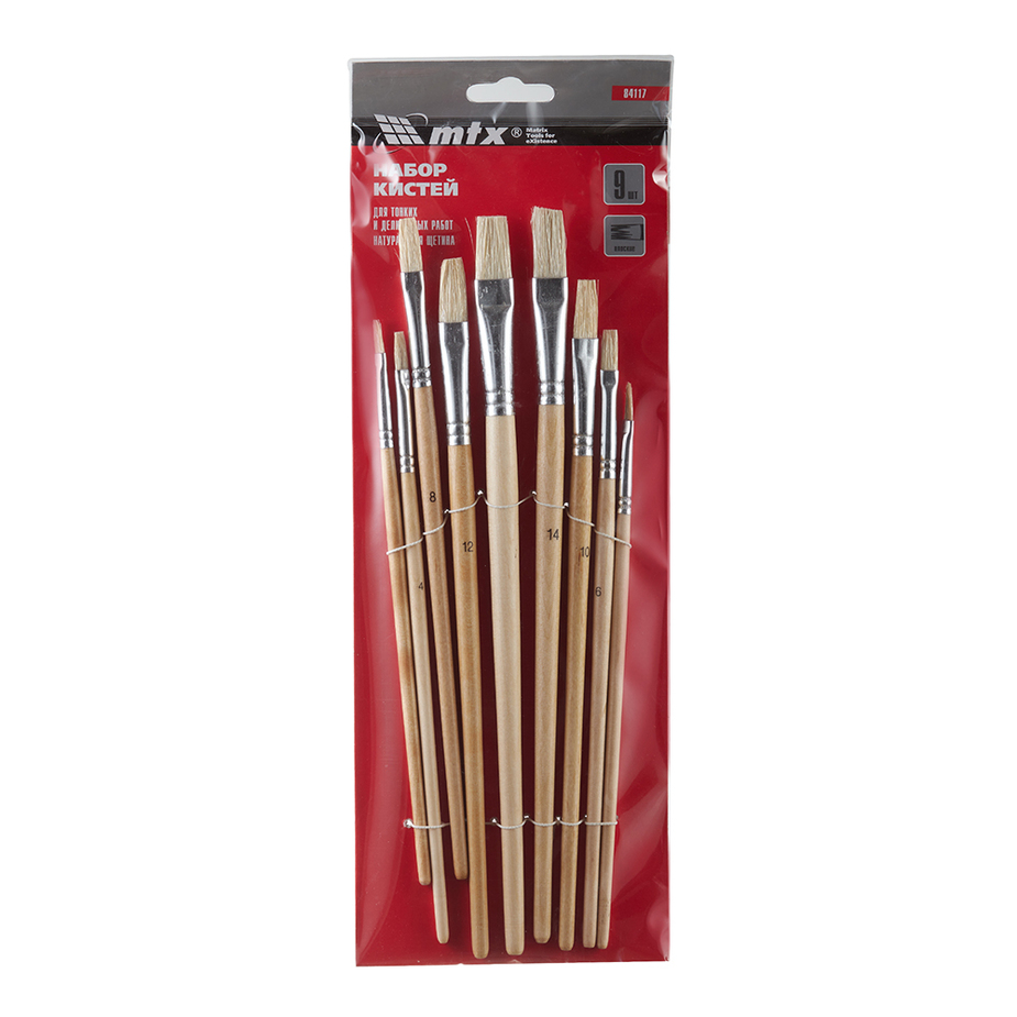 Набор из 9 плоских кистей MTX 84117 предназначен для выполнения тонких и деликатных работ. Оптимален для окрашивания небольших поверхностей и нанесения лакокрасочных материалов в труднодоступных местах. Кисти разного размера позволяют успешно решать различные творческие задачи. Набор используется для декорирования мебели, покраски стен, а также для трафаретной росписи или для подкрашивания мелких элементов.