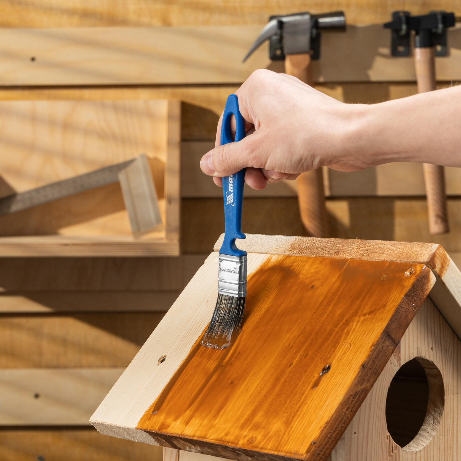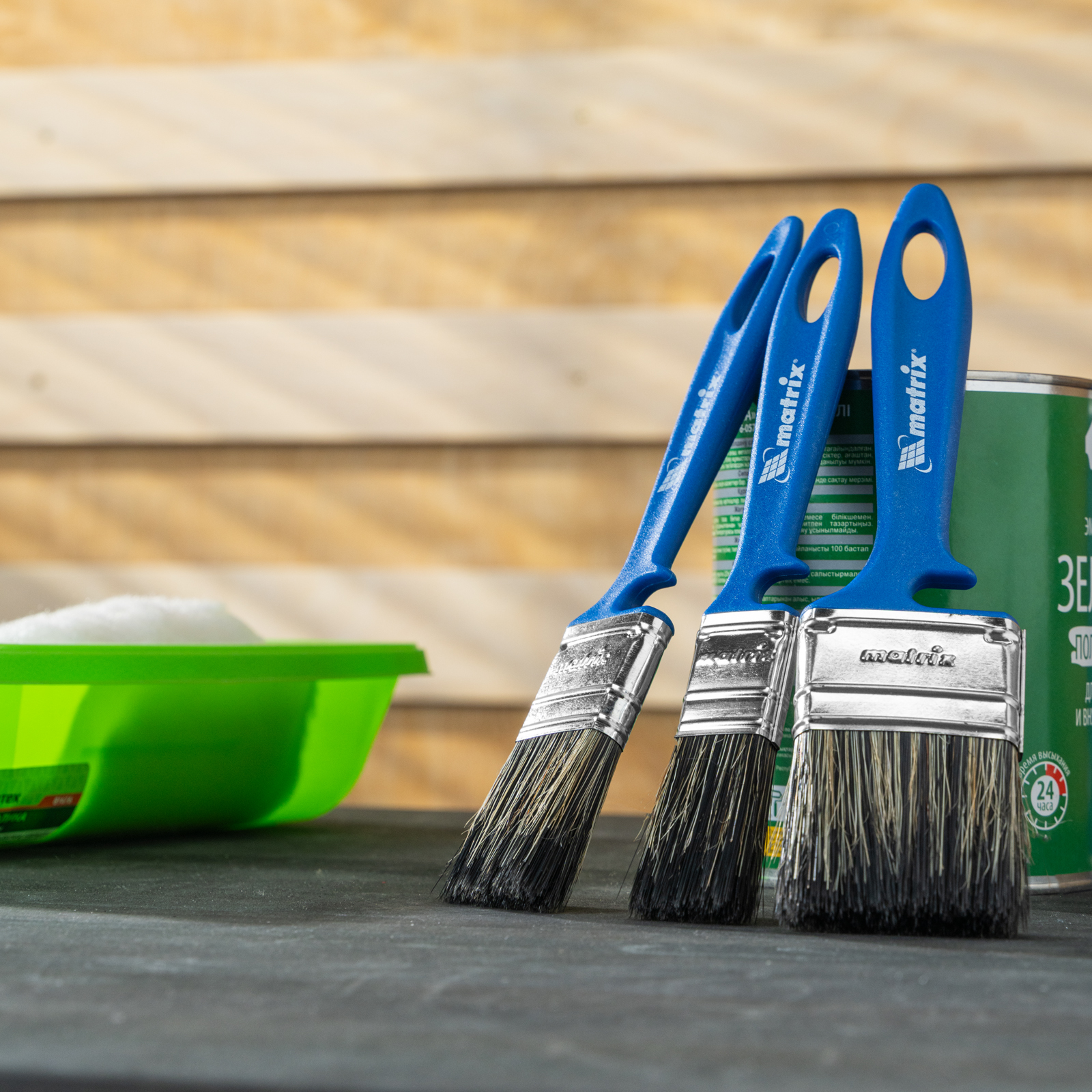 - Удобное хранение — специальная форма рукояток позволяет закреплять инструменты на краю банки или ведра, а отверстия в верхней части служат для