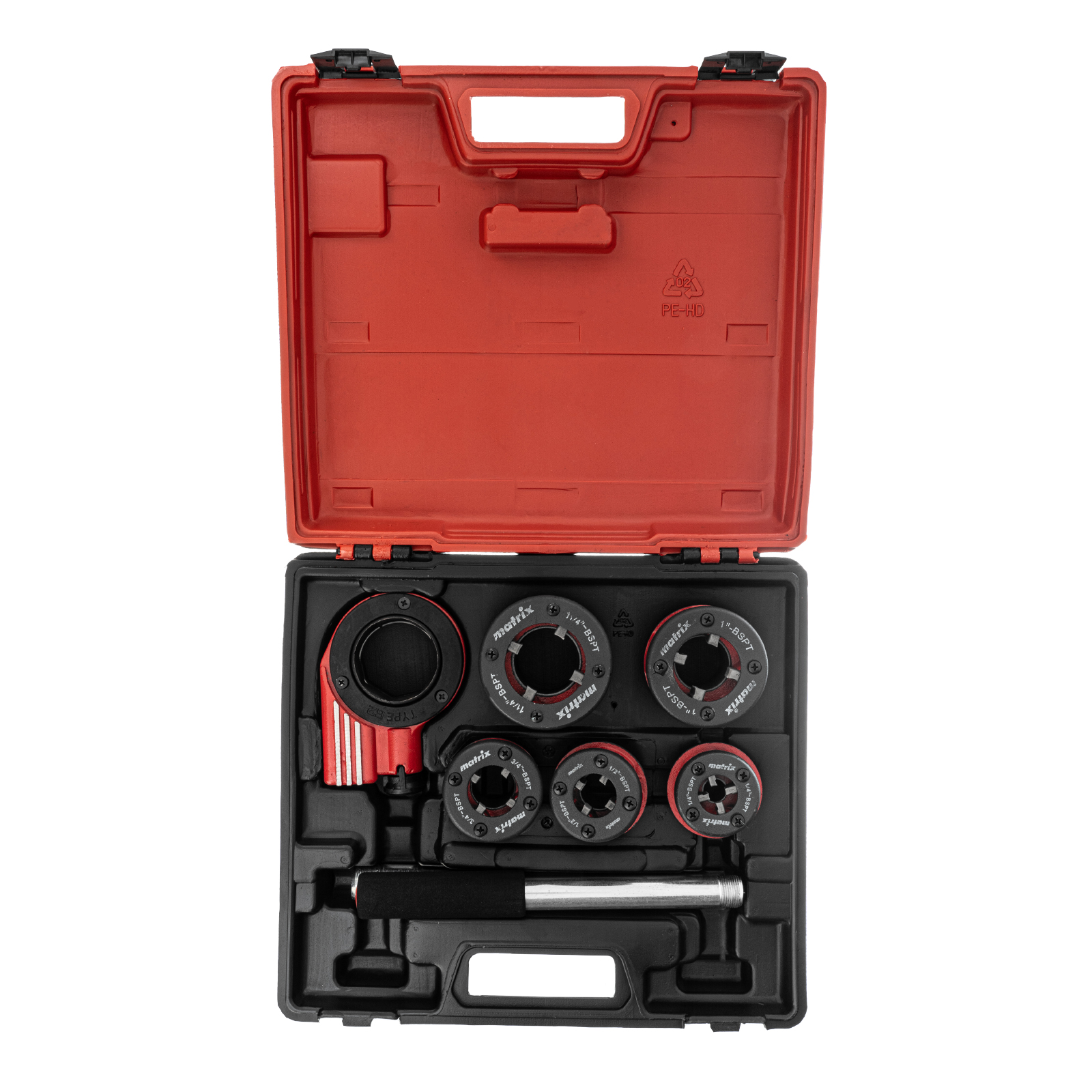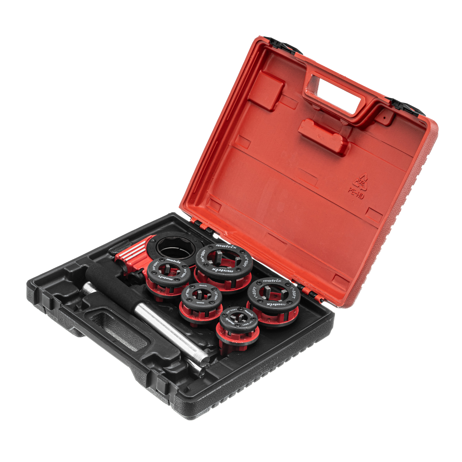 <p>Набор Matrix 77332 включает 8 предметов: клуппы и плашкодержатель с трещоткой, предназначенные для создания внешней резьбы на трубах, а также ремонта старых труб диаметром 1/4″, 1/2″, 3/4″, 1″, 1,25″. Клуппы с прочным корпусом пригодятся для проведения бытовых сантехнических работ с высокими нагрузками. Плашкодержатель с трещоткой эффективно передает прикладываемое усилие, а также упрощает работу в труднодоступных местах.</p><h2>Преимущества</h2><ul><li>Прочность — рабочая часть клуппов изготовлена из быстрорежущей стали 9XC.</li><li>Высокий ресурс — конструкция клуппов предусматривает возможность замены резцов.</li><li>Удобное хранение и транспортировка — набор поставляется в пластиковом боксе.</li></ul>
