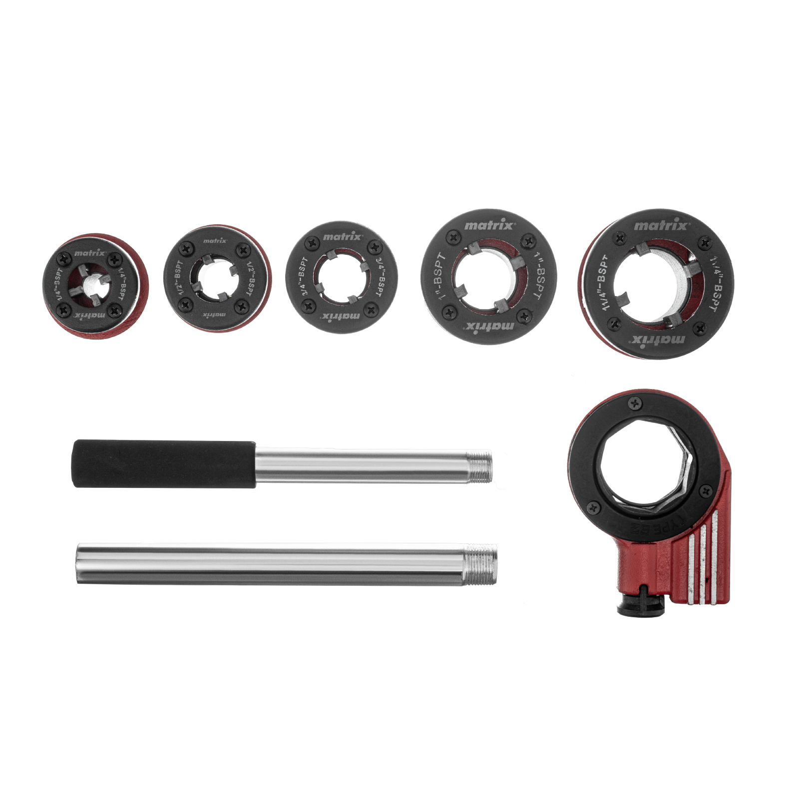 Набор Matrix 77332 включает 8 предметов: клуппы и плашкодержатель с трещоткой, предназначенные для создания внешней резьбы на трубах, а также ремонта старых труб диаметром 1/4″, 1/2″, 3/4″, 1″, 1,25″. Клуппы с прочным корпусом пригодятся для проведения бытовых сантехнических работ с высокими нагрузками. Плашкодержатель с трещоткой эффективно передает прикладываемое усилие, а также упрощает работу в труднодоступных местах.