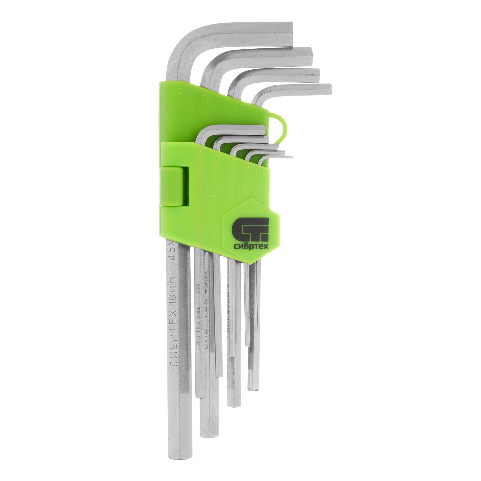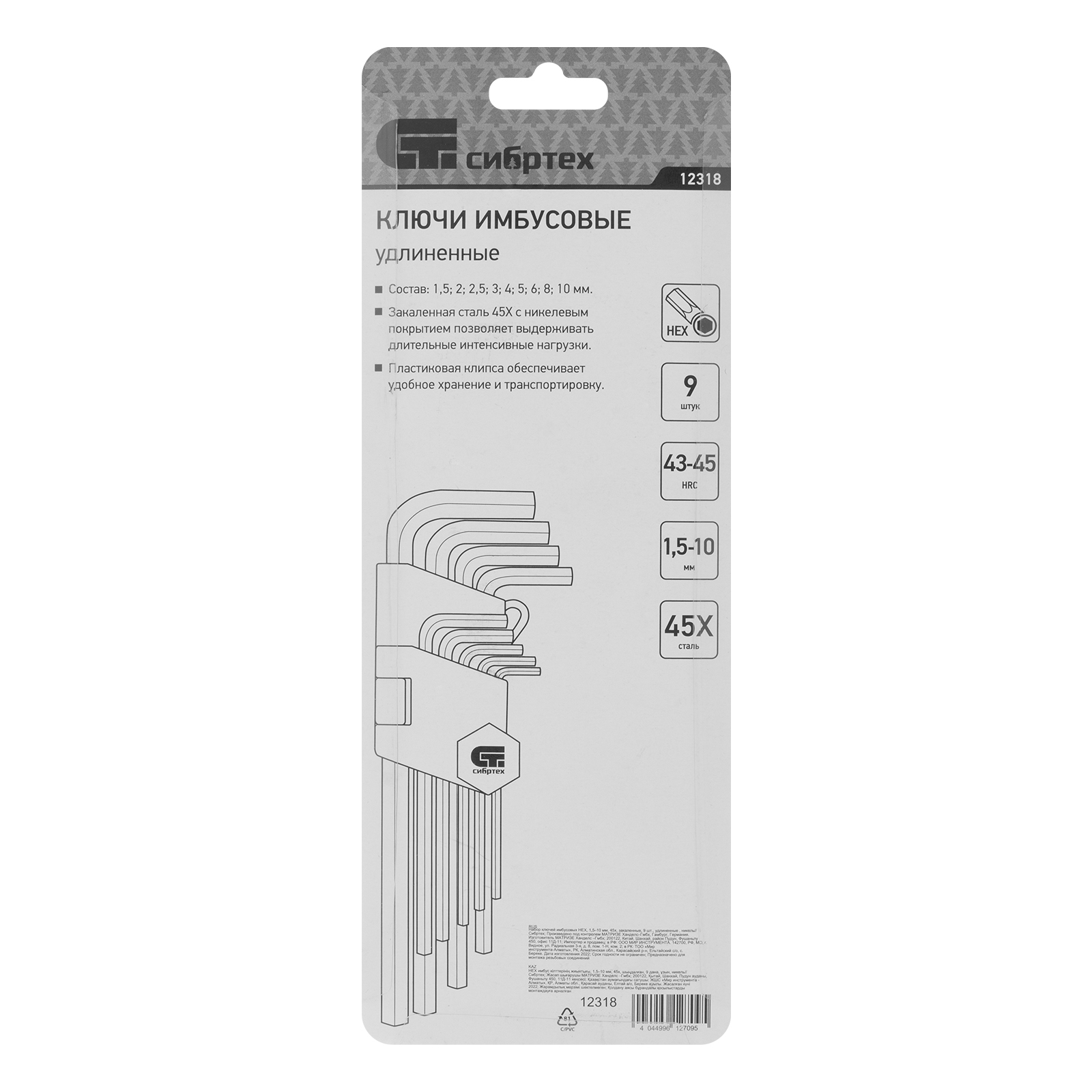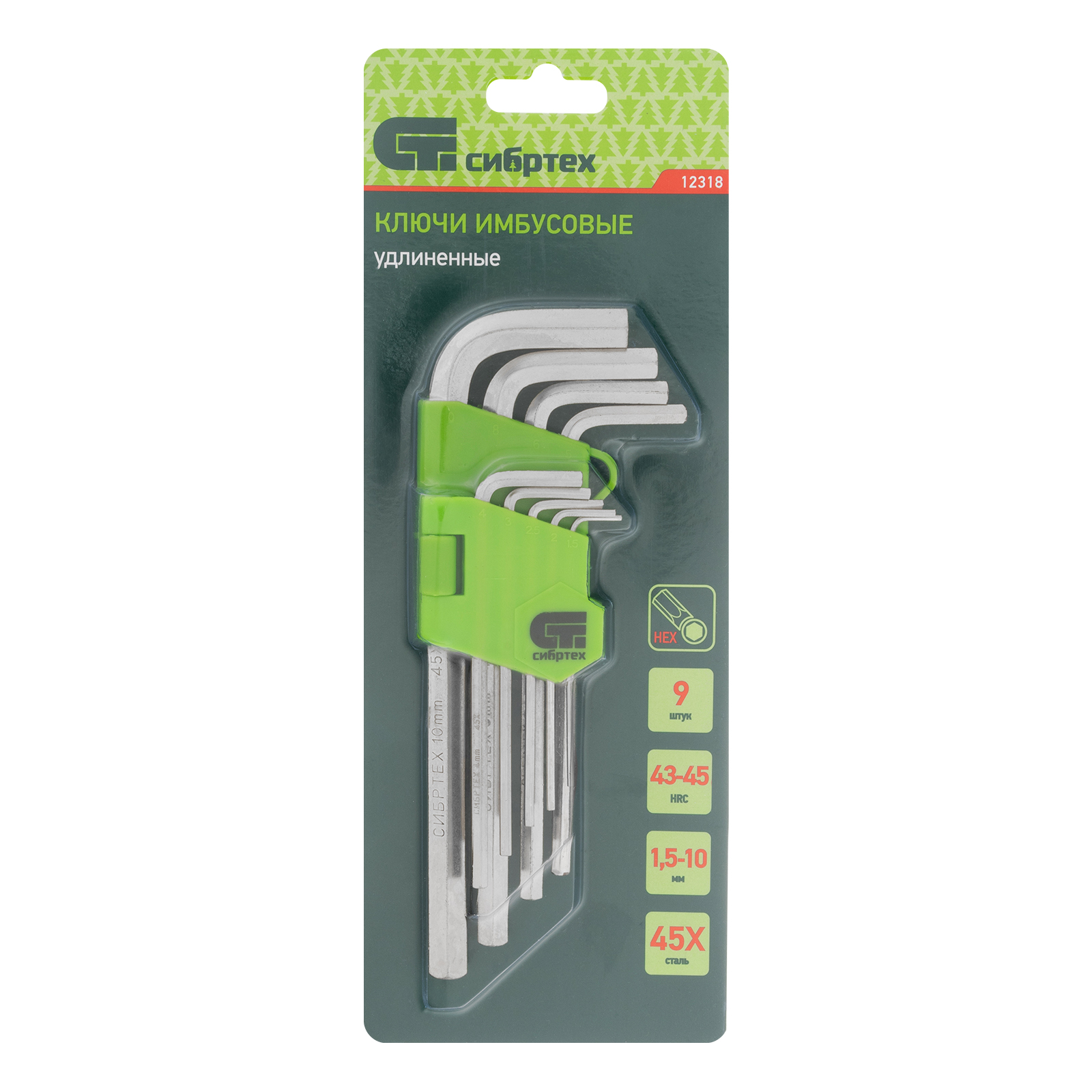 Набор удлиненных имбусовых ключей Сибртех 12318 из закаленной стали 45Х, покрытых никелем, 9 шт. в упаковке, используется для работы с евровинтами, имеющими шлиц HEX в виде внутреннего шестигранника. В комплекте 9 ключей размером от 1,5 до 10 мм, что обеспечивает широкие возможности применения набора. Он пригодится при сборке мебели, для ремонта велосипедов, установки и регулировки пластиковых окон.