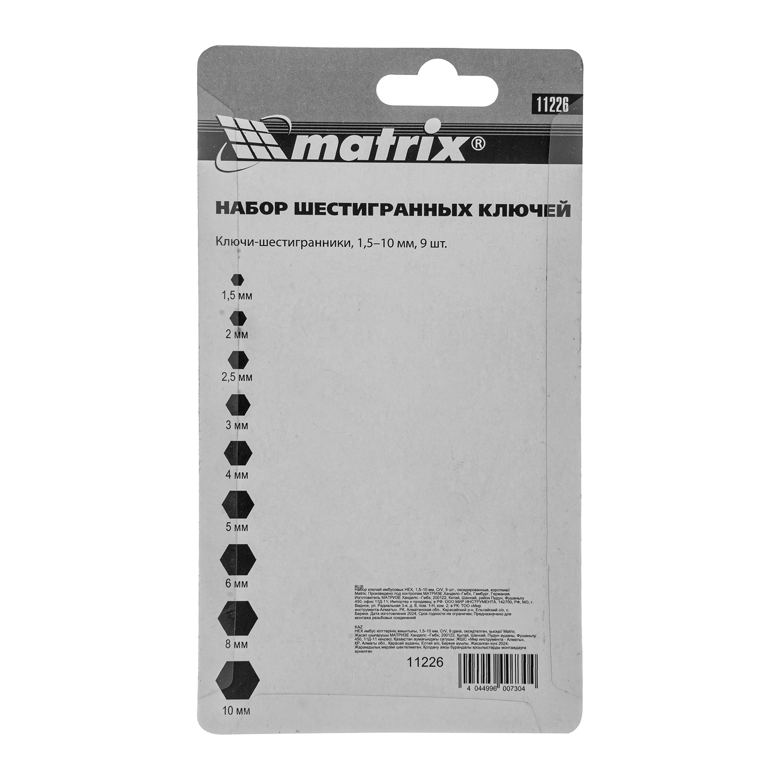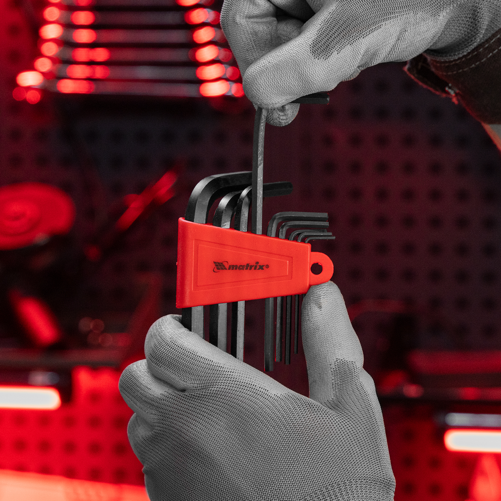 Набор Matrix 11226 из 9 коротких оксидированных имбусовых ключей размером 1,5-10 мм, из стали CrV, используется для монтажа и демонтажа крепежа со шлицем HEX. Шестигранники наиболее часто применяются для закручивания мебельных евровинтов и ремонта велосипедов. Г-образная форма ключей позволяет использовать их длинные части в качестве рабочих для удобного доступа в труднодоступные места.