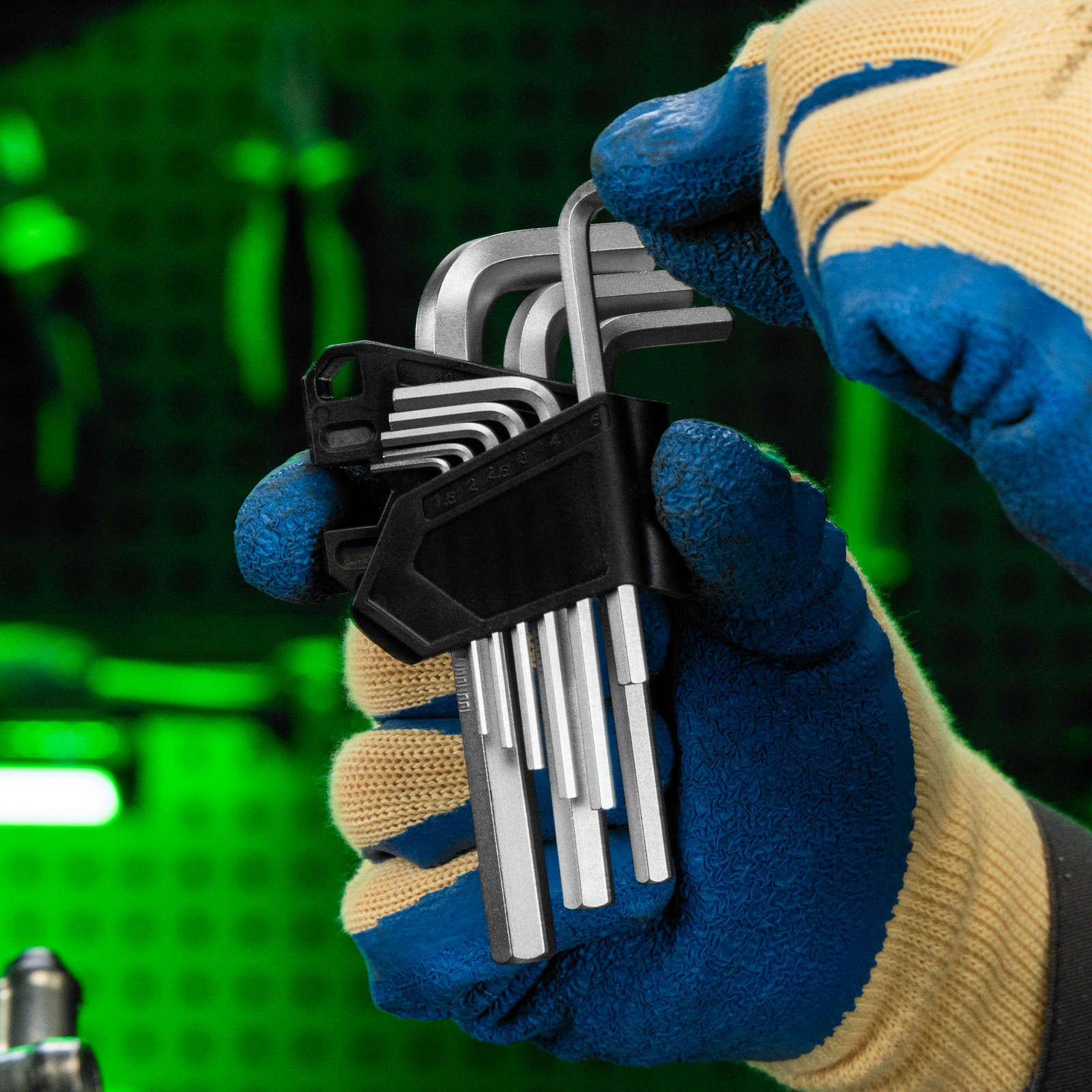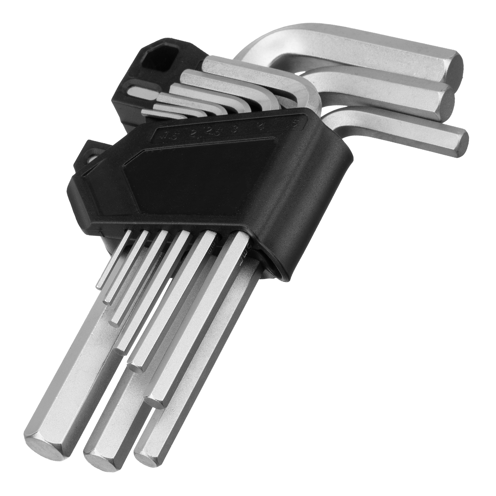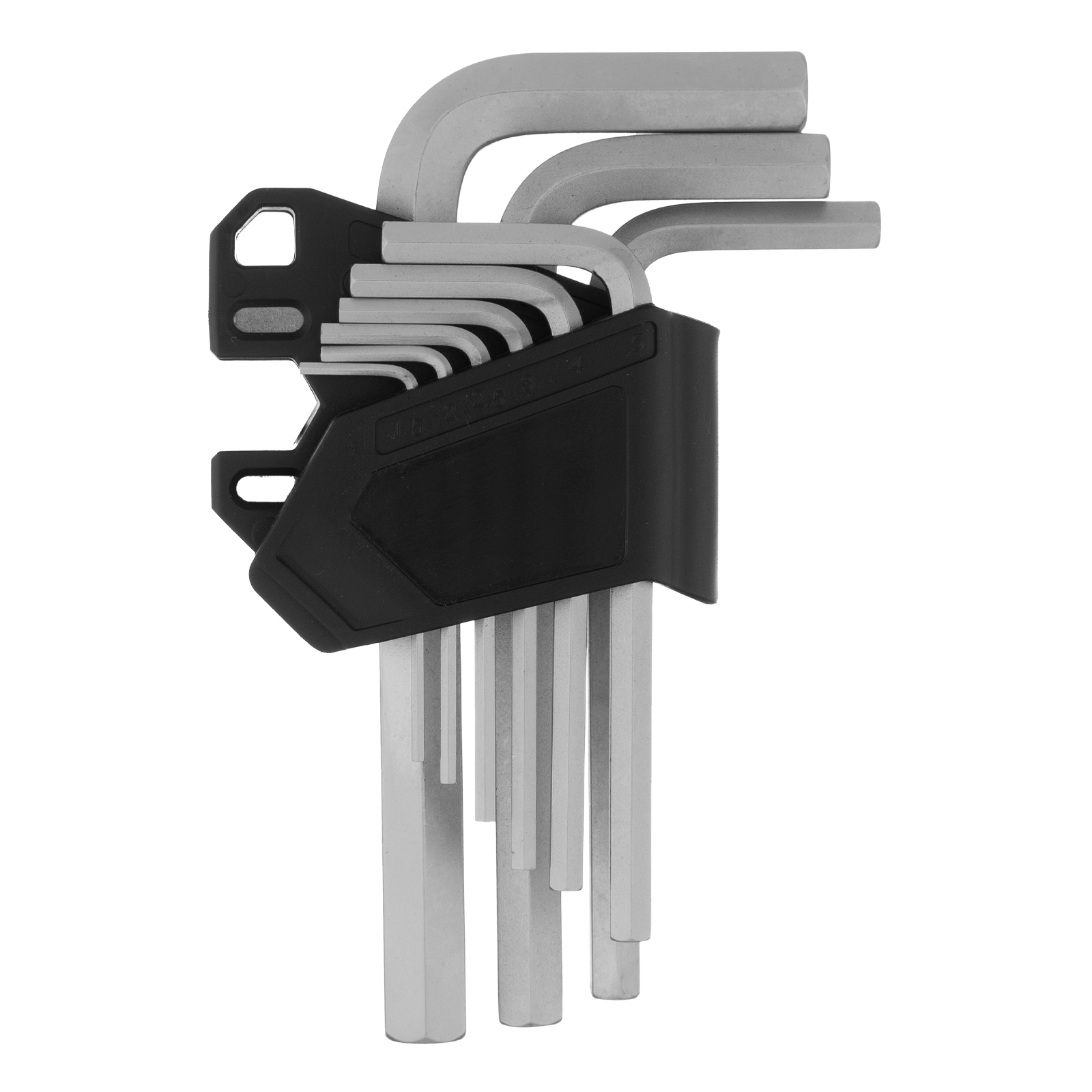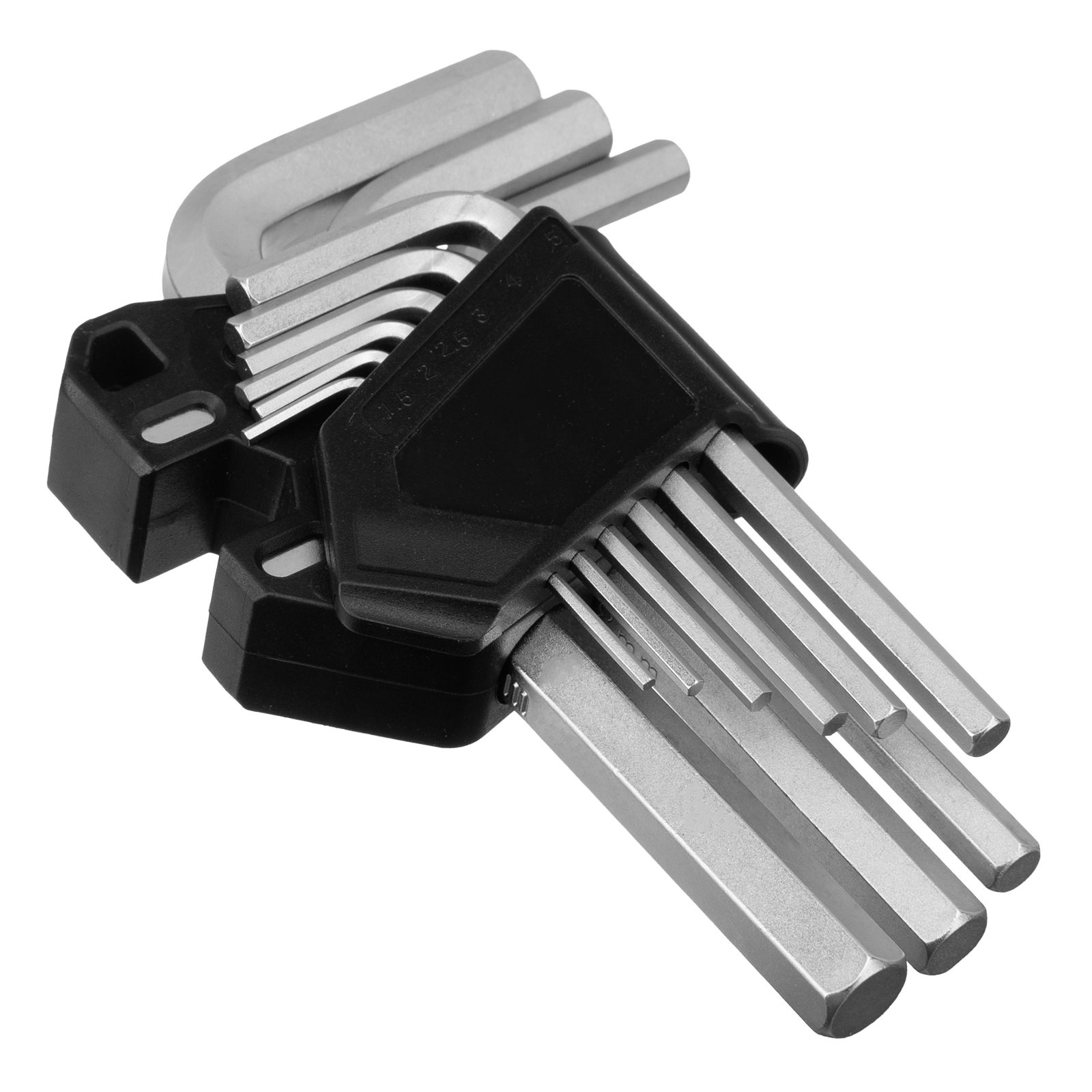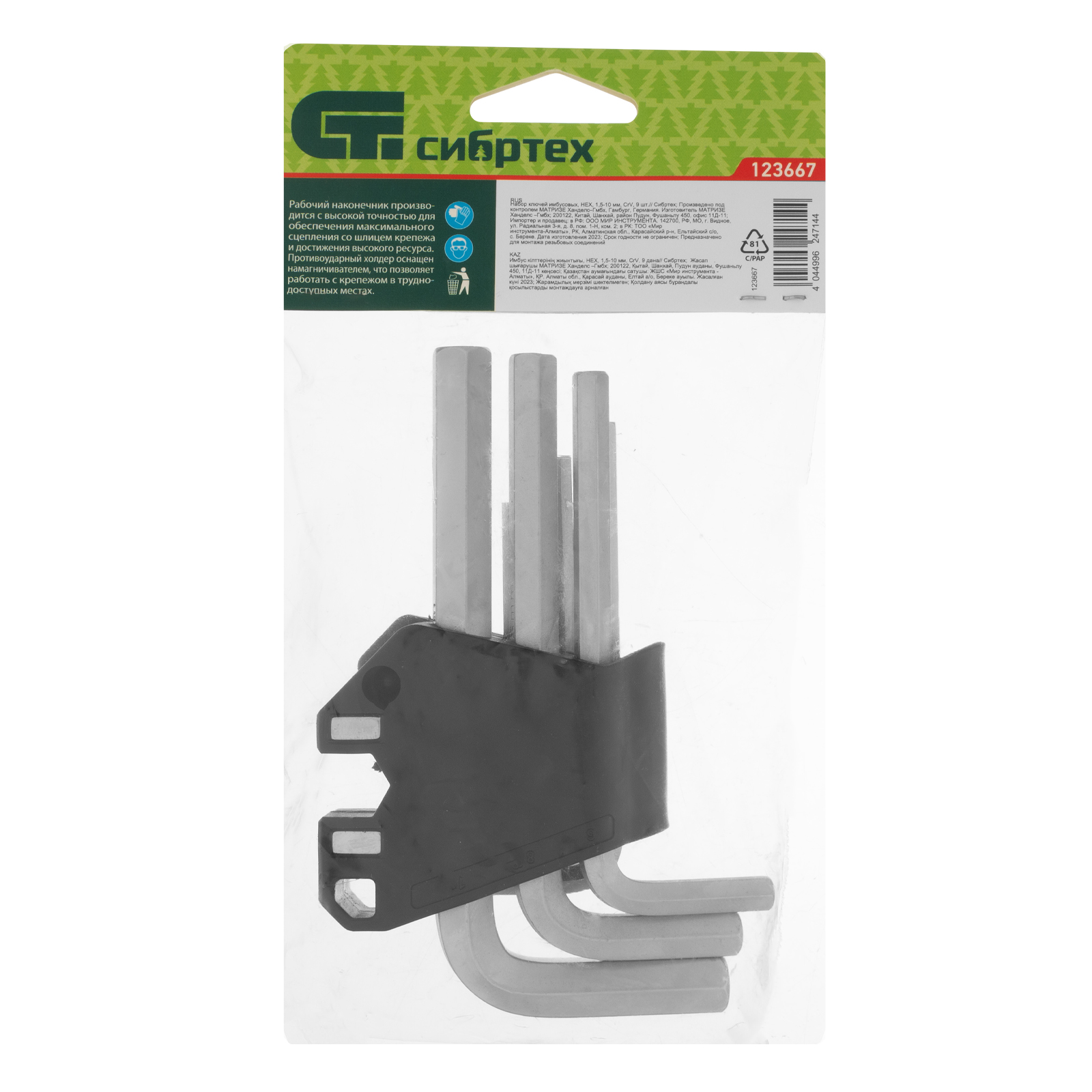 Набор Сибртех 123667 включает в себя 9 имбусовых ключей из стали CrV размером 1,5-10 мм, предназначенных для закручивания и откручивания крепежа со шлицем типа HEX. Набор пригодится для ремонта велосипедов, сборки мебели, установки и регулировки пластиковых окон.