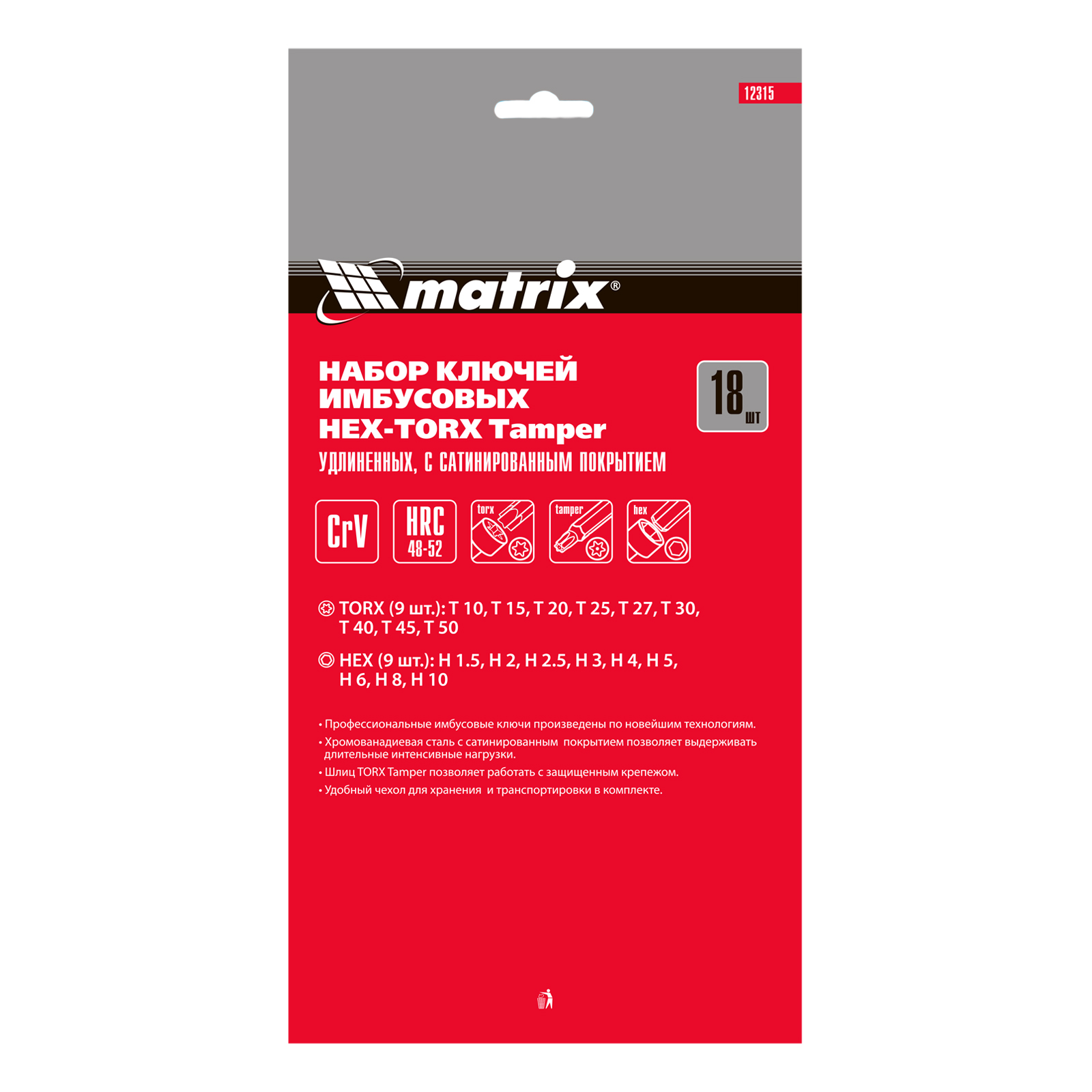 Набор Matrix 12315 включает 18 удлиненных сатинированных имбусовых ключей из стали CrV, применяющихся для монтажа и демонтажа резьбовых соединений с профилями HEX 1,5-10 мм и TORX Т10-Т50. Набор подходит для сборки мебели, ремонта велосипедов, бытовой техники и решения других задач. Две рабочие части и Г-образный удлиненный профиль облегчают работу в труднодоступных местах.