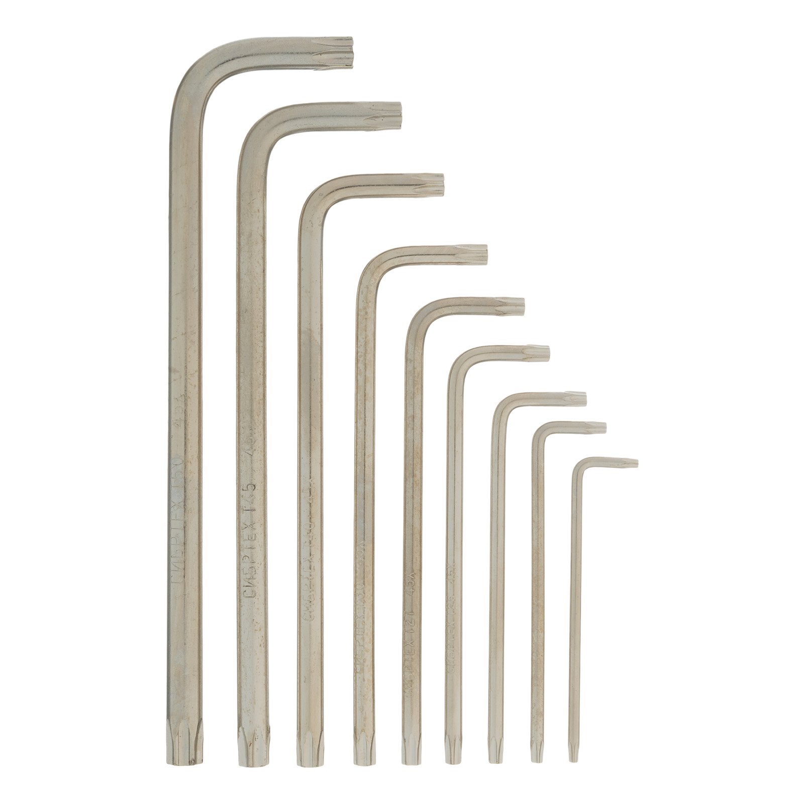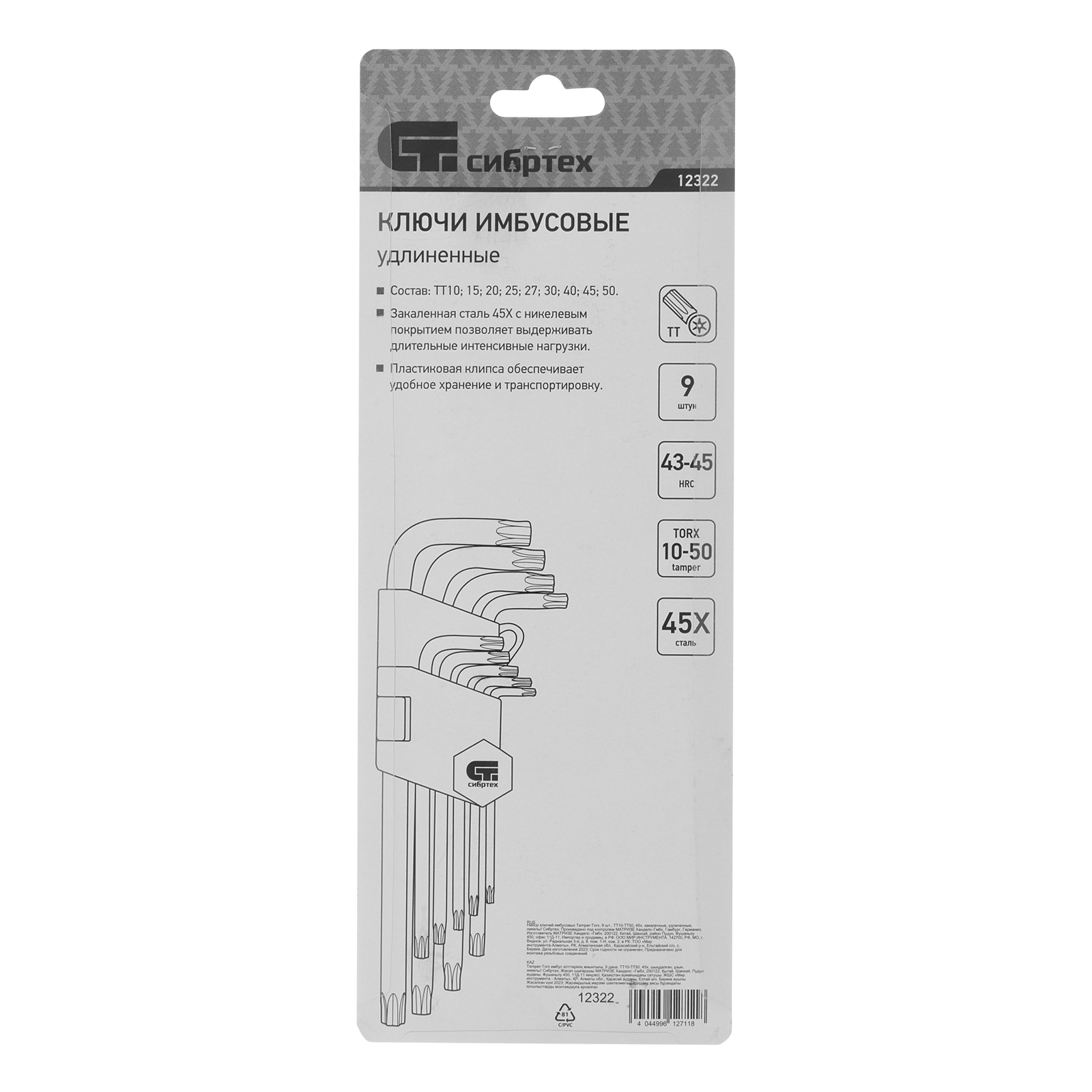 Набор Сибртех 12322 состоит из 9 удлиненных имбусовых ключей TT10-TT50, выполненных из закаленной стали 45Х. Предназначен для работы со специализированными крепежами, оснащенными шлицами Tamper-Torx. Ключи размером от TT10 до TT50 используются для разборки и сборки оборудования, защищенного от несанкционированного вмешательства пользователя, — например, аккумуляторных отсеков электроинструмента или бытовой техники.