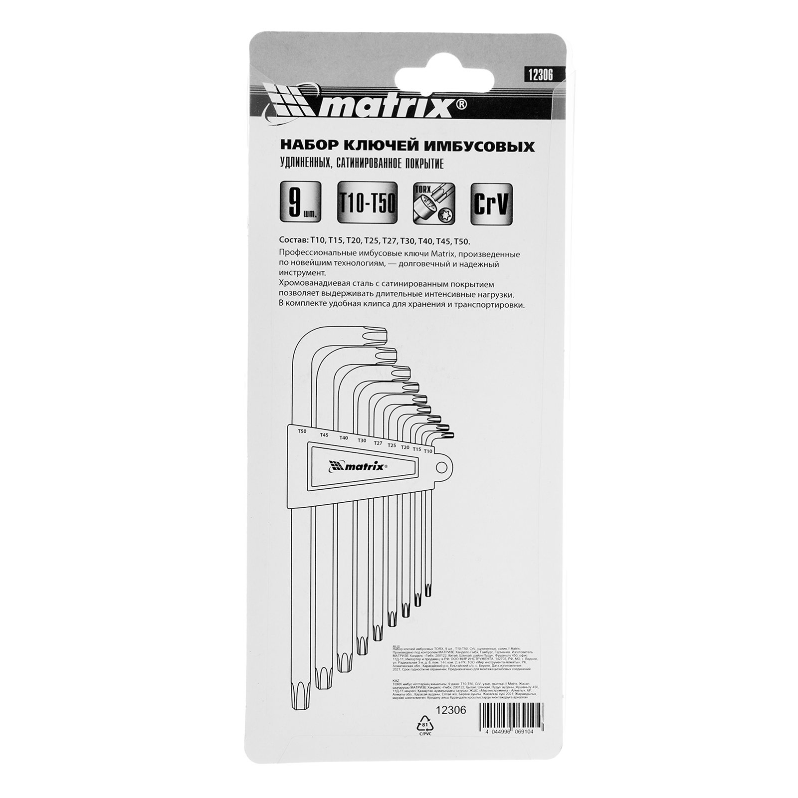 Набор удлиненных имбусовых ключей TORX Matrix 12306, сатинированный, 9 шт. из стали CrV, используется для работ с крепежом Т10-Т50, имеющим звездообразный профиль. Пригодится частному мастеру для ремонта бытовой техники и электроприборов. Каждый ключ имеет 2 рабочих конца, что удобно для работы в труднодоступных местах.