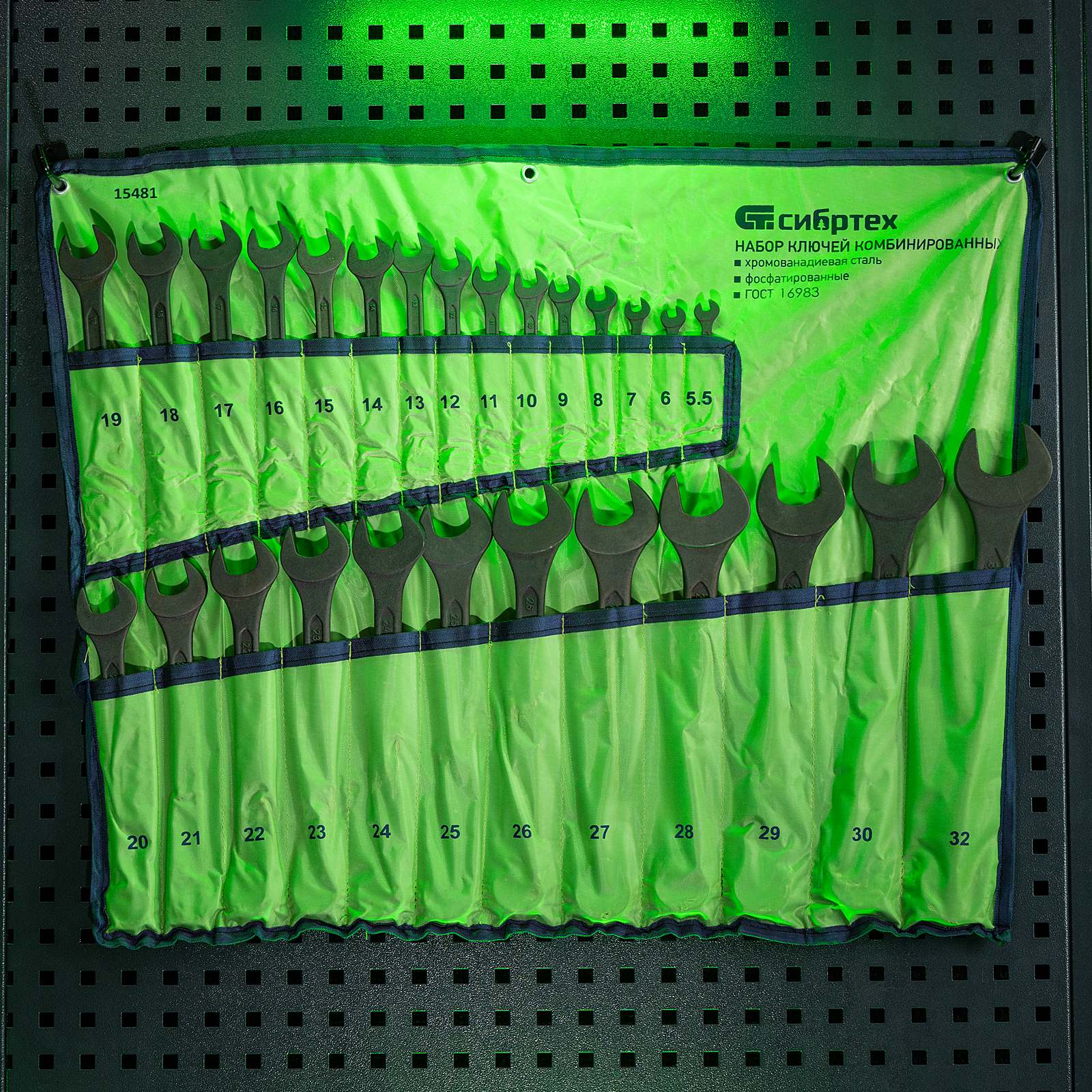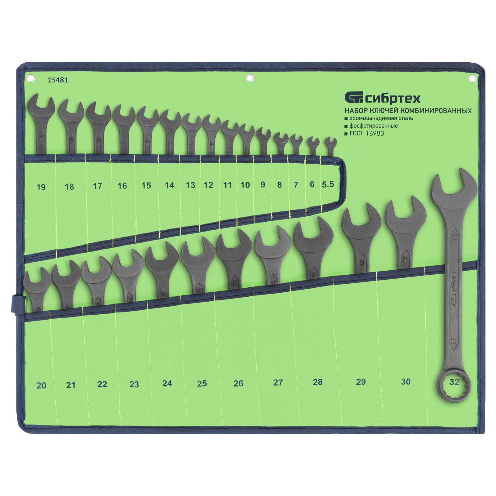 <p>Набор комбинированных ключей Сибртех 15481 включает 27 инструментов из стали CrV, с фосфатированной поверхностью, соответствующих ГОСТ 16983, и предназначен для откручивания и закручивания крепежа размером 5,5-32 мм с 6-гранным или 12-гранным профилем головки. Внутренняя поверхность кольцевого зева с 12 гранями обеспечивает плотный контакт с головкой крепежа, что предотвращает деформацию ее граней. Ключи используются для слесарно-монтажных работ, будут полезны в строительстве, во время ремонта, а также пригодятся дома или в гараже.</p><h2>Преимущества</h2><ul><li>Высокая прочность — инструменты изготовлены из хромованадиевой стали по технологии горячей ковки.</li><li>Износостойкость — ключи прошли закалку и отпуск, твердость рабочих частей составляет 42-47 HRC.</li><li>Защита от разрушения — поверхность инструментов фосфатирована для предотвращения образования коррозии.</li></ul>
