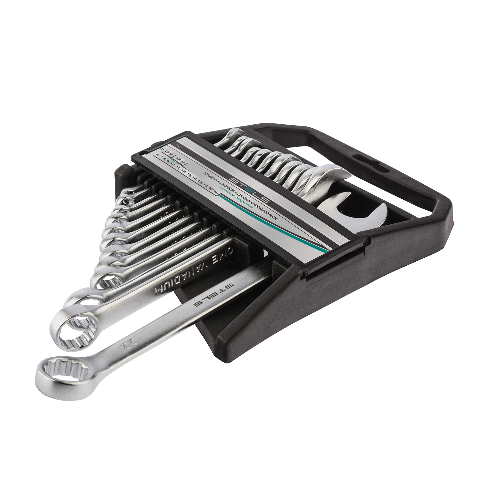 Набор Stels 15429 включает 12 комбинированных ключей из стали CrV, размером от 6 до 22 мм, покрытых матовым хромом, и используется для закручивания и откручивания гаечных и болтовых соединений. Накидная головка каждого ключа имеет 12-гранную внутреннюю поверхность, что облегчает работу с крепежом и уменьшает опасность его повреждения. Ключи применяются в слесарных мастерских и автосервисах, а также будут полезны для решения бытовых задач.