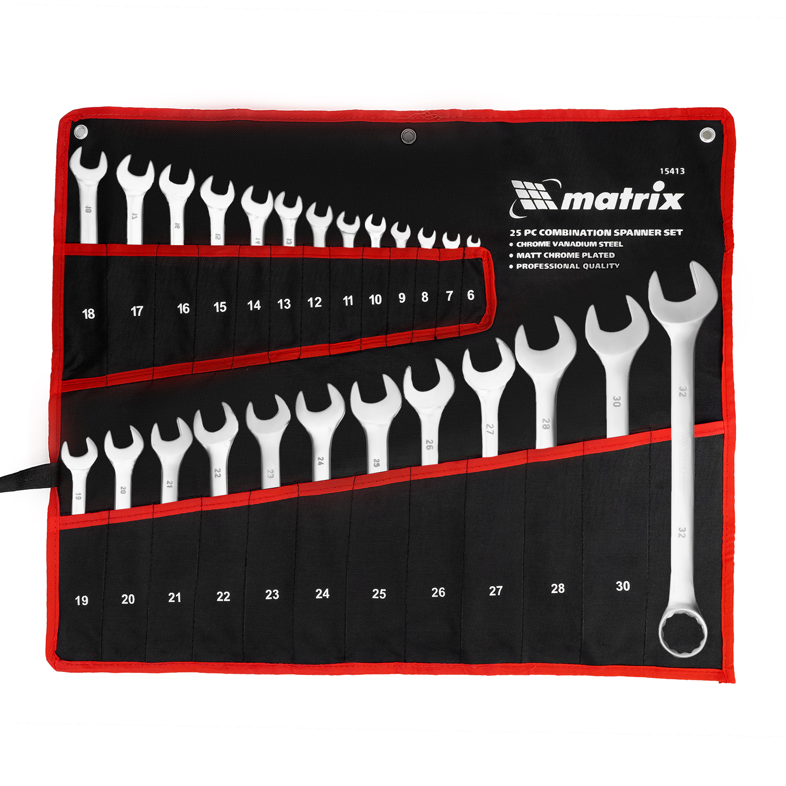 Набор Matrix 15413 включает 25 комбинированных ключей из стали CrV, размером 6-32 мм, с покрытием «матовый хром», которые пригодятся во время ремонтных работ дома или в гараже. С их помощью можно быстро монтировать и демонтировать крепежные элементы. В набор входят инструменты основных типоразмеров, позволяющие эффективно решать поставленные задачи.