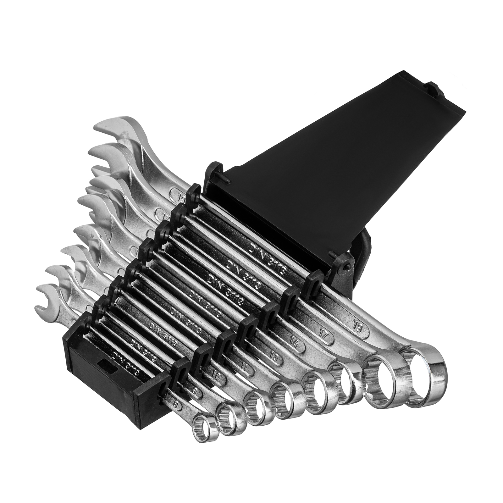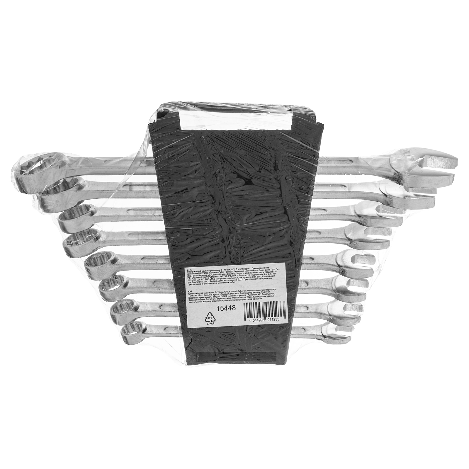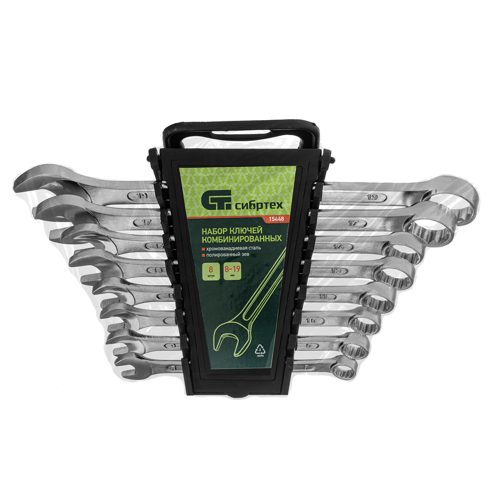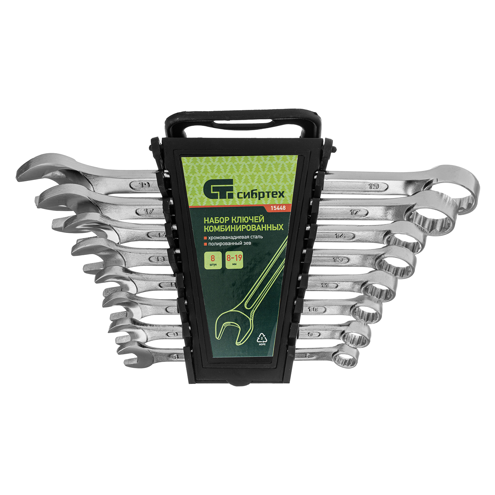 Набор комбинированных ключей Сибртех 15448 включает в себя 8 инструментов из стали CrV для работы с резьбовыми крепежами диаметром от 8 до 19 мм. Каждый ключ снабжен рожковым и 12-гранным кольцевым зевом, который максимально плотно соприкасается с поверхностью гайки или болта — это уменьшает риск ее деформации. Набор незаменим при ремонте автомобиля, а также будет полезен для сборки техники или решения бытовых задач.