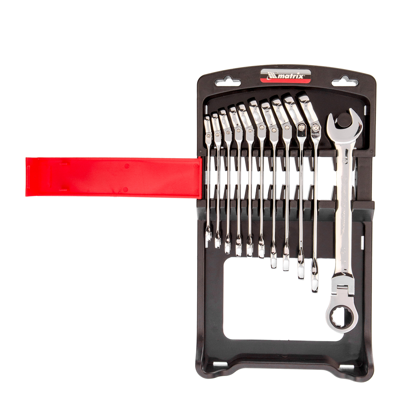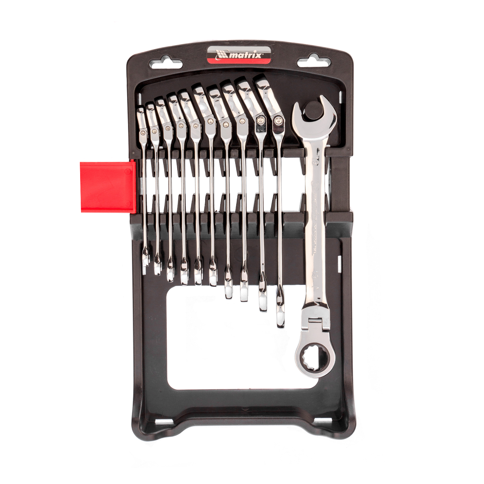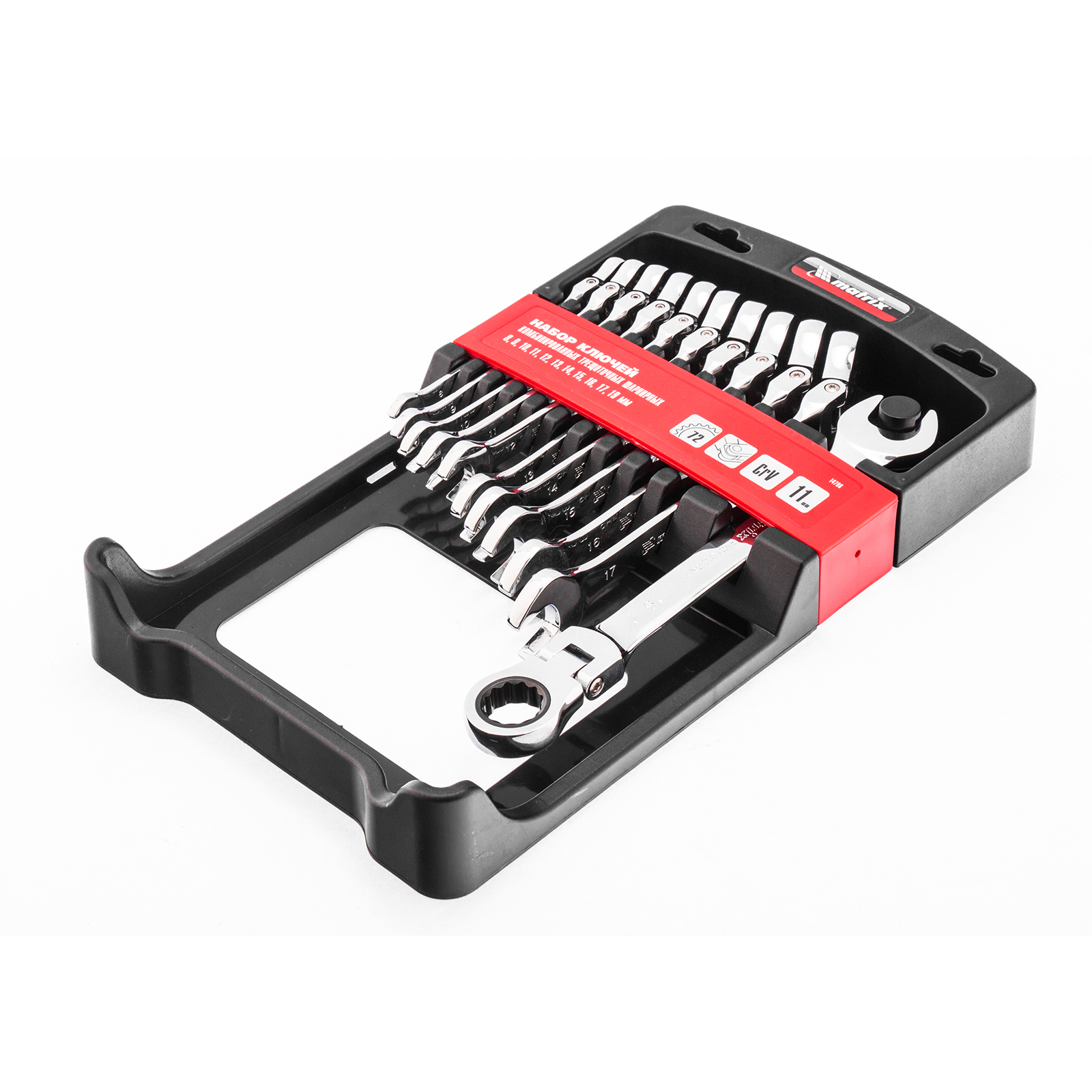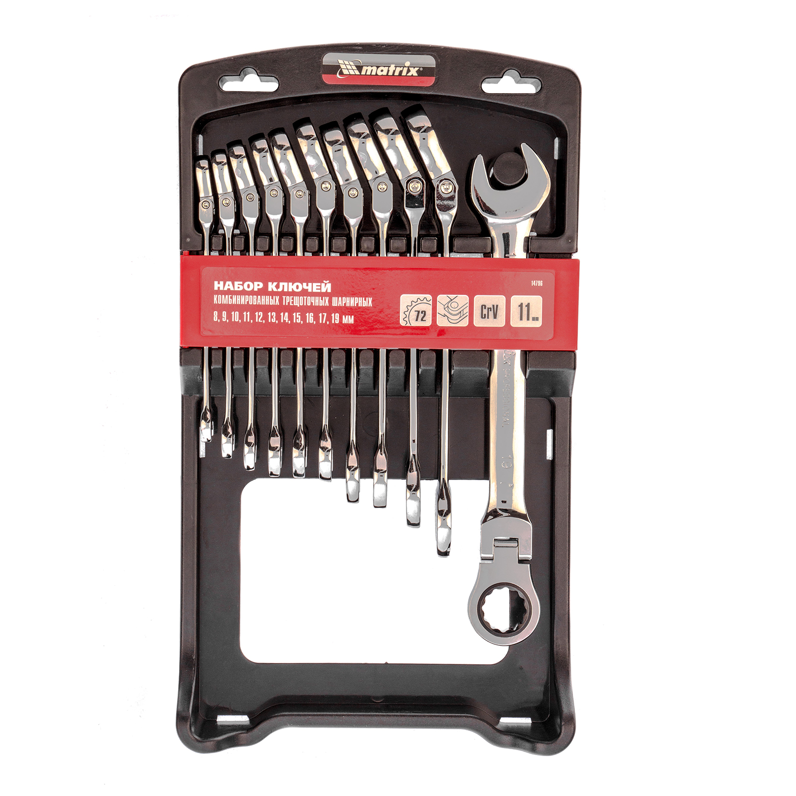 Набор из 11 комбинированных трещоточных шарнирных ключей Matrix 14796 пригодится мастерам и автолюбителям для фиксации и раскручивания крепежных элементов. Трещоточный механизм повышает скорость работы и легко справляется даже с закисшим крепежом.