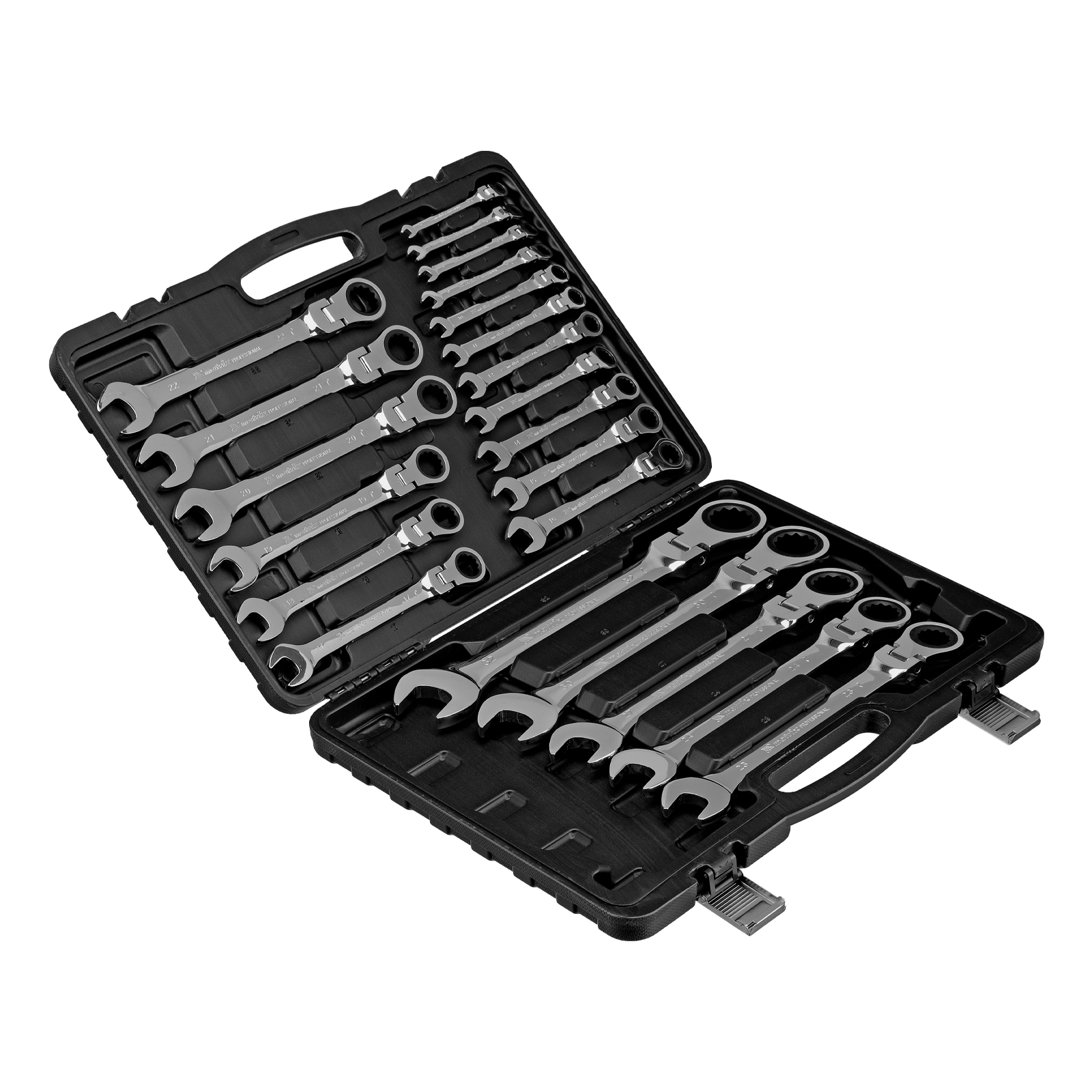 - Быстрый поиск нужного инструмента — в наборе 22 ключа на 6, 7, 8, 9, 10, 11, 12, 13, 14, 15, 16, 17, 18, 19, 20, 21, 22, 23, 24, 27, 30, 32 мм с нанесенной на корпус маркировкой типоразмера.