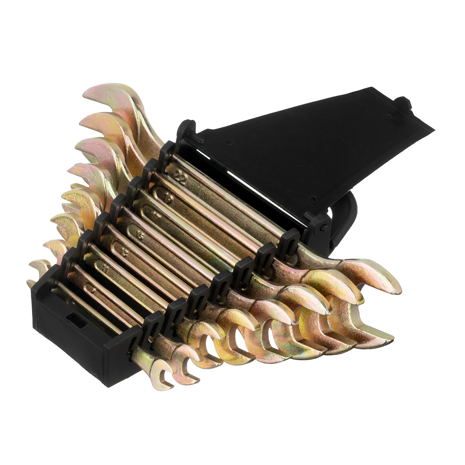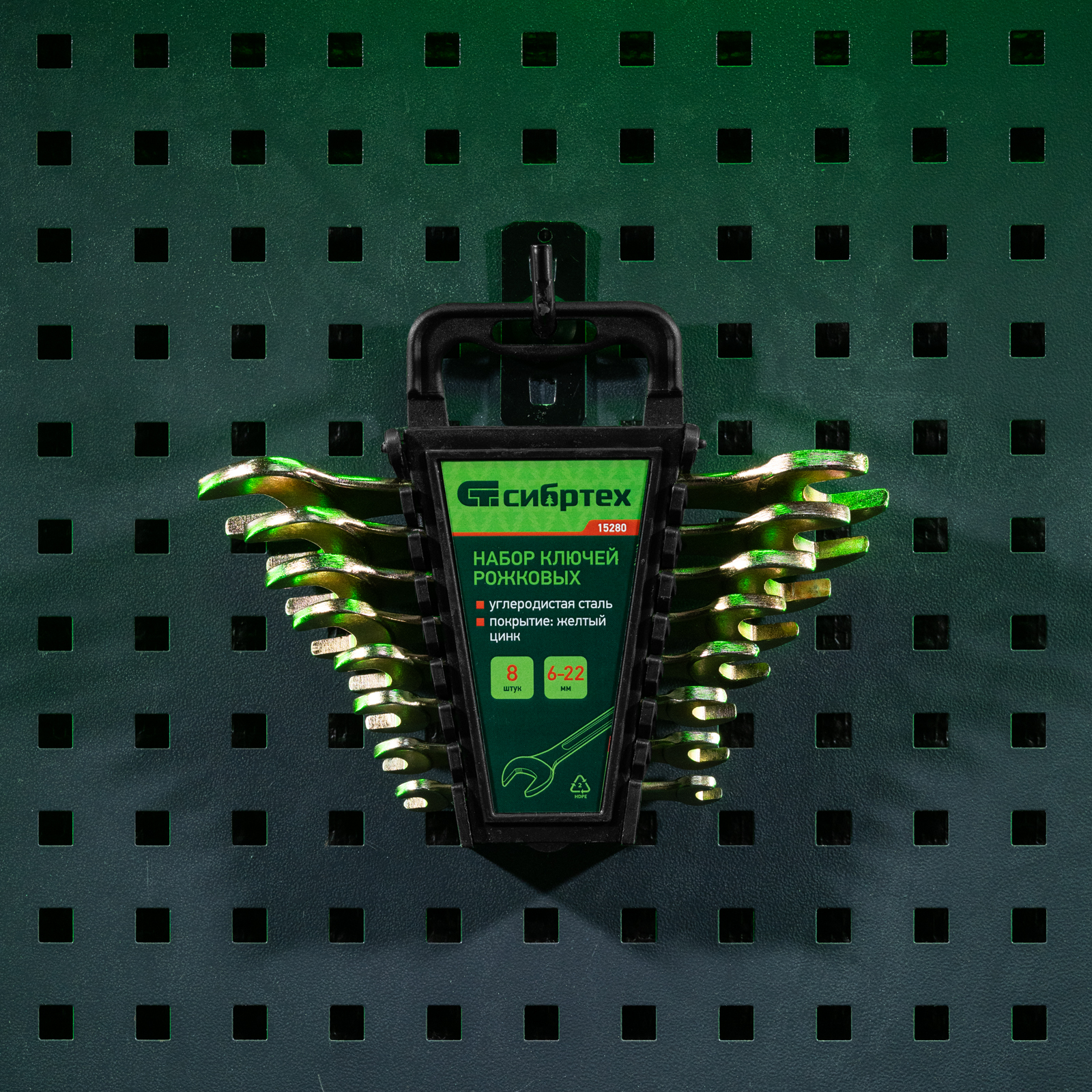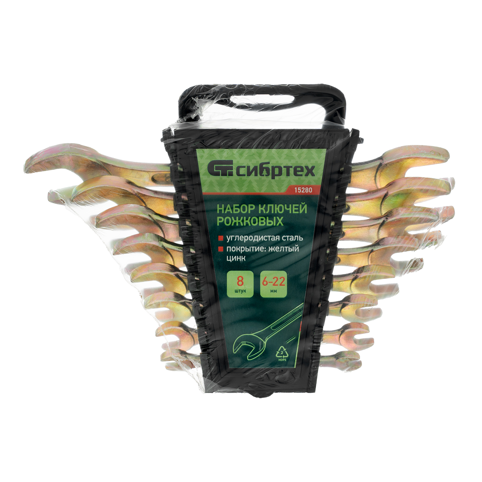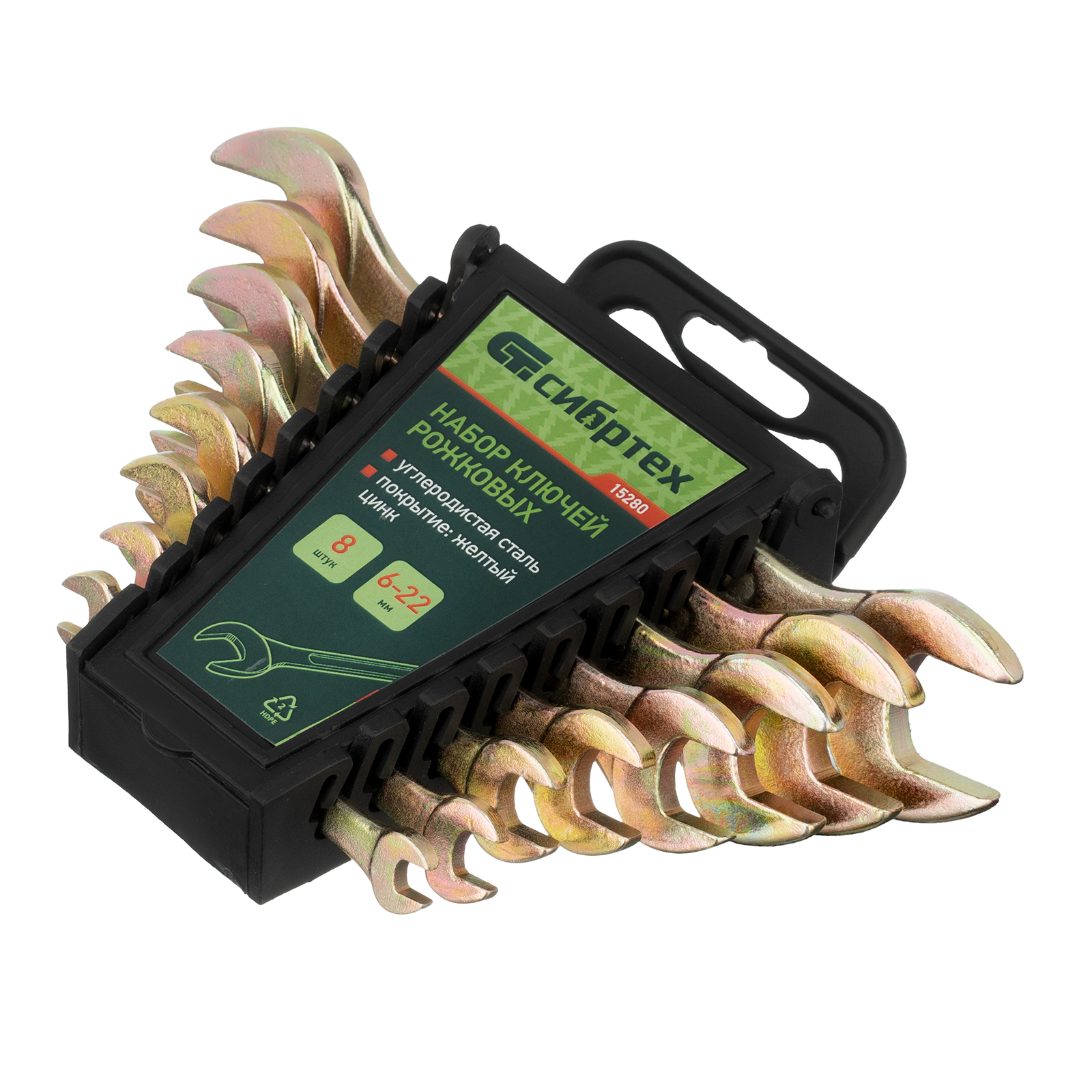 Набор рожковых ключей Сибртех 15280 размером 6-22 мм, с покрытием «желтый цинк», 8 штук в упаковке, используется для монтажа и демонтажа шестигранного резьбового крепежа соответствующего диаметра. Каждый ключ имеет две рабочие части с разным размером зева. Набор будет полезен в сервисном центре, авторемонтной мастерской, при выполнении монтажных работ. Пригодится также дома и на даче.