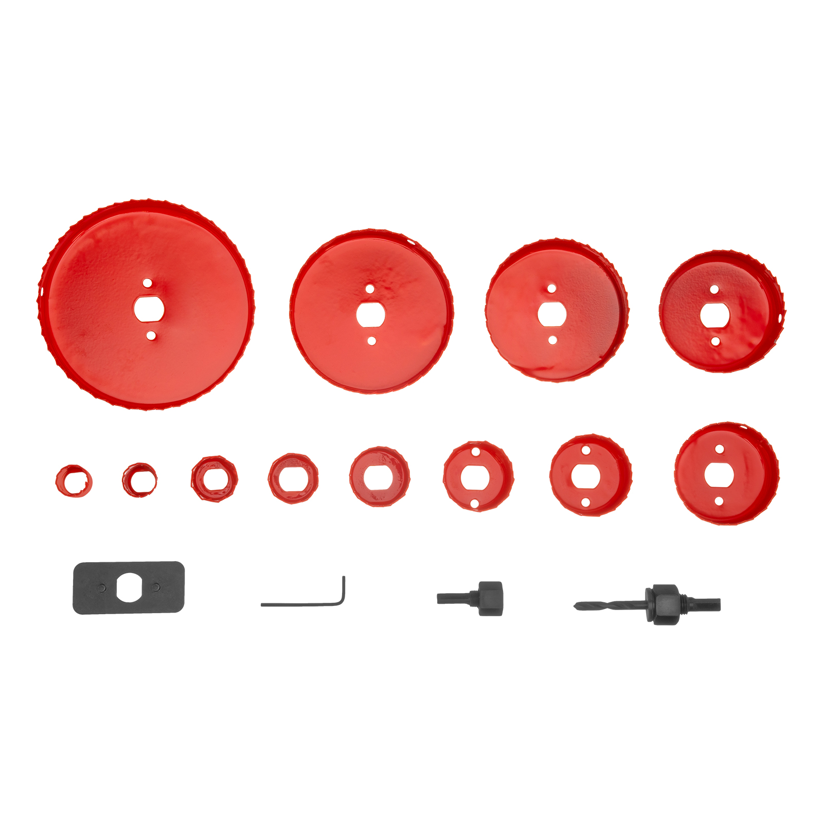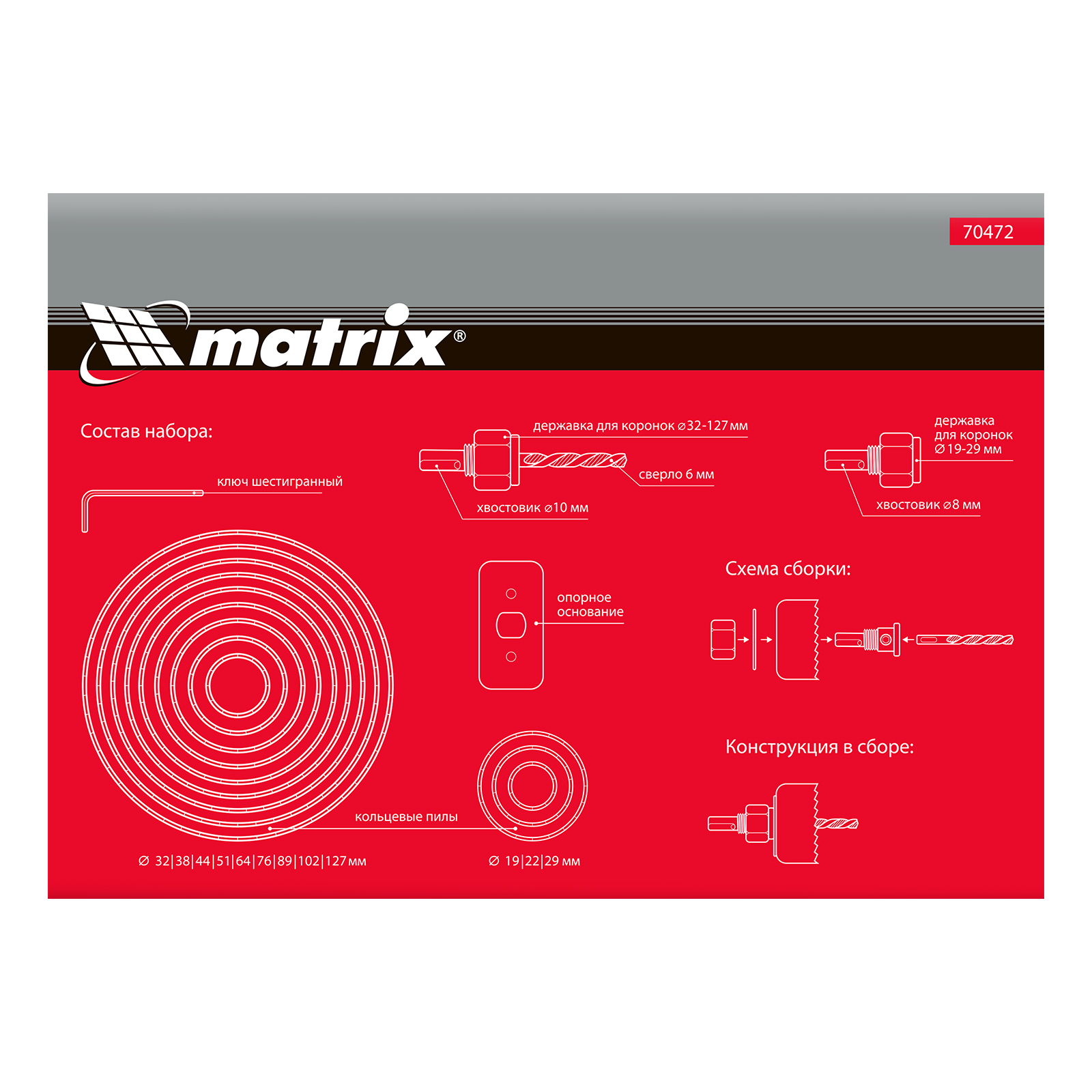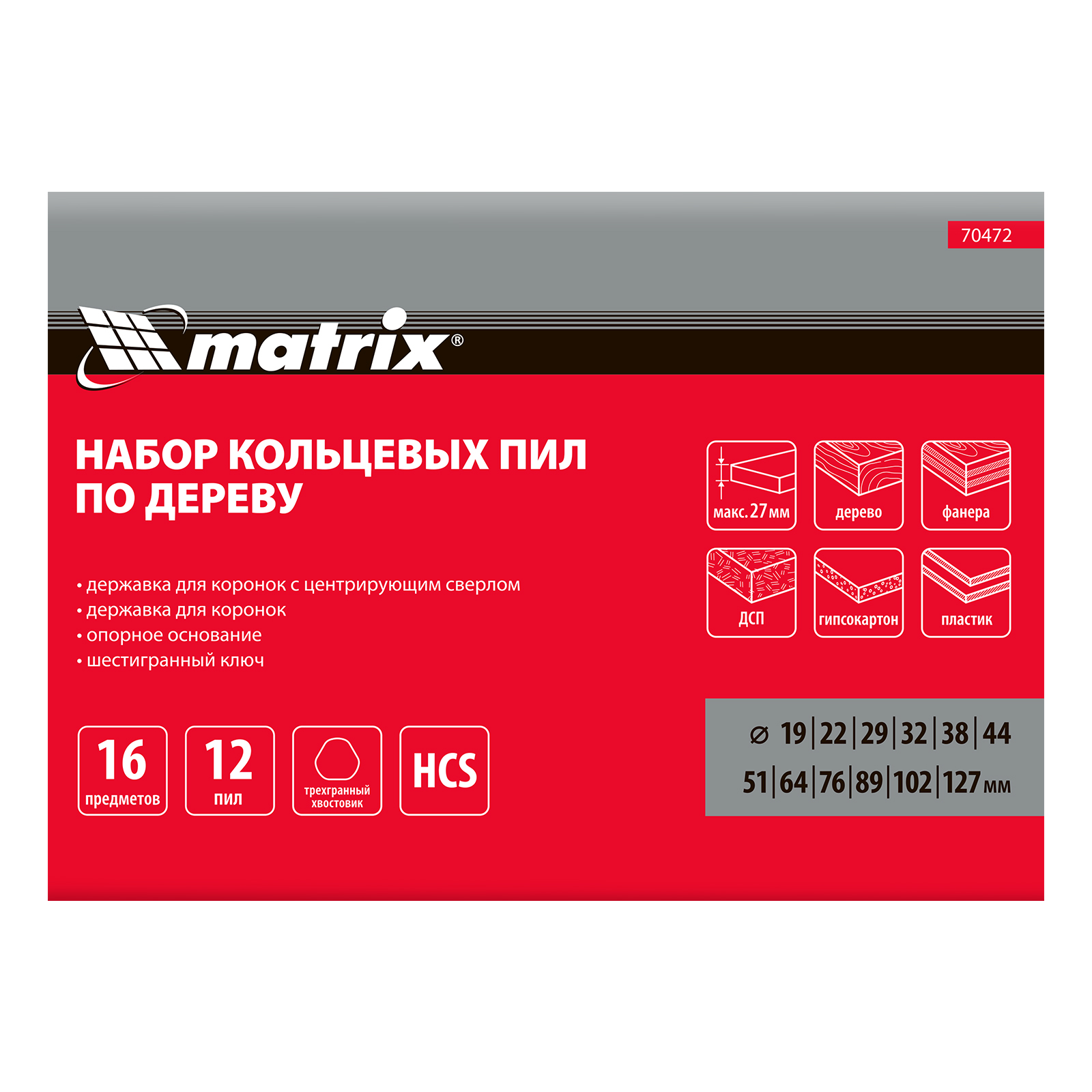 Набор кольцевых пил Matrix 70472 из 12 предметов предназначен для работы по дереву и включает в себя коронки диаметром 19-127 мм. Они устанавливаются на электродрель и служат для выпиливания круглых отверстий глубиной до 27 мм в древесине, фанере, гипсокартоне, ДСП, ДВП и пластике. Малая и большая державки облегчают установку пил разного диаметра. Набор пригодится во время ремонта — с его помощью можно прорезать отверстия под розетки, выключатели, светильники и трубы.