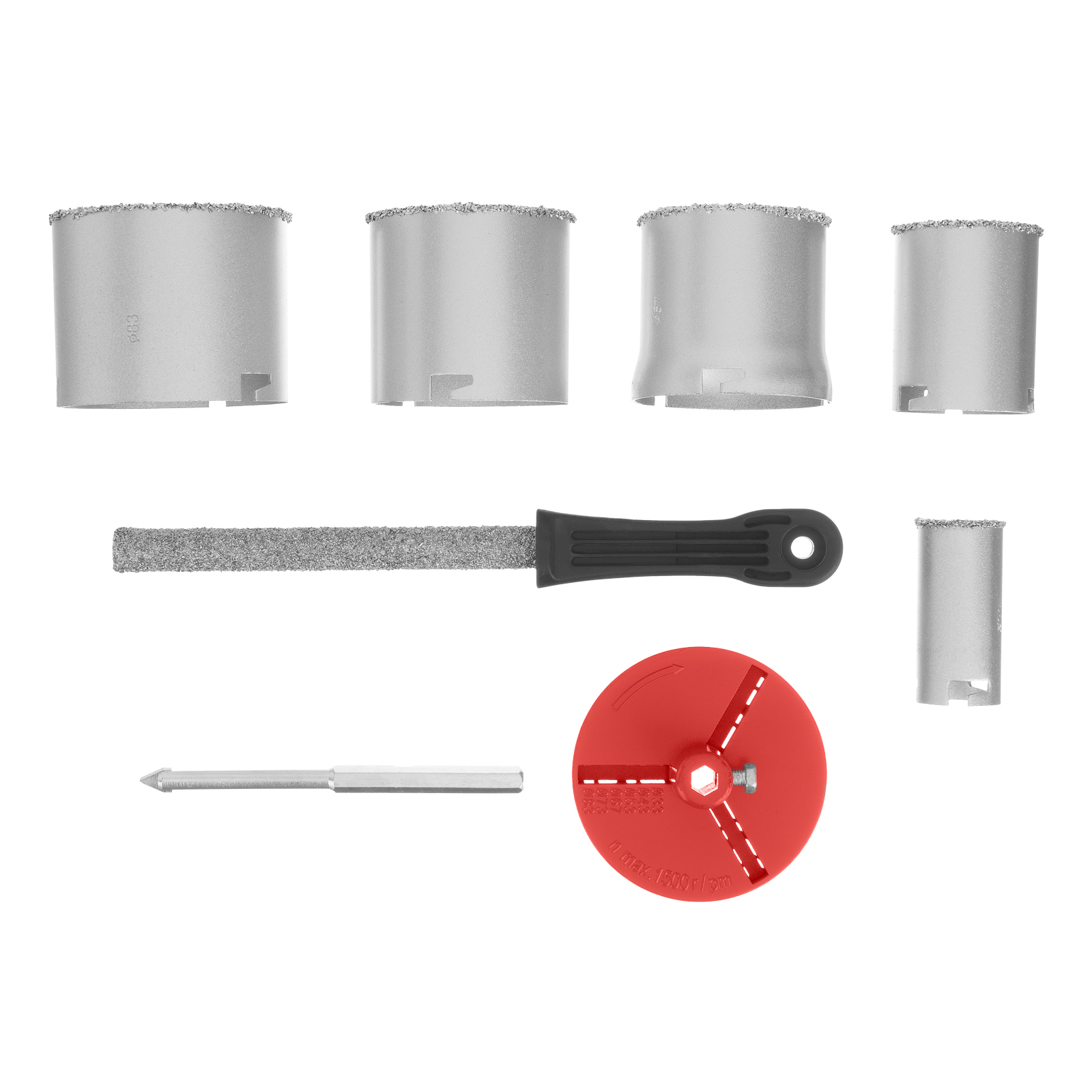 Прочность и долговечность — рабочие части коронок и напильника, а также твердосплавная пластина сверла имеют напыление из карбида вольфрама ВК6.