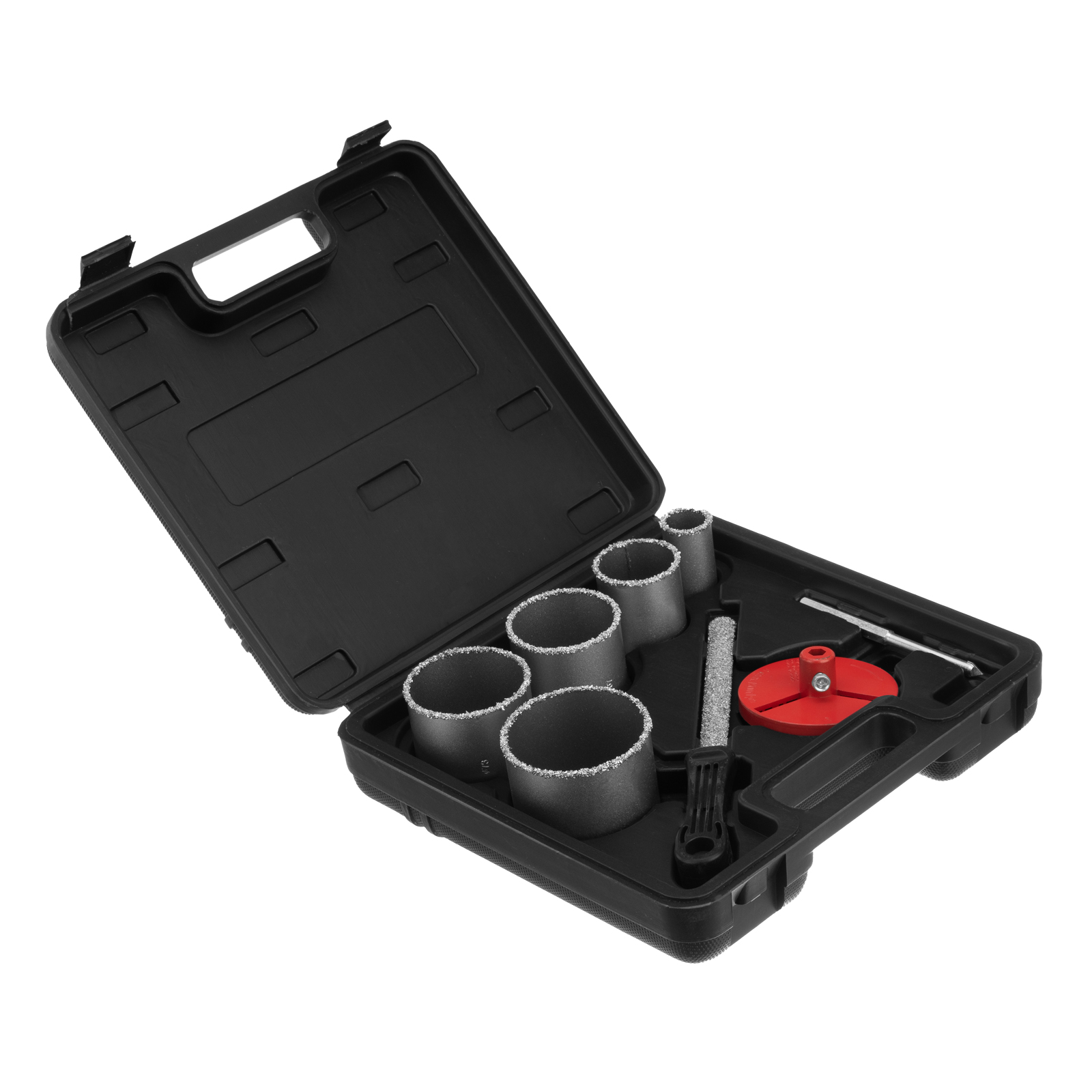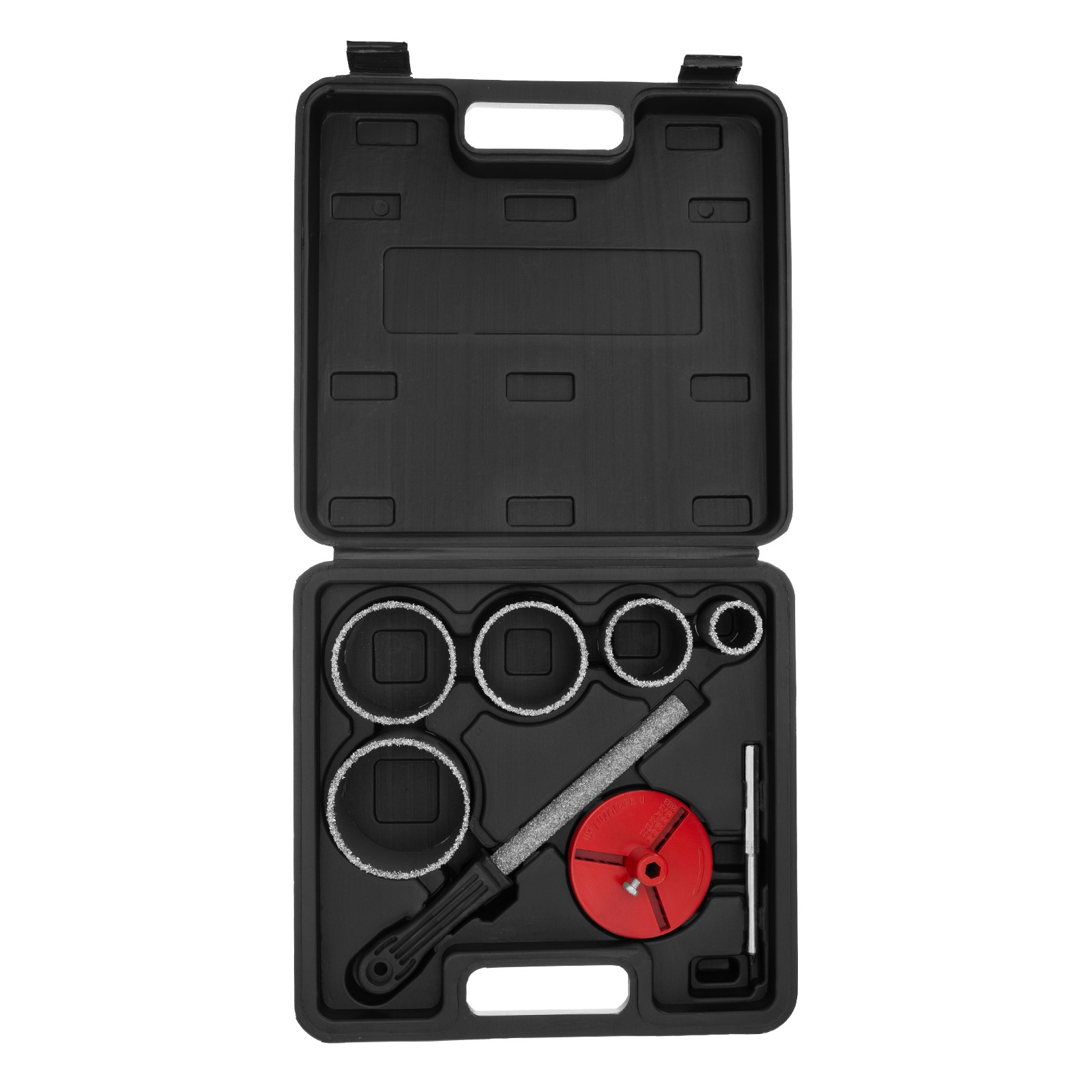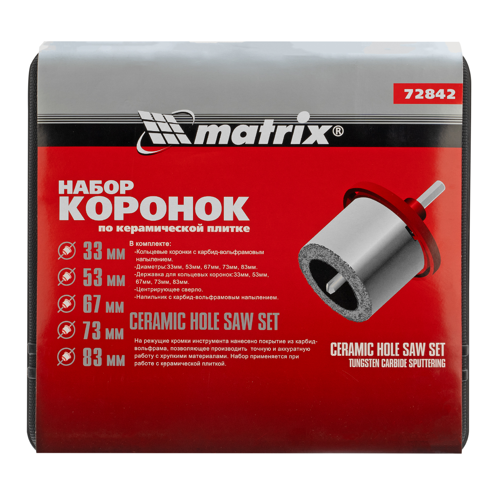 Набор коронок Matrix 72842 диаметром 33-53-67-73-83 мм, с 6-гранным хвостовиком и напильником, в пластиковом боксе, предназначен для сверления керамической плитки, кирпича, ячеистого бетона и пенобетона, газосиликата, гипсокартона. Оснастки устанавливаются на дрели и шуруповерты. Центрирующее сверло не допускает смещения коронок, обеспечивая точность работы. Рекомендуется использовать водяное охлаждение и работать в безударном режиме для продления срока службы коронок.