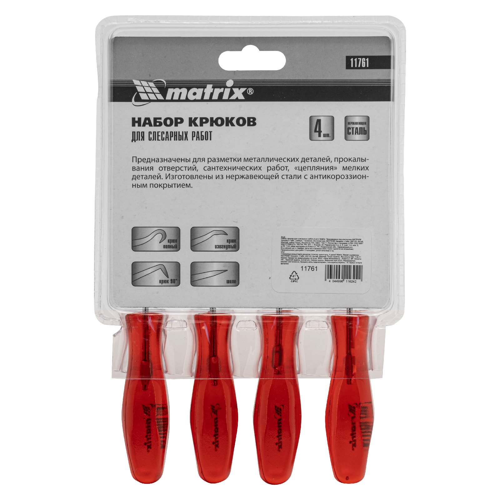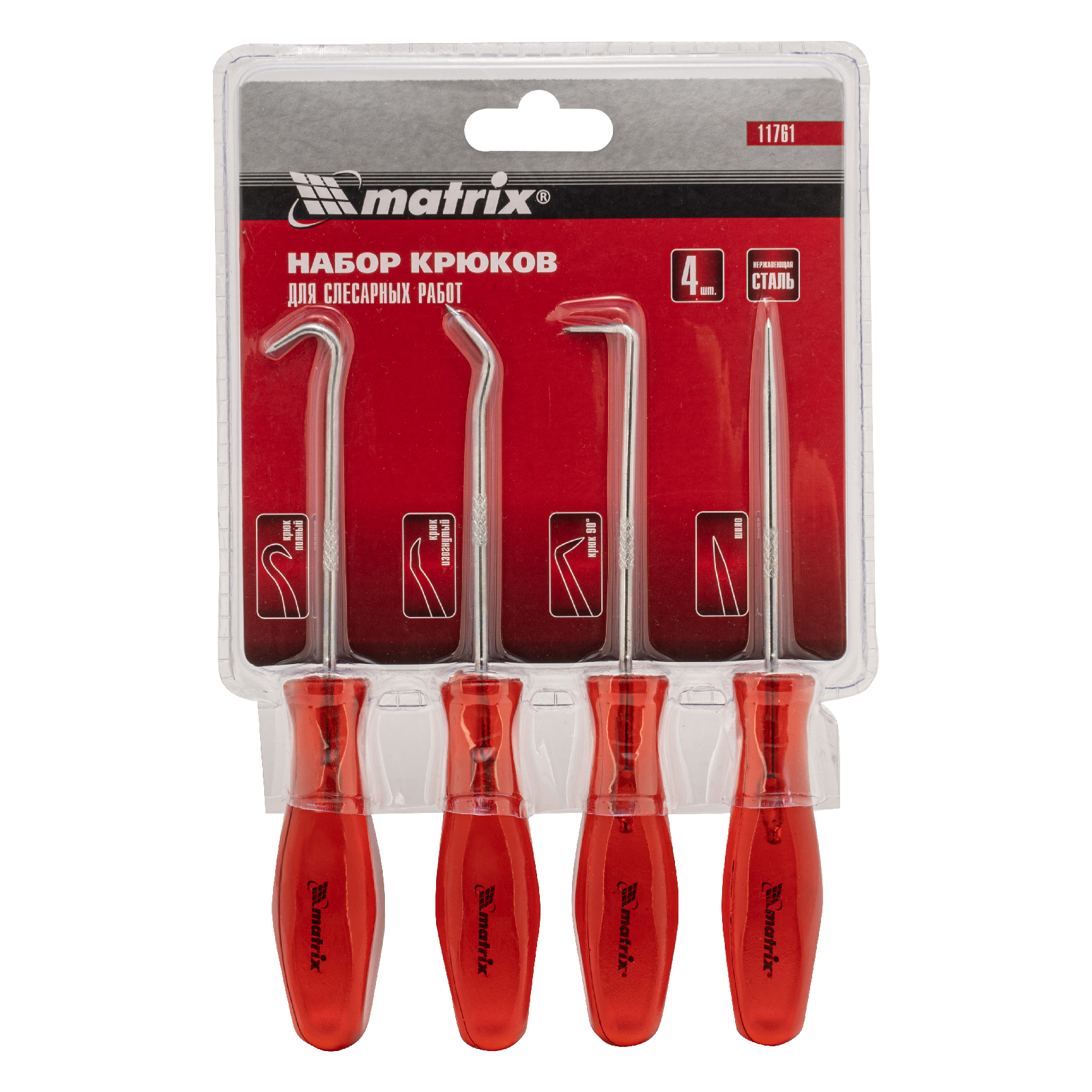 <p>Набор крюков для слесарных работ Matrix 11761 состоит из 4 предметов длиной 155 мм — шила, полного и углового крюков, а также крюка на 90°. Набор позволяет решать разнообразные бытовые и профессиональные задачи: снимать уплотнительные кольца и сальники, размечать металлические детали, проделывать отверстия в коже, дереве и других материалах. Инструменты будут полезны при выполнении строительных, слесарных и столярных работ, пригодятся в автосервисе, а также дома или на даче.</p><h2>Преимущества</h2><ul><li>Прочность — стальные стержни не погнутся и не сломаются в ходе эксплуатации.</li><li>Долговечность — хромированное покрытие защищает инструменты от коррозии.</li><li>Эргономичность — рукоятки изготовлены из прочного пластика и плотно лежат в руке, снижая усталость во время работы.</li></ul>
